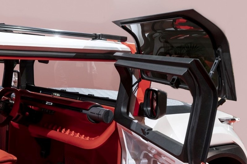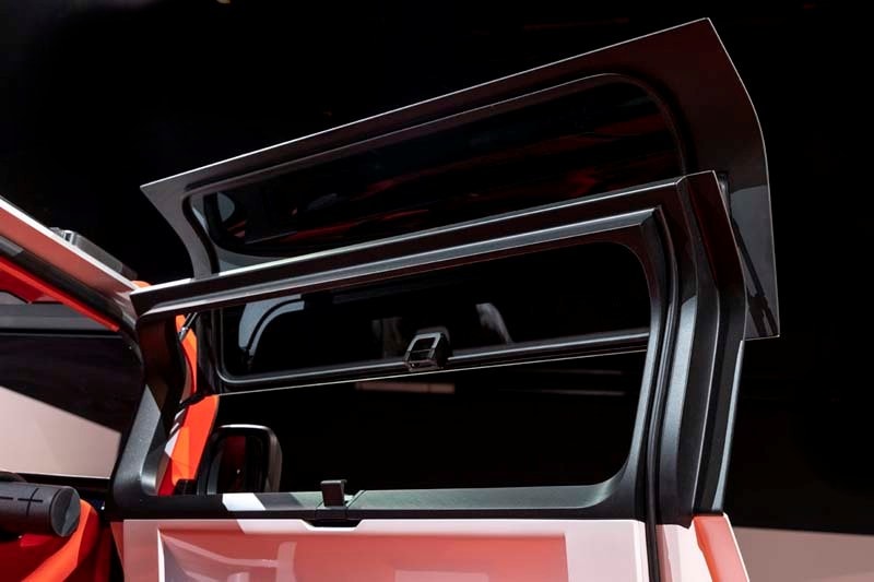 Pour des raisons de réduction de poids, de simplicité et de diminution des coûts, l’Oli abandonne les classiques vitres descendantes, préférant opter pour un système de fenêtre avant basculante. Un joli clin d’œil à la 2CV