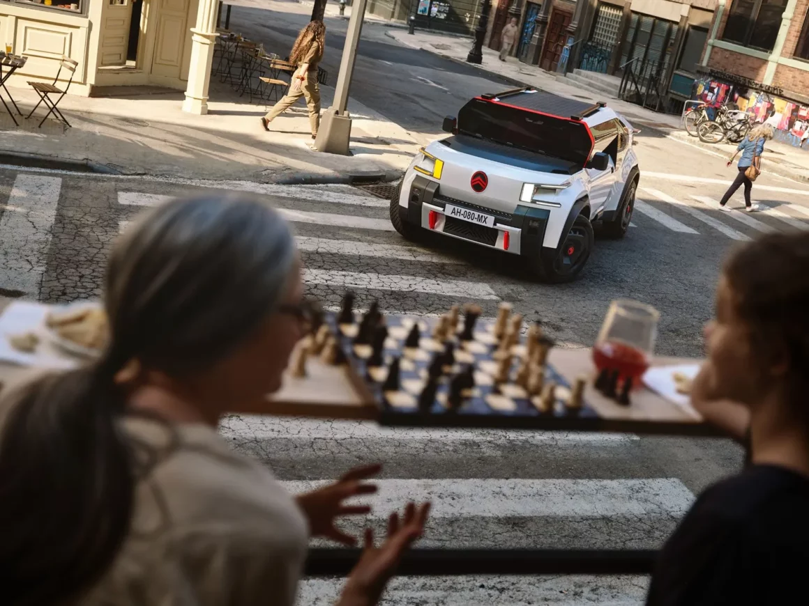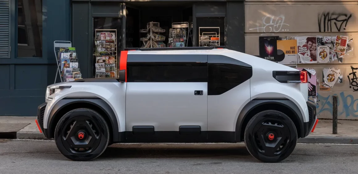 Celles_ci sont chaussées de nouveaux pneus plus durables (signés Goodyear et censés tenir 150 000 km). L’Oli ose un profil peu classique. Il joue à fond la carte du baroudeur robuste avec sa garde au sol surélevée et ses protections de carrosserie bien visibles (dont les arches de roue identiques et interchangeables aux quatre coins, afin de limiter les coûts). On retrouve même les fameux Airbump (coussinets de protection) si chers à Citroën, eux aussi réinterprétés en bas des portes avant (qui sont identiques à droite et à gauche).