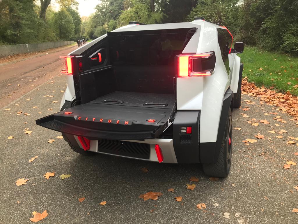 Le profil arrière est très plongeant et dépourvu de hayon. En effet, le plus inhabituel de sa conception est qu’au lieu d’un coffre conventionnel, il dispose d’un arrière façon pick-up disposant de nombreux points d’attache pour les accessoires ou la cargaison…