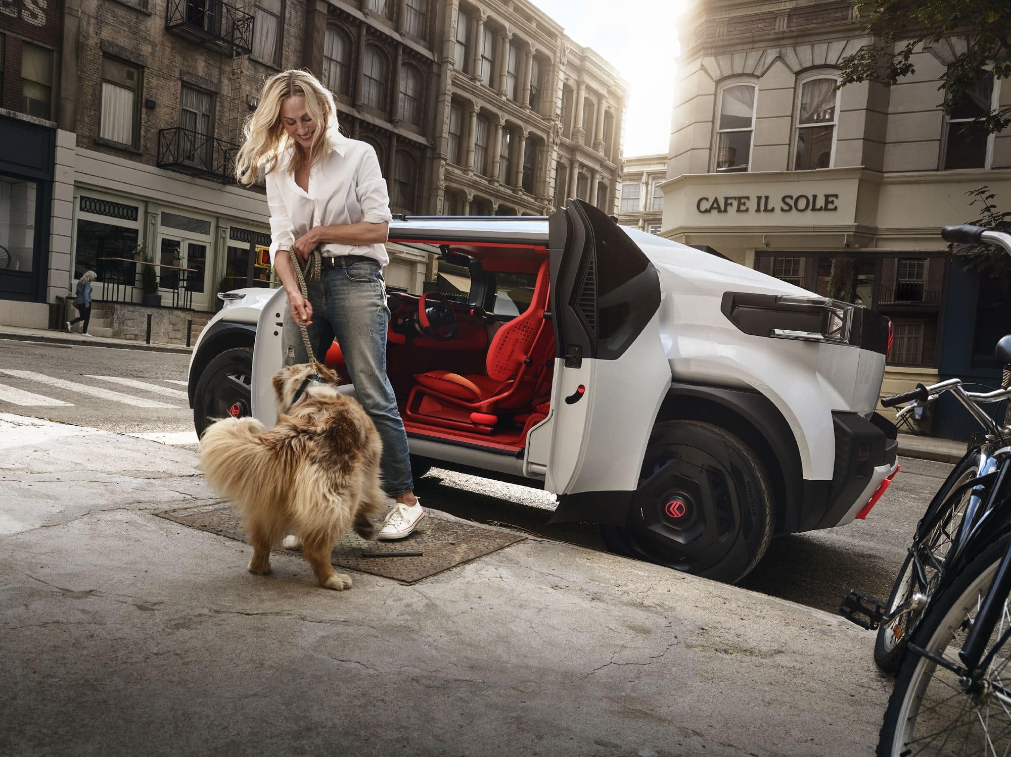 Celles_ci sont chaussées de nouveaux pneus plus durables (signés Goodyear et censés tenir 150 000 km). L’Oli ose un profil peu classique. Il joue à fond la carte du baroudeur robuste avec sa garde au sol surélevée et ses protections de carrosserie bien visibles (dont les arches de roue identiques et interchangeables aux quatre coins, afin de limiter les coûts). On retrouve même les fameux Airbump (coussinets de protection) si chers à Citroën, eux aussi réinterprétés en bas des portes avant (qui sont identiques à droite et à gauche).