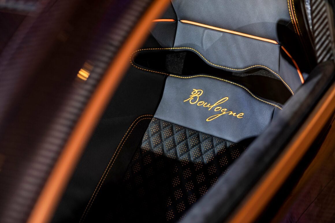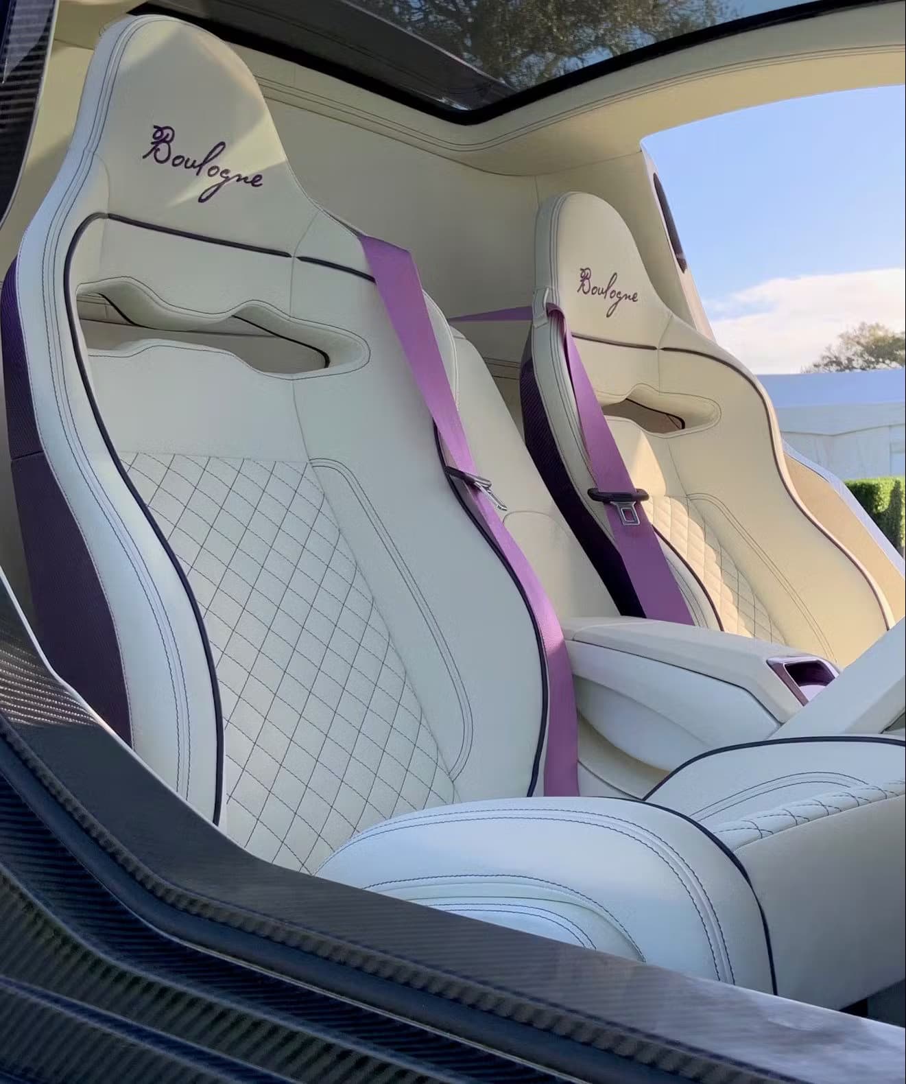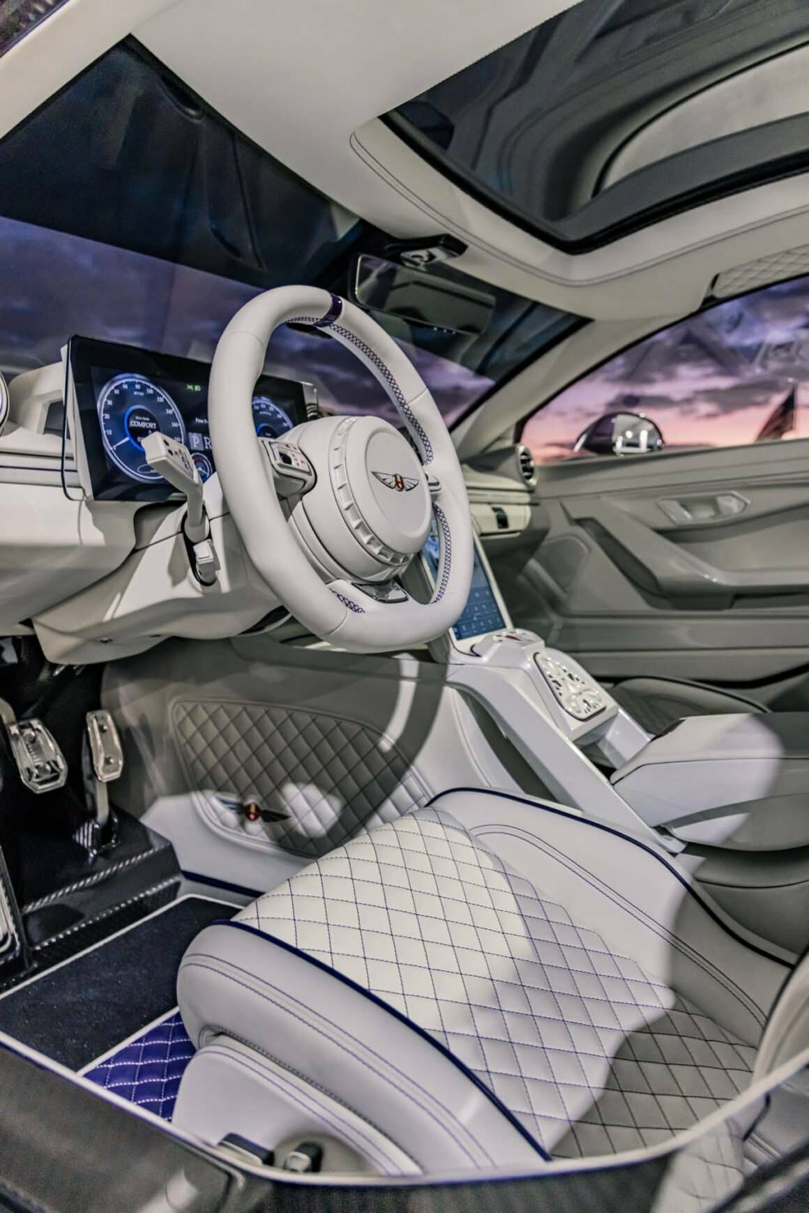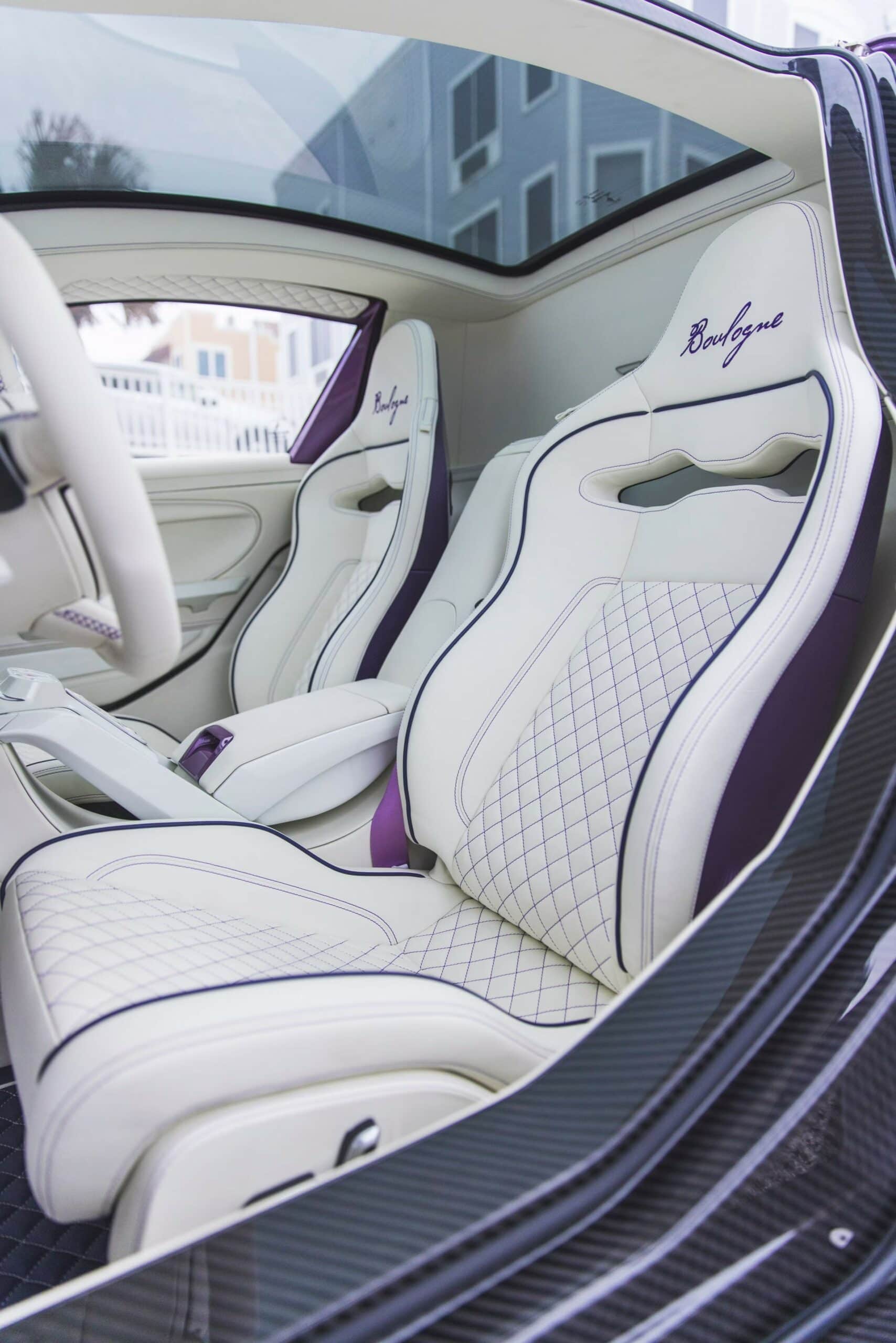 De plus, les écrous monoblocs des jantes en alliage d’aluminium poli (19 pouces à l’avant, 20 pouces à l’arrière) sont peints pour correspondre à la couleur de la carrosserie dont ‘intérieur est recouvert de cuir “Birkigt White” et le mot “Boulogne” est brodé sur les appuie-tête… Le chef de projet, Fabiano Ferreira, m’a affirmé que la voiture avait été entièrement conçue et construite à partir de zéro en tant que version plus rapide et plus puissante de la Carmen EV 2019.