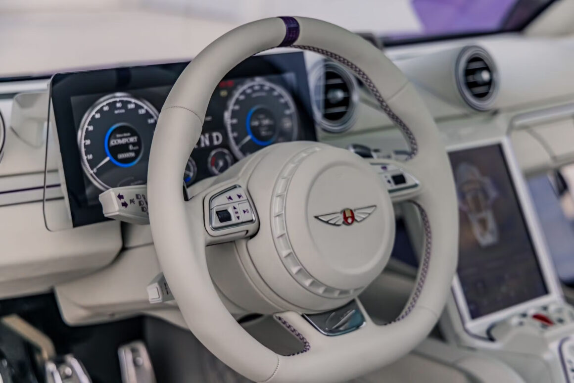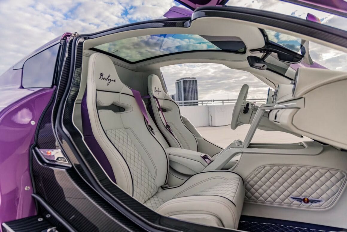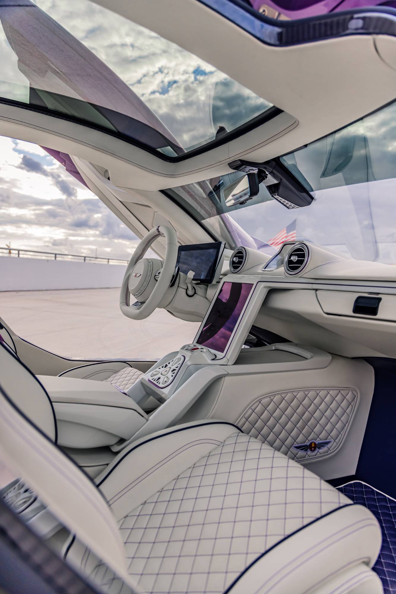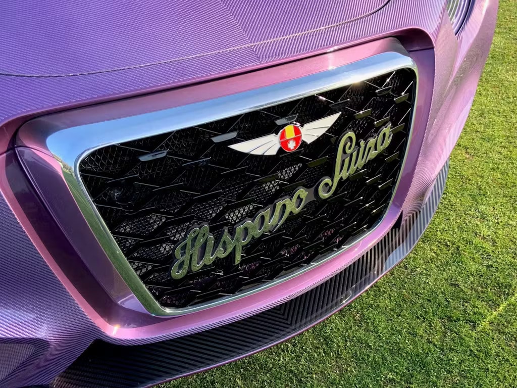La fibre de carbone étant noire, l’Hispano Suiza Boulogne a nécessité une couche d’Alutex, un composite contenant de la résine époxy, pour réussir à créer la couleur demandée par Fux. Cela lui est exclusif ; vous ne le verrez sur rien d’autre construit par Hispano Suiza. La finition “Ocean Song Rose” est combinée avec des détails de design “Birkigt White”. La calandre de la voiture, avec le logo Hispano Suiza, est finie dans un noir brillant contrastant…