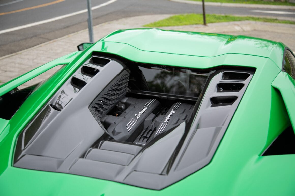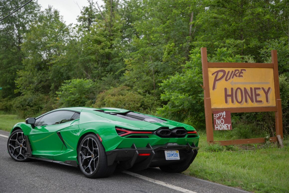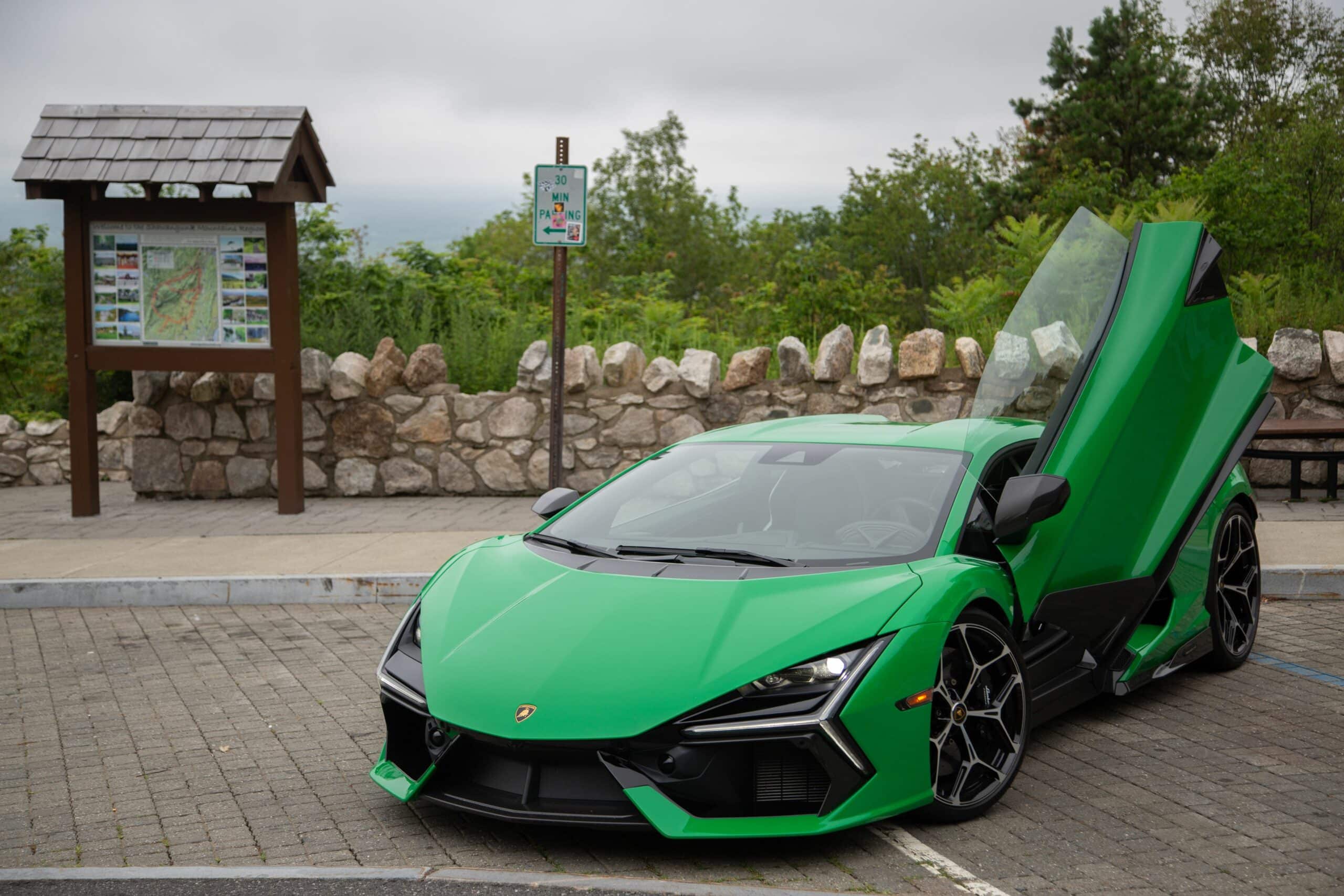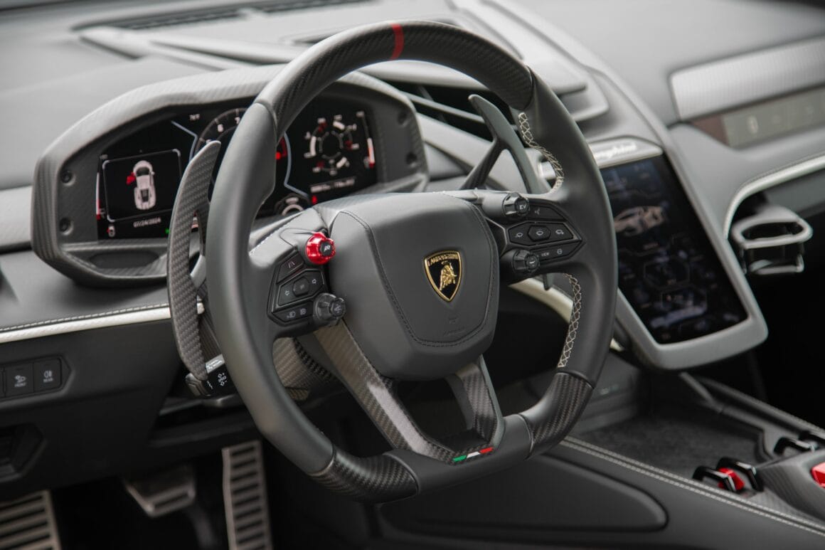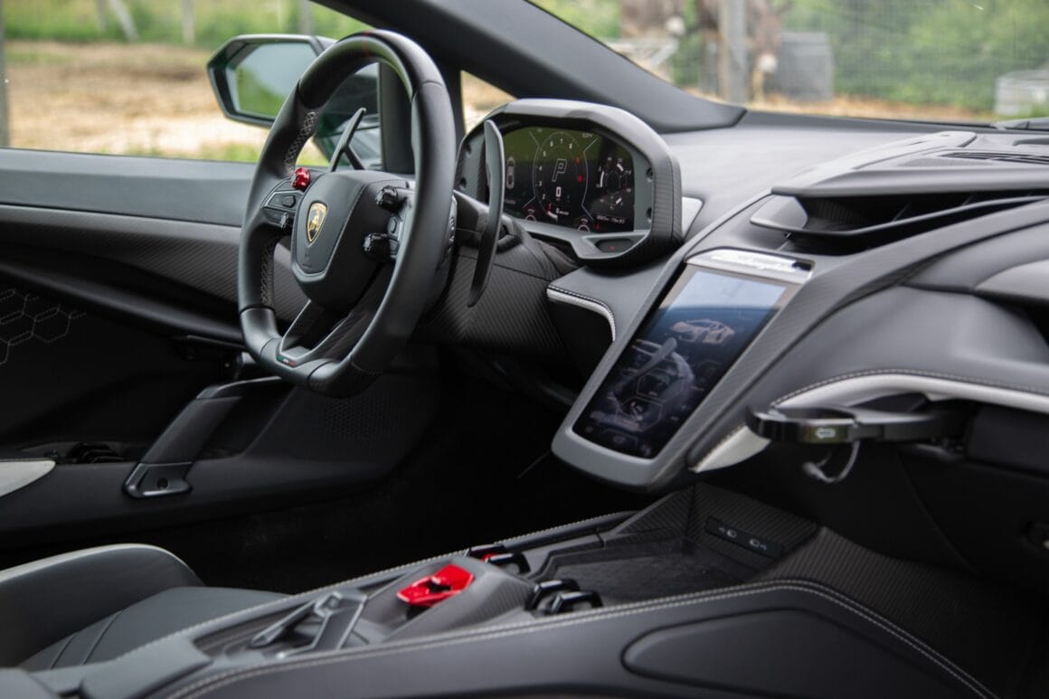 La Revuelto est remarquablement audacieuse, indéniablement rapide et tout à fait digne d’une affiche sur le mur de la chambrette d’un adolescent. Certes, à mes yeux, l’avant ressemble presque à une McLaren 750S sous certains angles, du moins dans les voitures peintes de couleurs plus foncées… Les prises d’air et les contours noirs des phares s’estompent davantage dans la carrosserie dans ces cas. Les teintes plus vives, comme l’audacieuse teinte Verde Viper conviennent mieux, à la fois pour mettre en valeur les lignes sauvages du design et pour attirer l’attention, ce qui, avouons-le, n’est jamais un non-facteur dans l’achat d’une Lambo V-12. Le meilleur angle de la voiture, est la poupe, où les textures aux multiples facettes du compartiment moteur, les hanches bombées au-dessus des immenses roues arrière, le diffuseur tranchant et les minces feux arrière à LED coulent tous vers les tuyaux d’échappement de postcombustion qui crachent de l’air chaud comme un sèche-cheveux même au ralenti. Bien sûr, comme c’est le cas pour la Miura, la Revuelto reste parfaitement imparfaite. La vue vers la poupe est égale aux fentes horizontales sur le côté et devant vous. L’entrée et la sortie restent des épreuves qualificatives pour être contortioniste dans un cirque. Le système d’infodivertissement tout en verre est exaspérant, en particulier les commandes stéréo complexes. Les choix de réglages du volume se font via un curseur caché qui apparaît occasionnellement à l’écran…