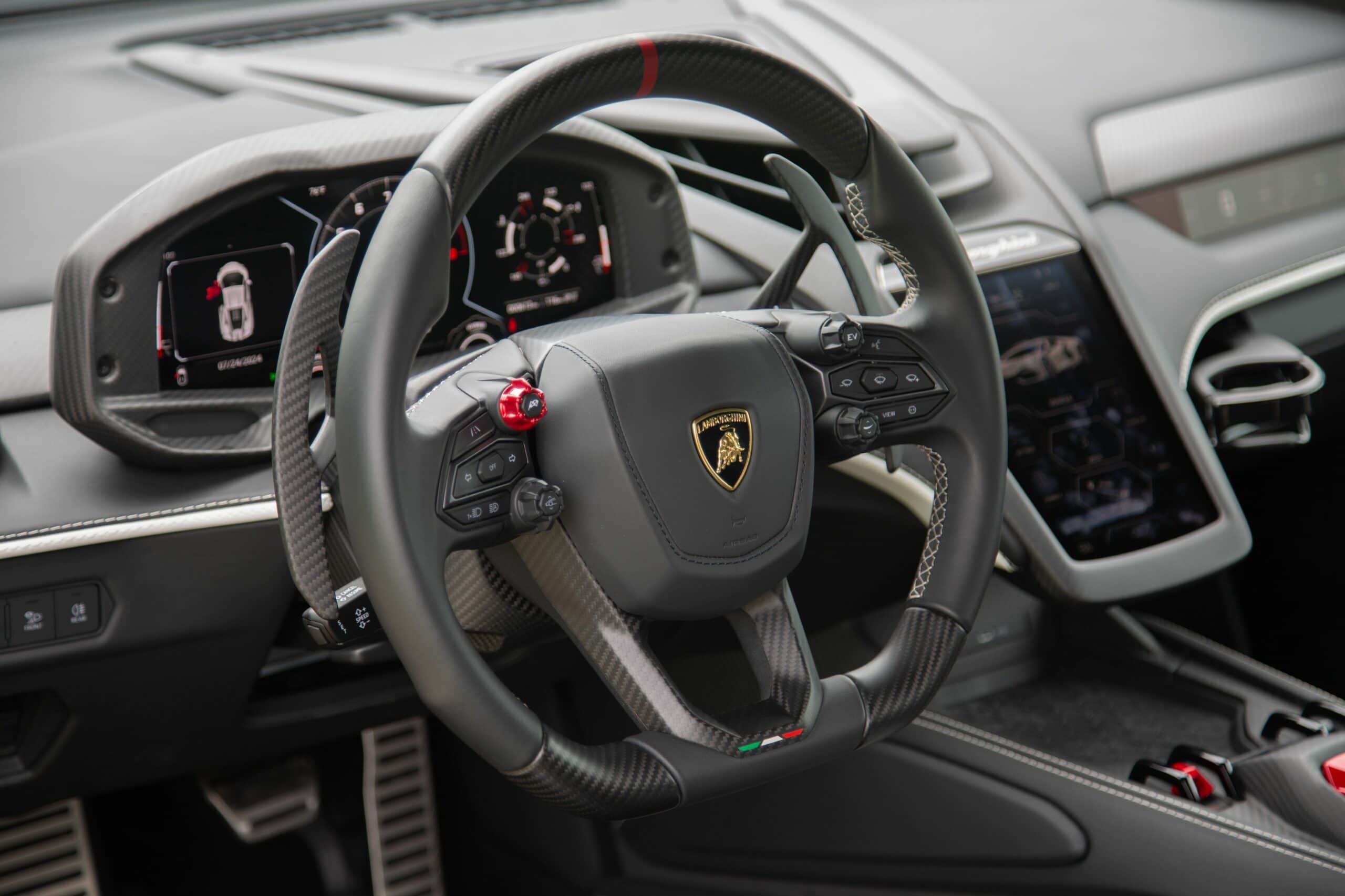 La solution est simple : conduire en première et deuxième vitesses autant que possible. Après tout, la puissance de pointe de 813 chevaux n’apparaît qu’à 9.250 tr/min. La Revuelto est plus facile à conduire que l’Aventador, à plus d’un titre. Les moteurs électriques donnent au groupe motopropulseur une plus grande flexibilité, plutôt que de lui donner un coup de poing semblable à celui d’un véhicule électrique, ils ne font que remplir la courbe de couple à basse altitude, laissant le V-12 se concentrer sur la fourniture de plus en plus de puissance à mesure que le régime augmente. Le résultat n’est rien de moins que “chouette”... C’est implacablement puissant mais ça reste maniable, avec une puissance fluide qui m’a laissé reconnaissant à Lambo, coincé avec une aspiration naturelle chaque fois que j’appuyais sur l’accélérateur. La boîte de vitesses à double embrayage à huit rapports est une grande amélioration par rapport à la boîte manuelle séquentielle de l’ancienne voiture, qui offrait des changements de vitesse wham-bam-merci-madame, que vous le vouliez ou non ; la nouvelle transmission est tout à fait ravie d’offrir des changements de vitesse en douceur en mode automatique si vous vous sentez paresseux, ou des changements rapides comme un pétard avec les palettes lorsque vous passez à la Corsa. La sensation de direction est lourde mais solide, avec une quantité appréciable de retour d’information pour une voiture moderne à traction intégrale avec direction assistée électrique et pneus larges.
