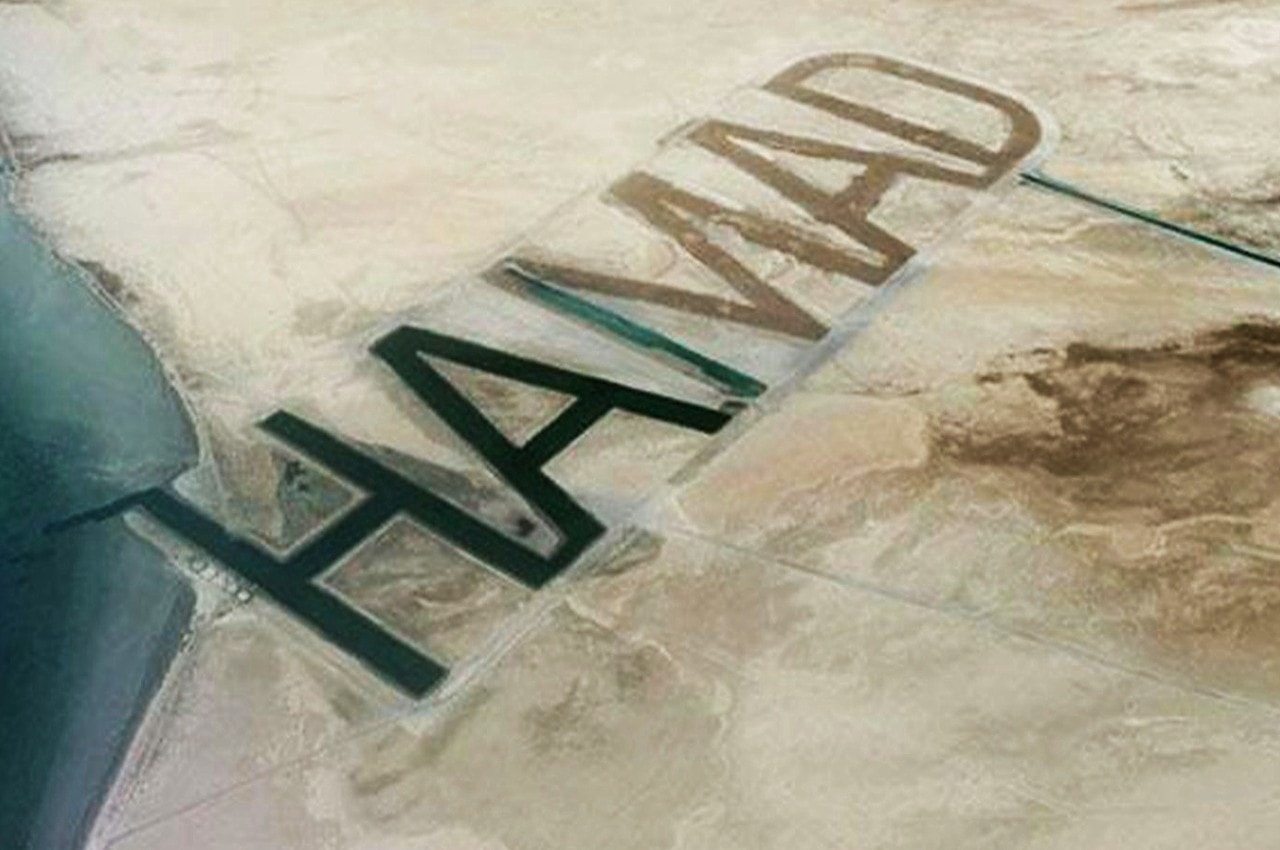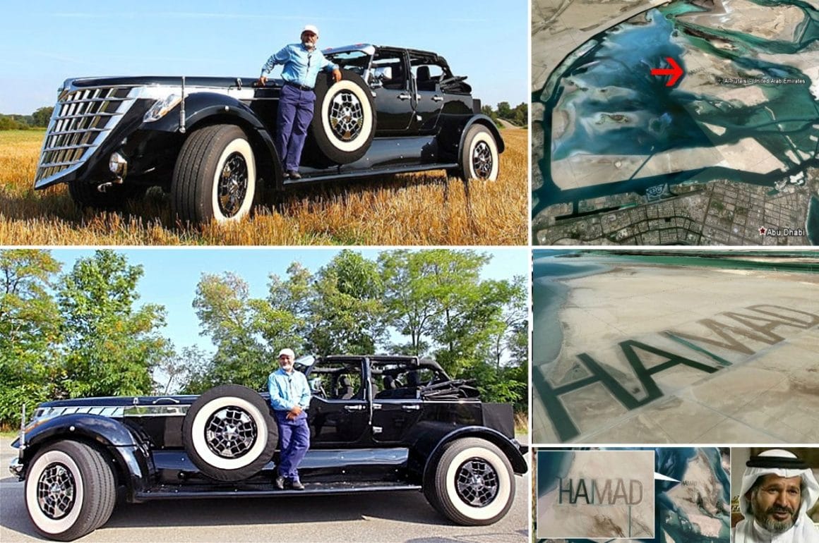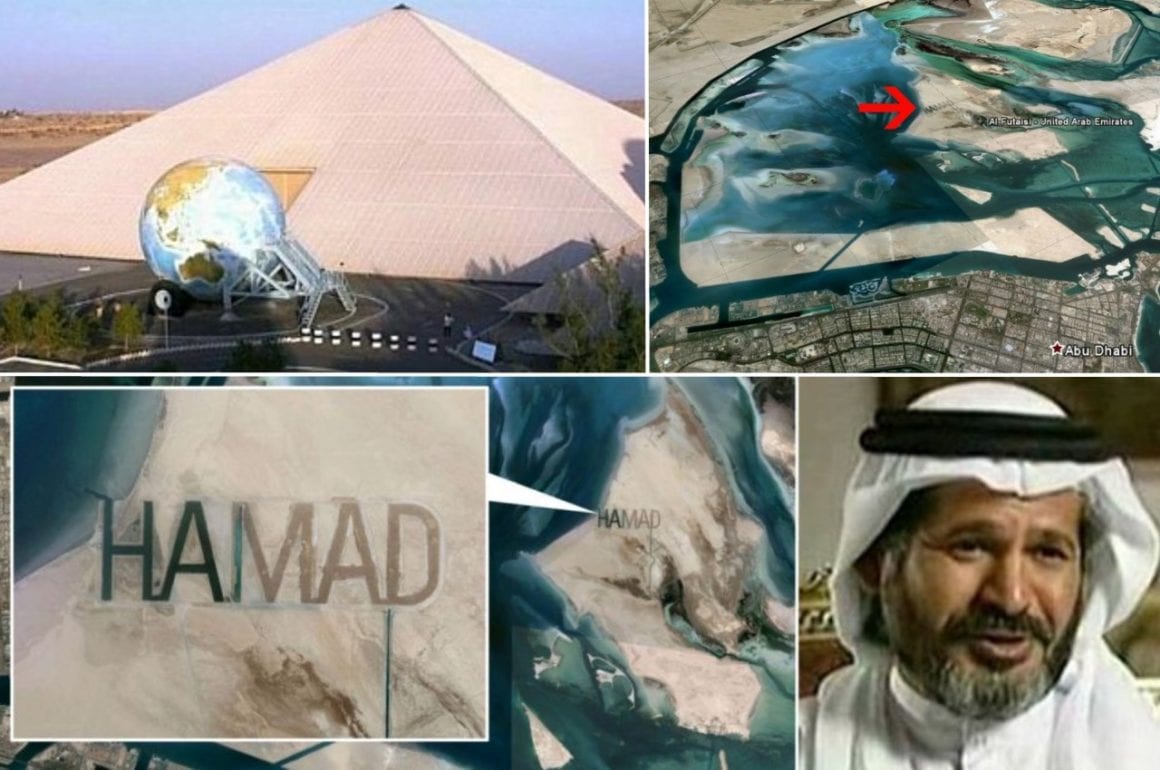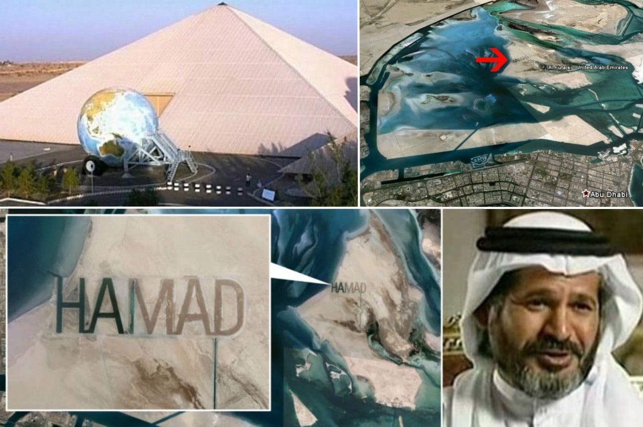 Il voulait que son nom soit visible de l’espace…, donc, pour réaliser ce rêve, Son Altesse, le très bien aimé et bienheureux Sheikh Hamad Ben Hamdane Al Nahyane, 69 ans (comme moi), a embauché une centaine de travailleurs pour graver-creuser son nom “HAMAD”, en lettres gigantesques (1km de haut, 3 km de large) sur l’île Al Futaisi, dont il est propriétaire à Abu Dhabi, aux Emirats Arabes Unis.