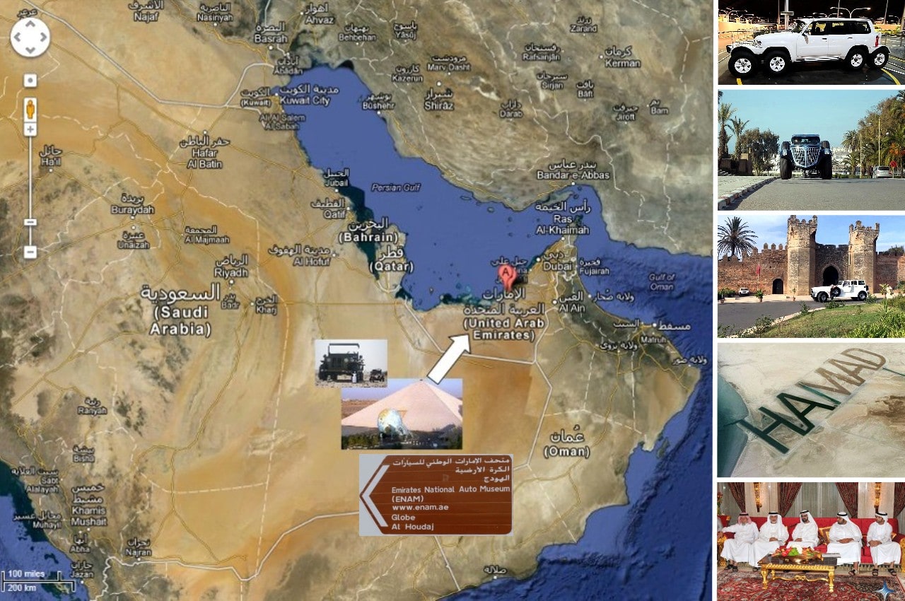Hamad est aussi connu là-bas, comme le “Rainbow Sheikh”, car il y possède 200 voitures, dont sept Mercedes 500 SEL peintes en différentes couleurs de l’arc-en-ciel, qu’il stocke dans une pyramide, en compagnie de 4×4 transformés en folies extravagantes à six ou 8 roues (tous rutilants et loufoques)…, des engins hybrides, croisements de jeep’s et de camions…, pour ne pas risquer que le nom “HAMAD” soit emportée par l’océan, les lettres forment réellement des cours d’eau qui absorbent les marées envahissantes.