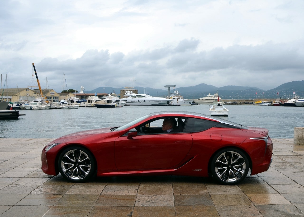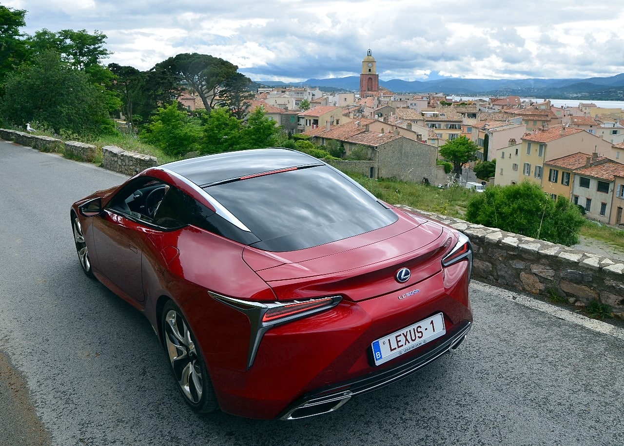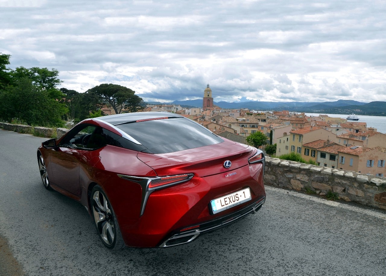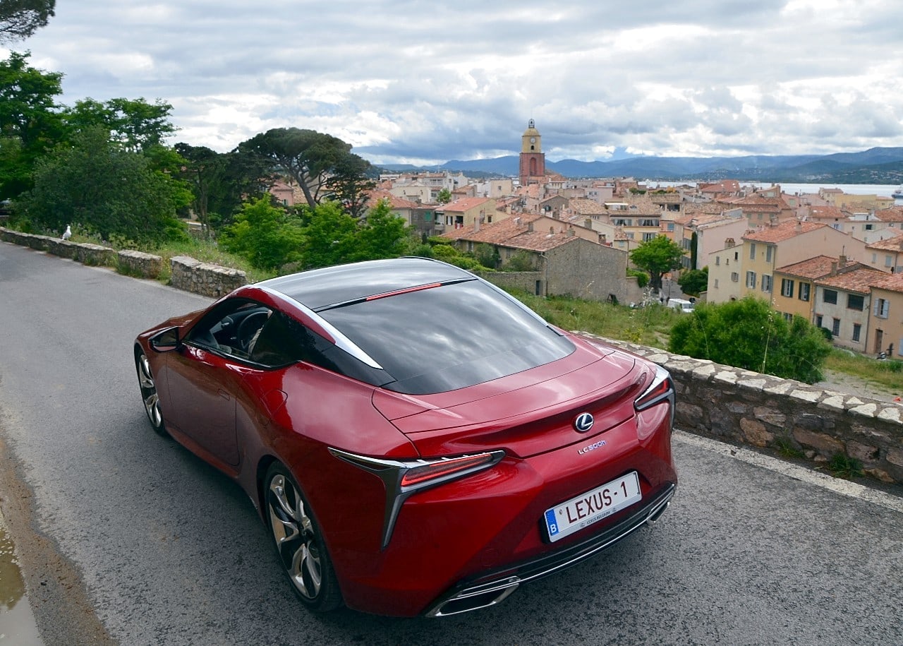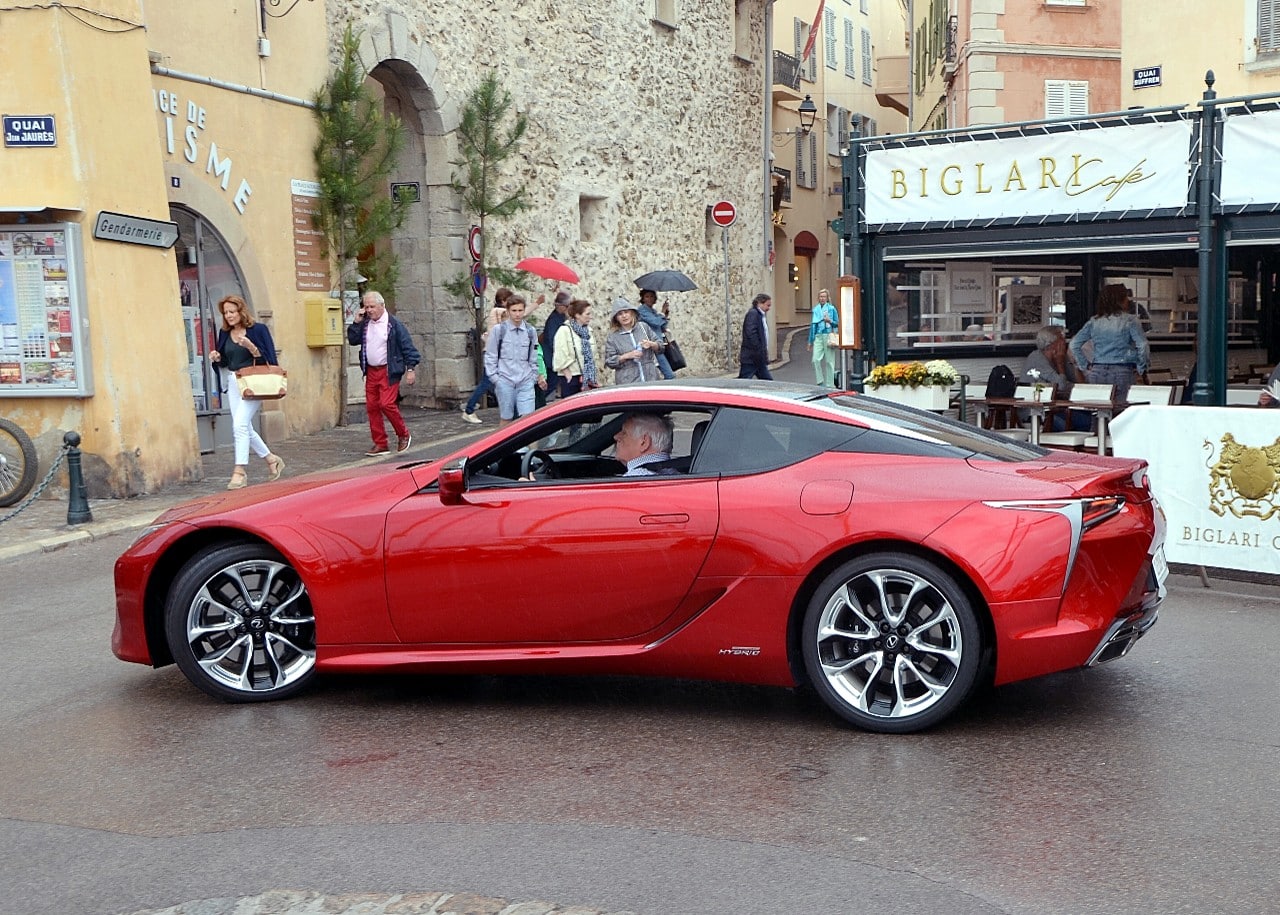 Silencieusement, avec la sensation de véritablement glisser sur un nuage, propulsé uniquement par son bloc électrique, le coupé Lexus LC500h, superbement habillé d’une belle couleur rouge cerise-brun cuivré, se glisse furtivement dans les ruelles étroites de Saint-Tropez, direction le port.