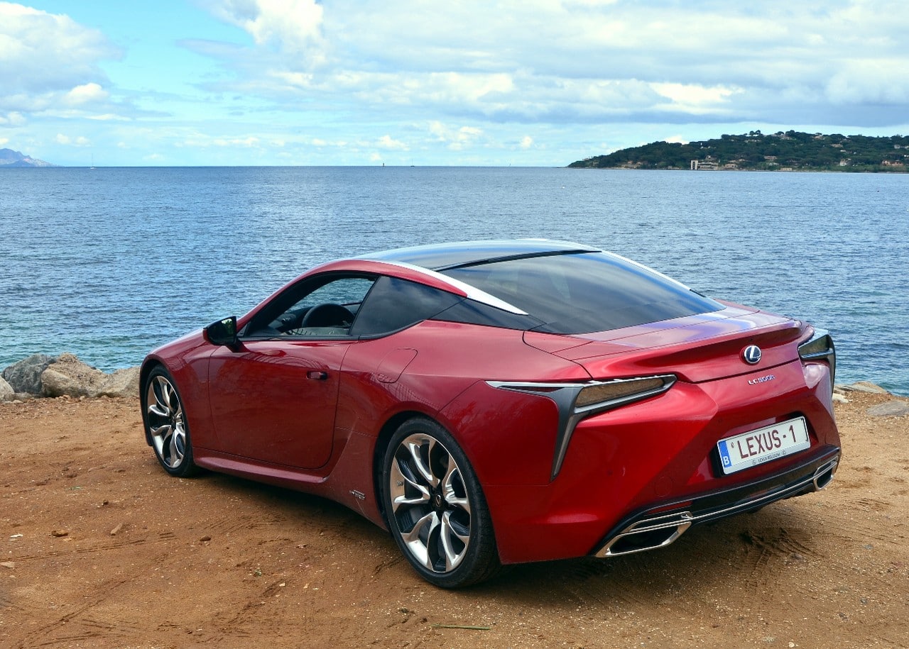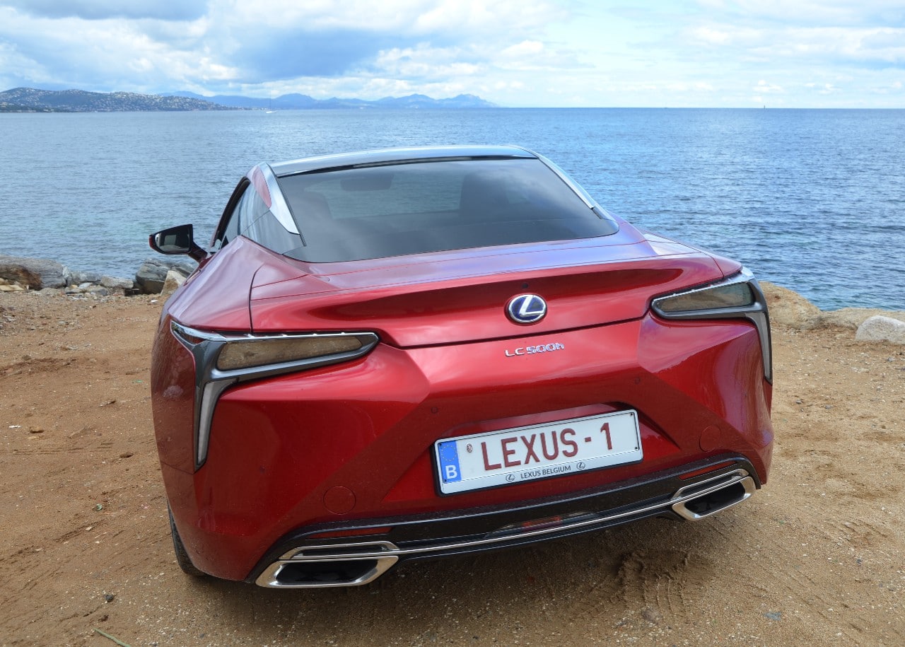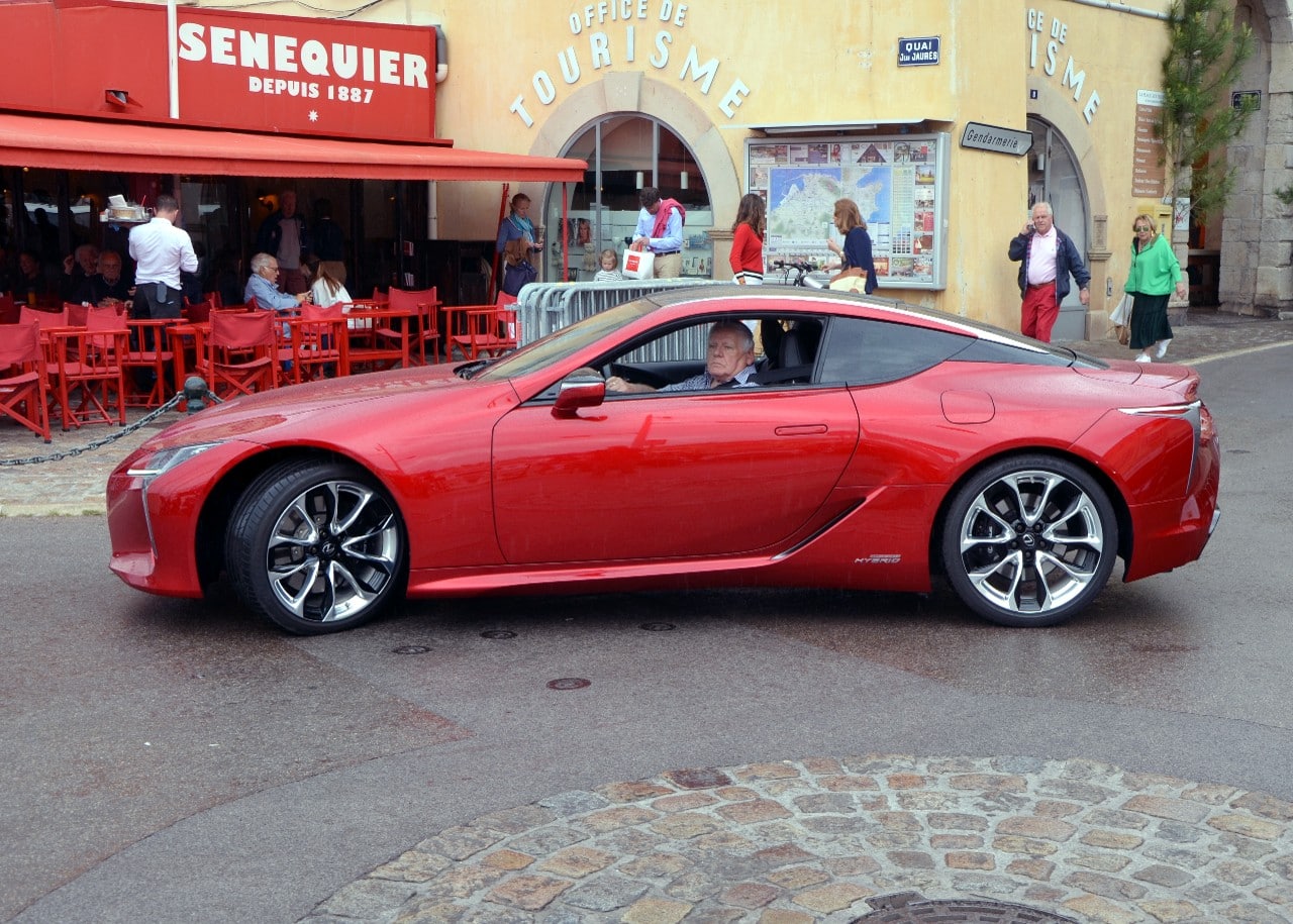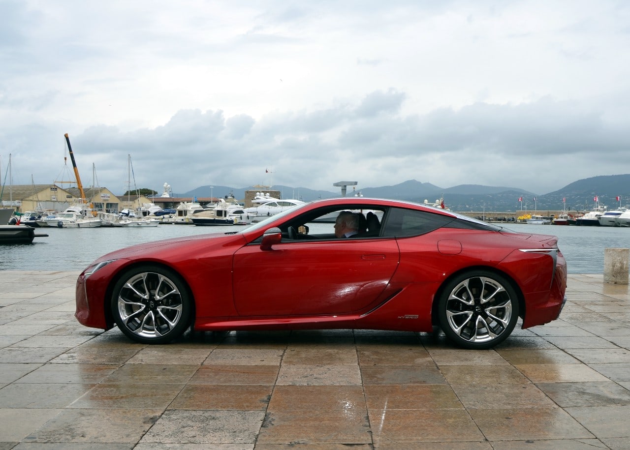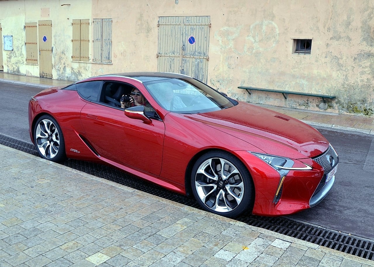 Silencieusement, avec la sensation de véritablement glisser sur un nuage, propulsé uniquement par son bloc électrique, le coupé Lexus LC500h, superbement habillé d’une belle couleur rouge cerise-brun cuivré, se glisse furtivement dans les ruelles étroites de Saint-Tropez, direction le port.