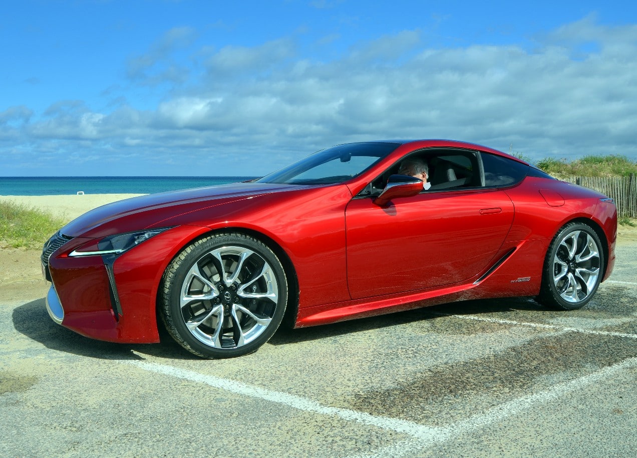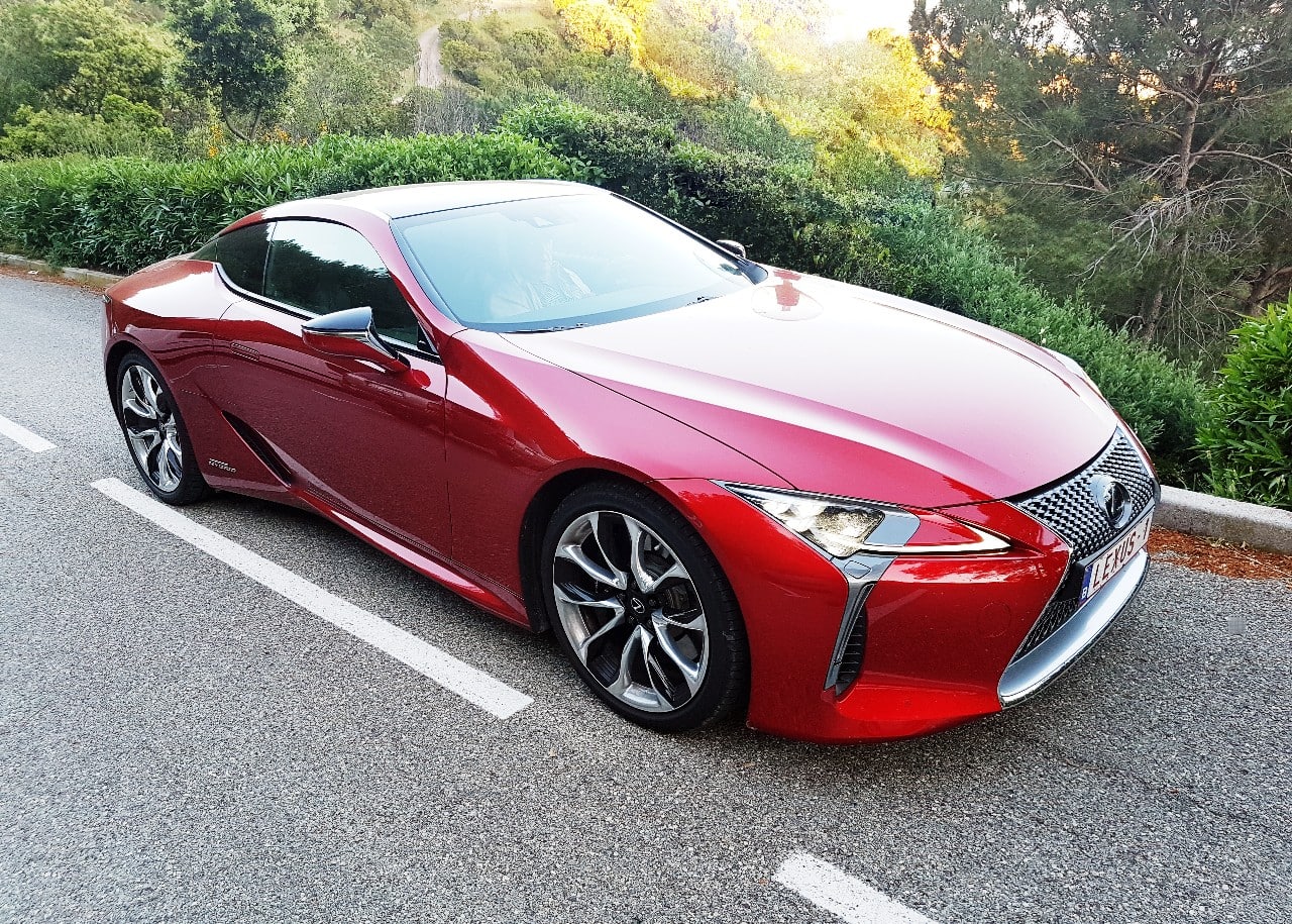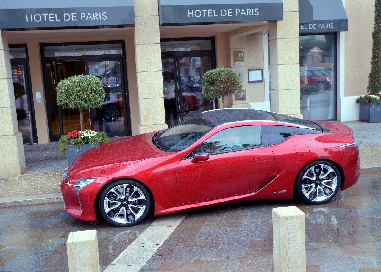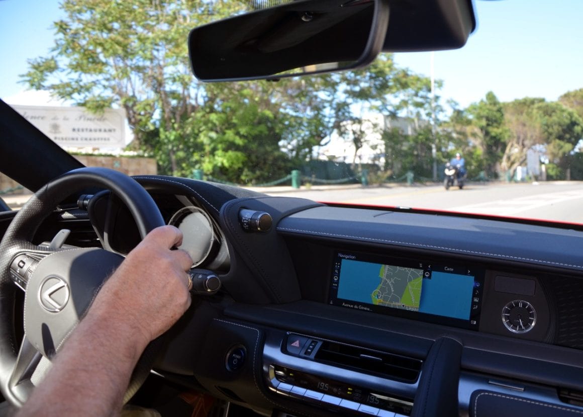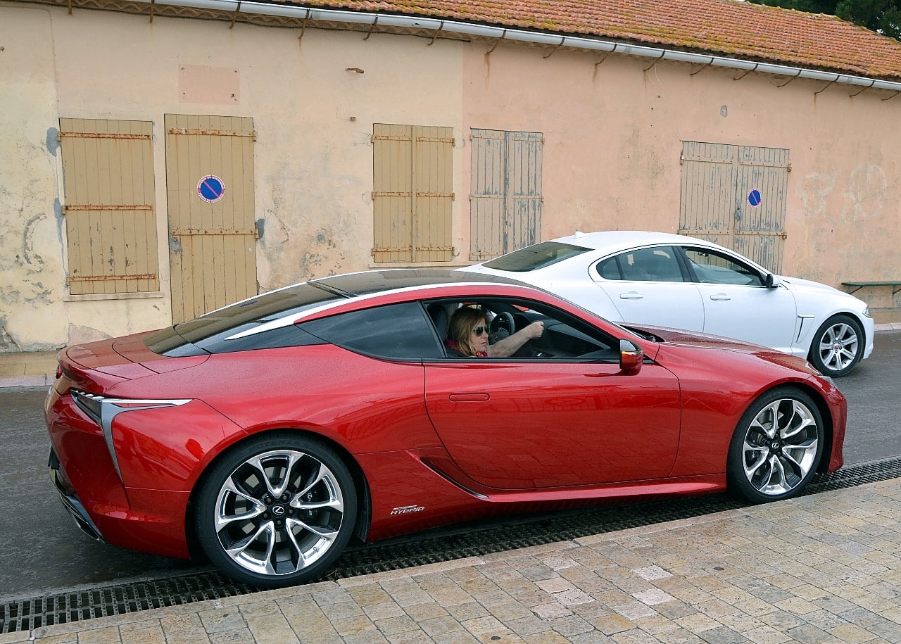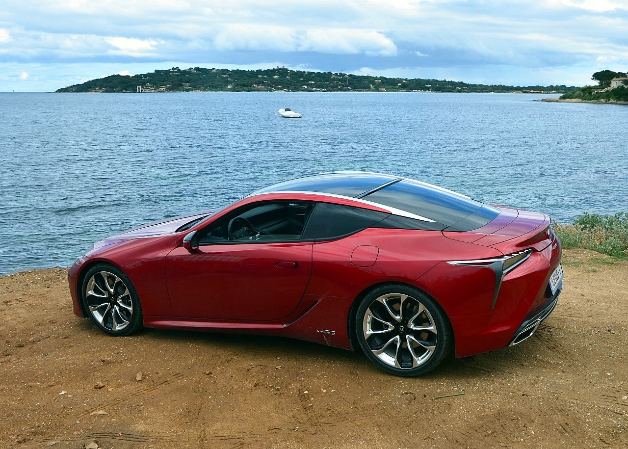 Silencieusement, avec la sensation de véritablement glisser sur un nuage, propulsé uniquement par son bloc électrique, le coupé Lexus LC500h, superbement habillé d’une belle couleur rouge cerise-brun cuivré, se glisse furtivement dans les ruelles étroites de Saint-Tropez, direction le port.