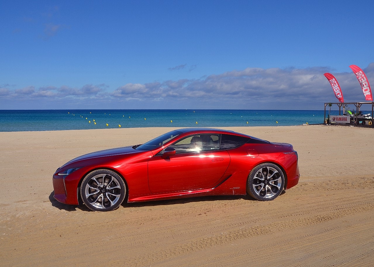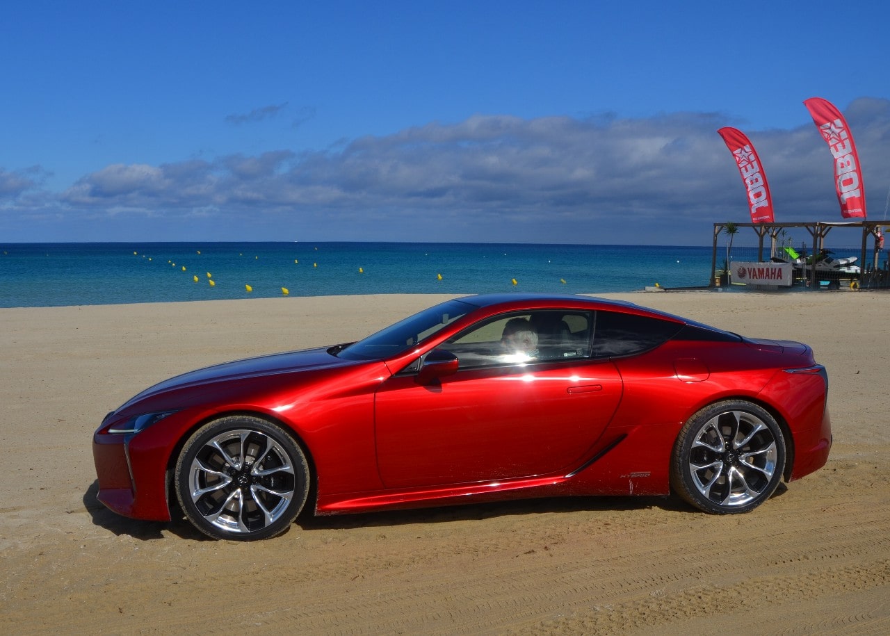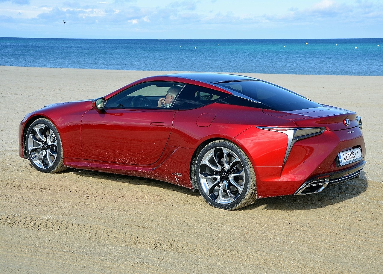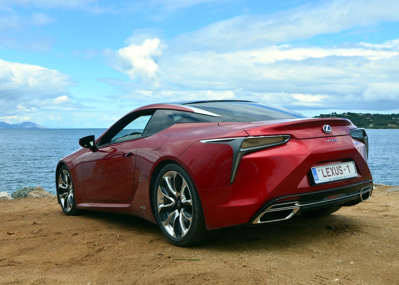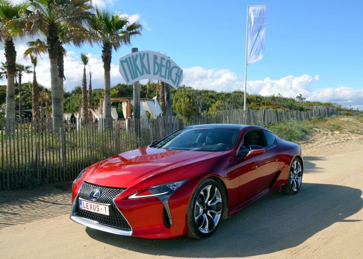 Silencieusement, avec la sensation de véritablement glisser sur un nuage, propulsé uniquement par son bloc électrique, le coupé Lexus LC500h, superbement habillé d’une belle couleur rouge cerise-brun cuivré, se glisse furtivement dans les ruelles étroites de Saint-Tropez, direction le port.