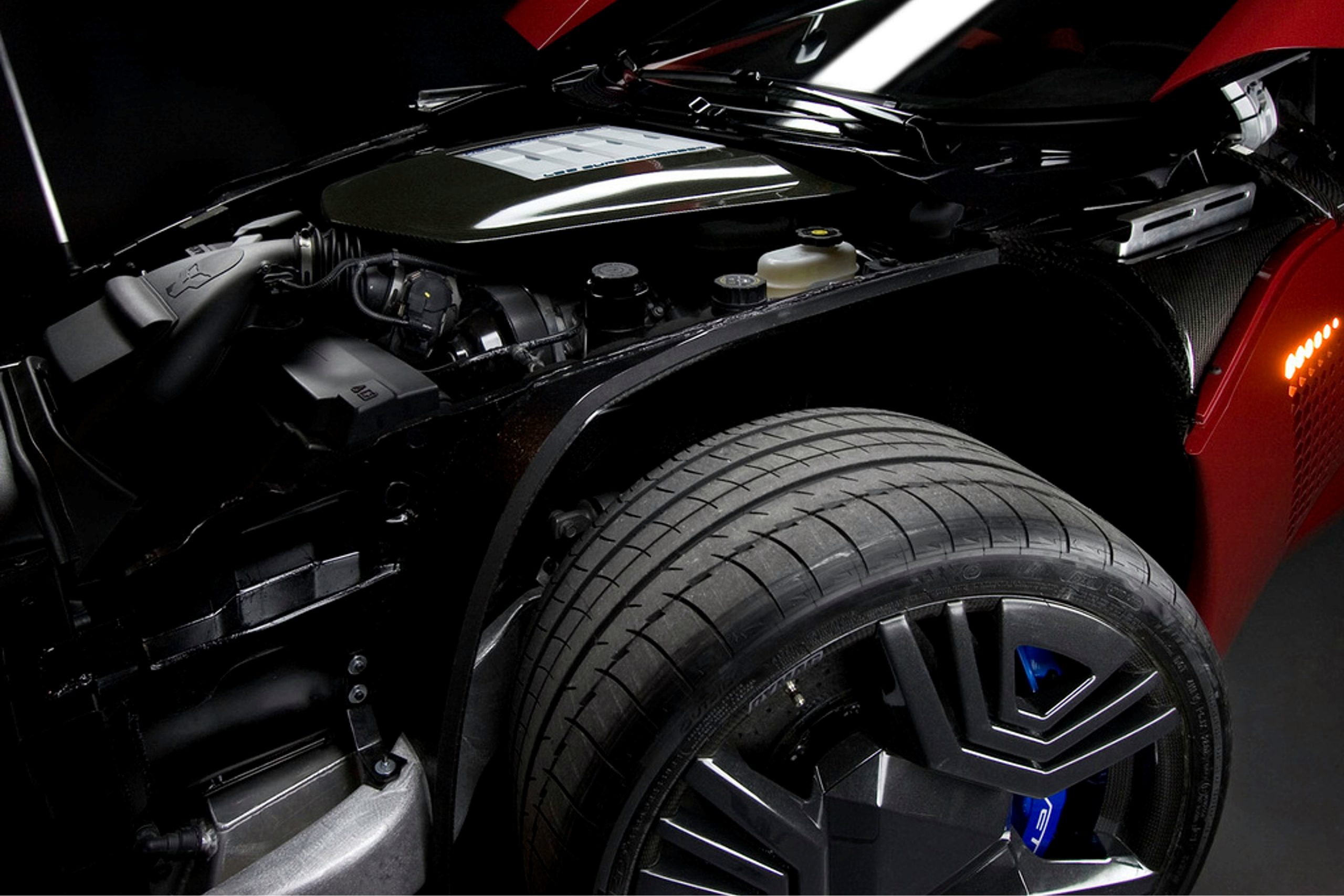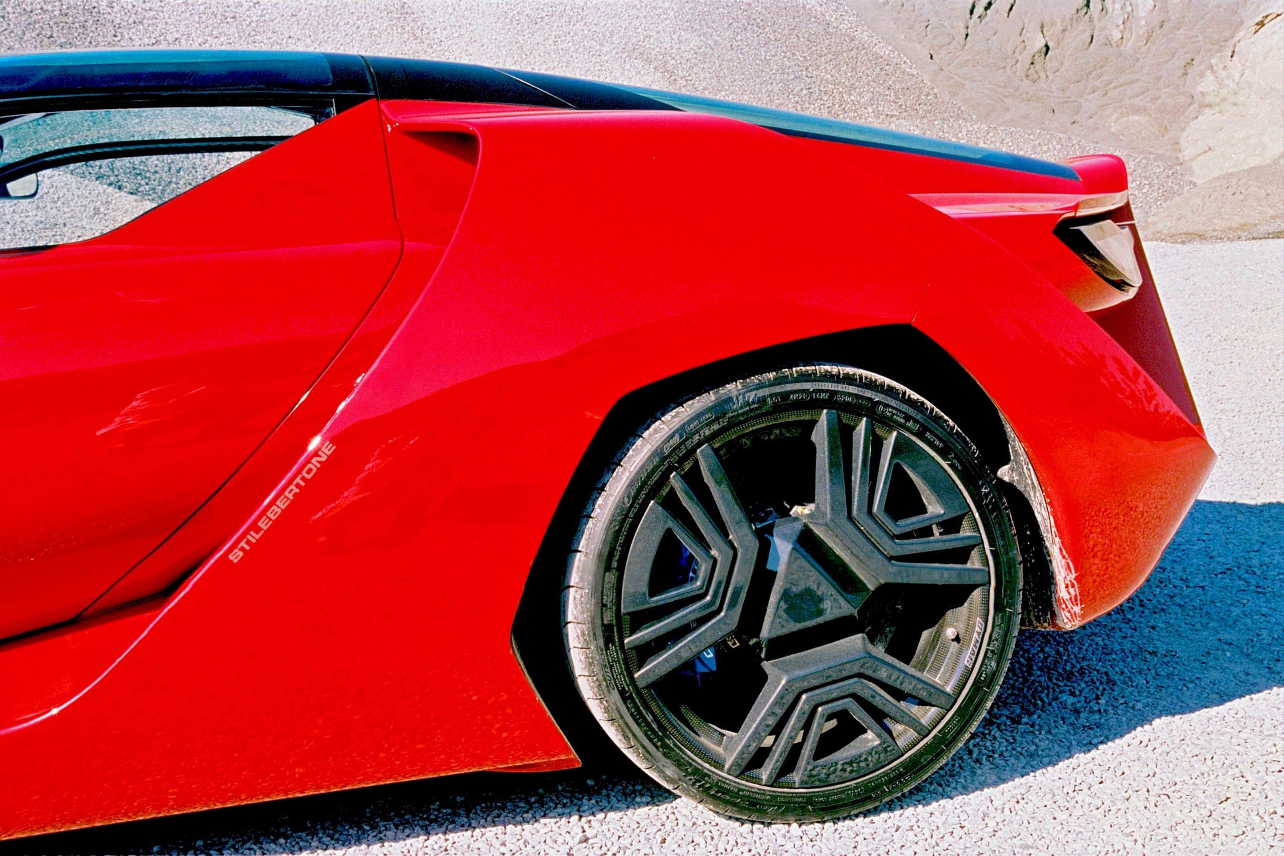On peut trouver à redire sur la poupe trop exubérante tendance Dark Vador de la Mantide, ainsi que ses passages de roues arrière tronqués (une marque de fabrique que l’on retrouvait même sur la Citroën BX !), ou encore sur l’intégration un peu gratuite des montants arrière vaguement inspirés d’une 599 GTB… ou même s’insurger des pataudes élytres… Mais on ne pouvait lui reprocher d’explorer de nouvelles voies qui au départ paraissaient honnètes et séduisantes… et ce, même si la recette des angles entremêlés tendait déjà à s’essouffler. Si le premier exemplaire ici présenté est resté précieusement dans la collection Bertone, à l’instar de la Rolls Royce Hyperion, produite en très petite série, le second exemplaire de la Mantide (de couleur blanche) a trouvé preneur moyennant 2 millions de dollars… et s’est donc va donc envolée pour Dubaï, son acquéreur étant tombé en pamoison devant les 647 chevaux revendiqués par le bloc moteur V8 de la Corvette ZR1 et des performances percutantes : 351 km/h, 0 à 100 km/h en 3,2 secondes…