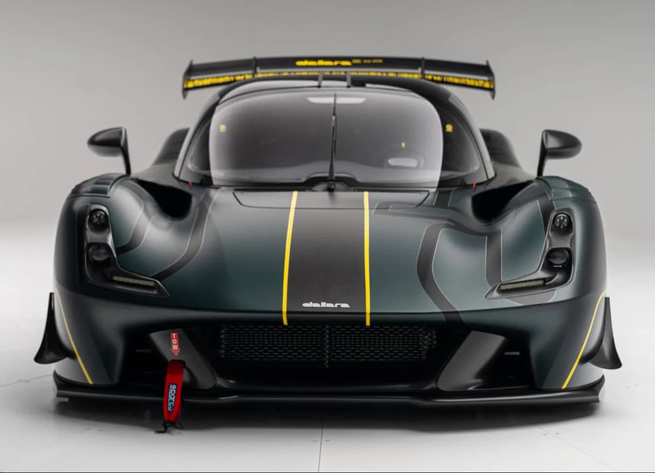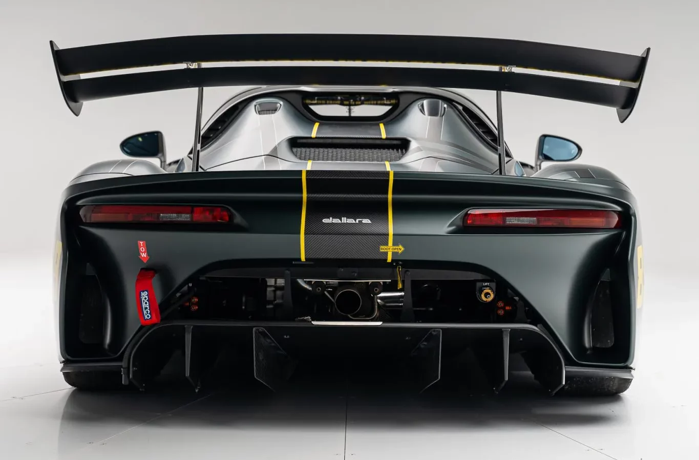 On cause là d’appui aérodynamique à sa vitesse maximale de 290 km/h (180 mph), ce que personne au monde (et même dans l’univers) n’a jamais osé réaliser. Actuellement configuré en coupé, cet exemplaire arbore une teinte verte rehaussée de touches de jaune, des autocollants Dallara et le numéro 89 sur les deux flancs. À l’avant, les phares à LED sont associés à des feux arrière provenant de l’Audi Q7. Parmi les autres détails extérieurs, on note un essuie-glace central unique, des rétroviseurs extérieurs doubles, des sangles de remorquage Sparco et un système de remplissage rapide de carburant ATL.