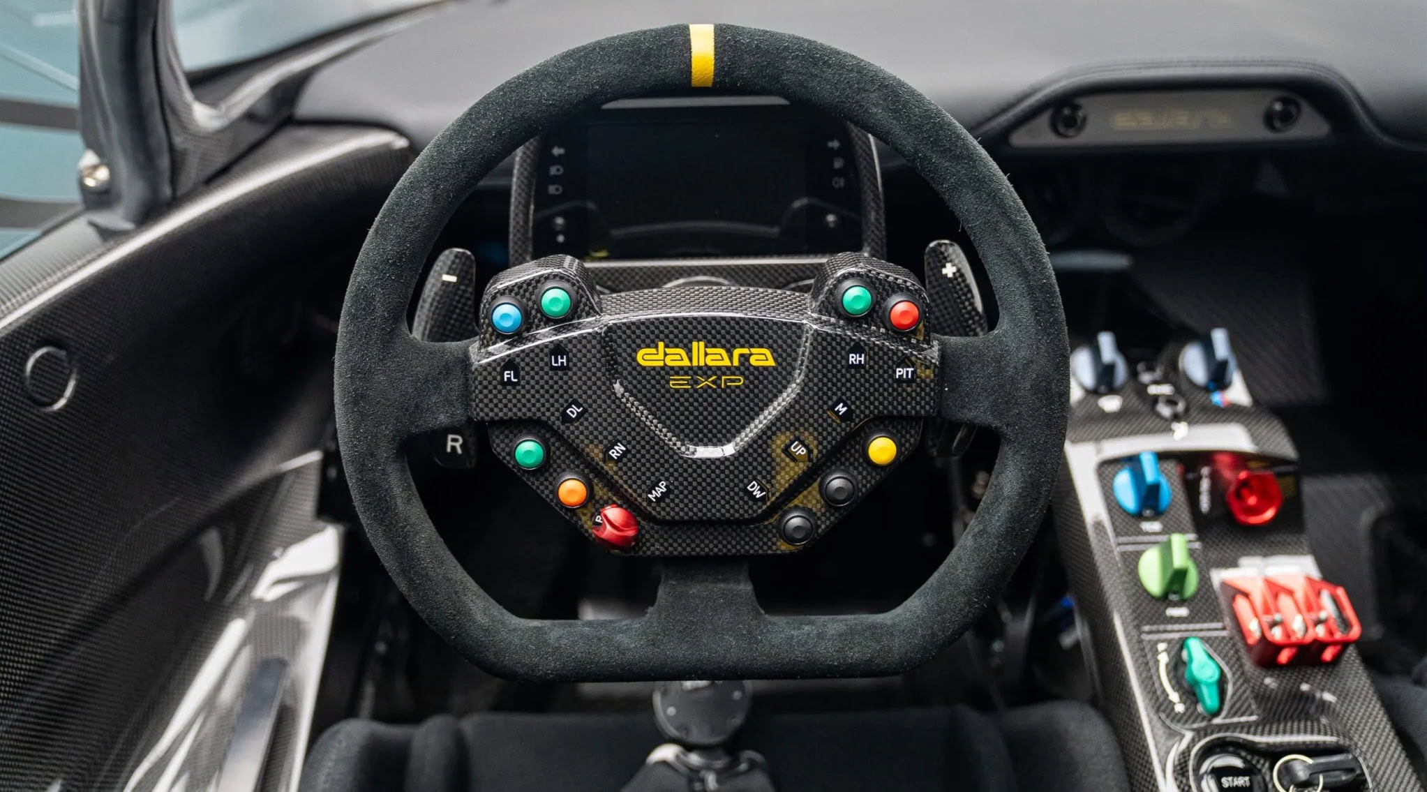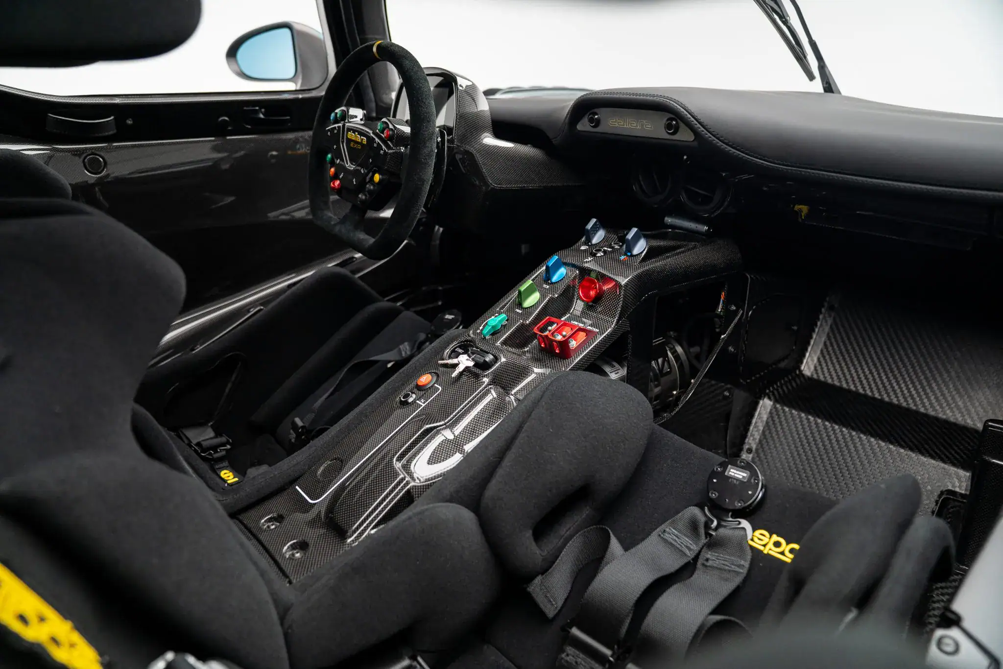 Ces sièges sont équipés d’un système de protection de la tête et de harnais multipoints. L’auto, à vendre pour 5 millions d’euros, plus taxes et emmerds, comprend également la climatisation, un système d’extinction d’incendie et un système de caméras HD SmartyCam. Le volant en fibre de carbone est fixé à un moyeu à démontage rapide et gainé d’Alcantara. Il intègre des palettes de changement de vitesse et des commandes à boutons pour diverses fonctions du véhicule, tandis que les molettes de réglage du TCS, de l’ABS et de la répartition du freinage se trouvent sur la console centrale.