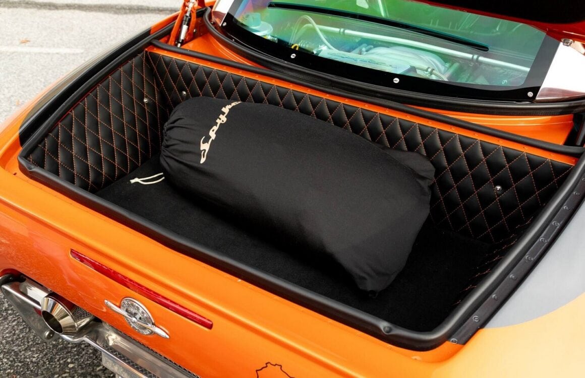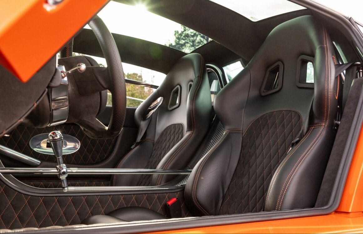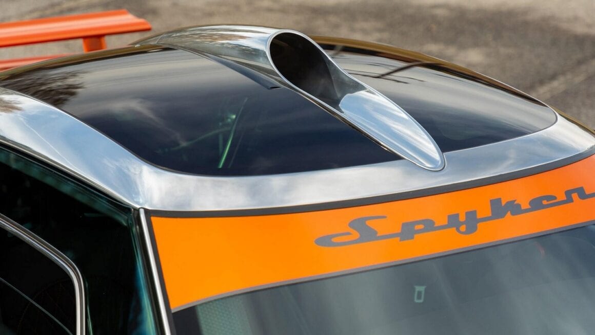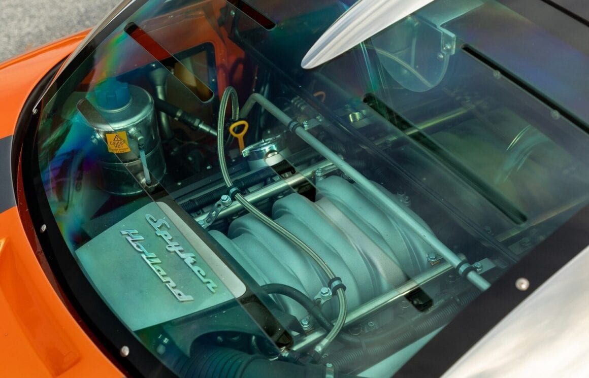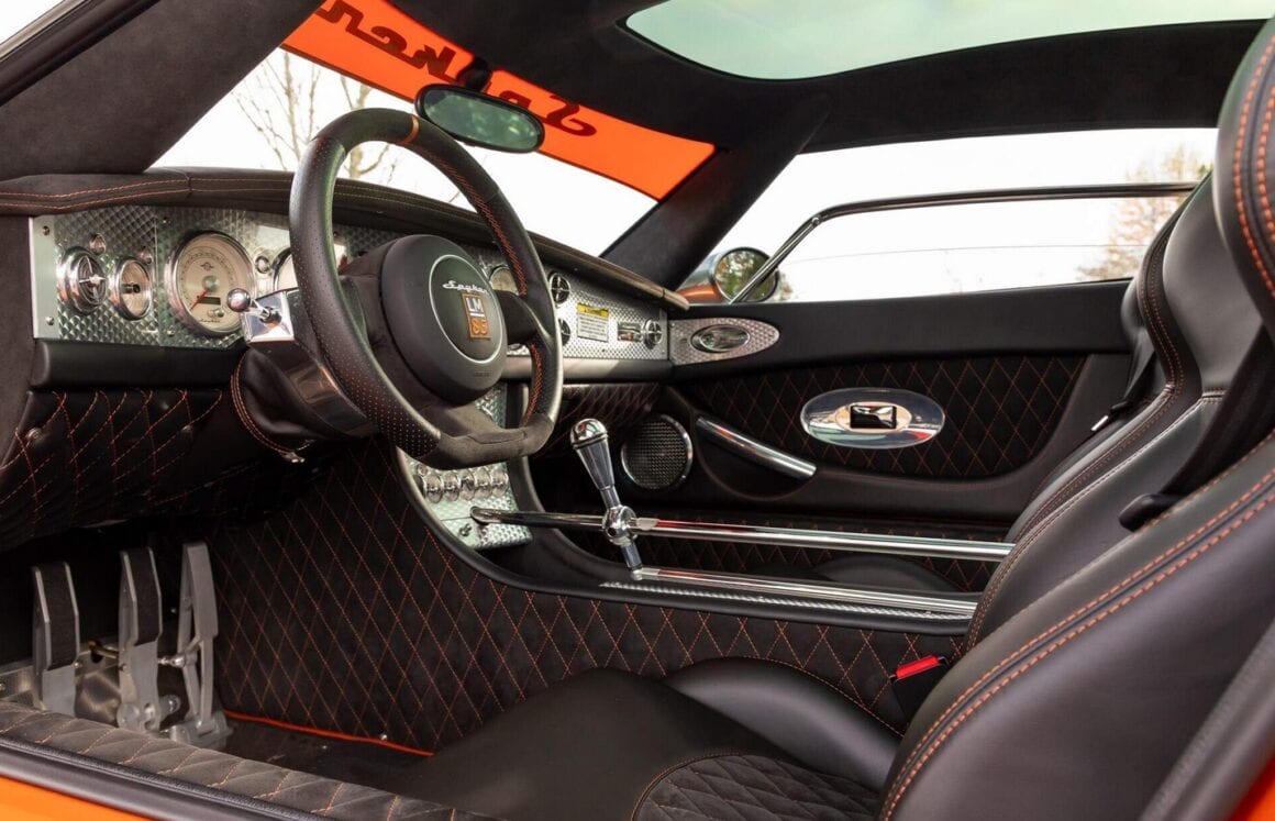 Au lieu de ces couleurs gênantes, cette Laviolette est Orange et anthracite façon charbon de la mine, une couleur que ses jantes en magnésium de 19 pouces complètent à merveille. Elles reproduisent les pales d’hélice d’un avion d’époque, une référence sans fondement aux années de la Première Guerre mondiale, lorsque la société Spyker d’origine construisait des avions de chasse et des moteurs d’avion après avoir fusionné avec un avionneur néerlandais…