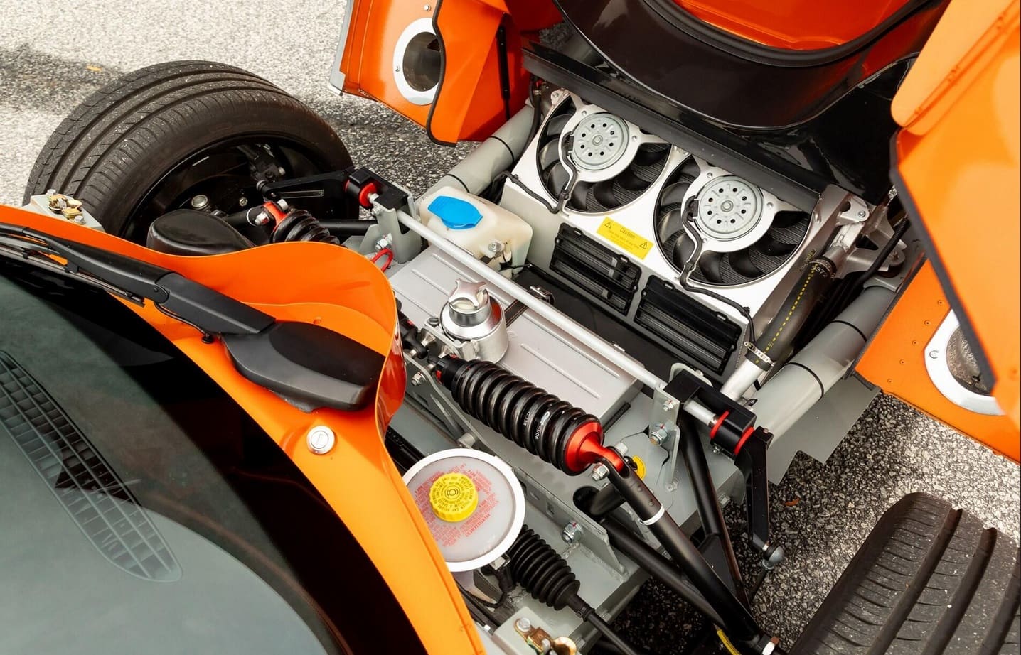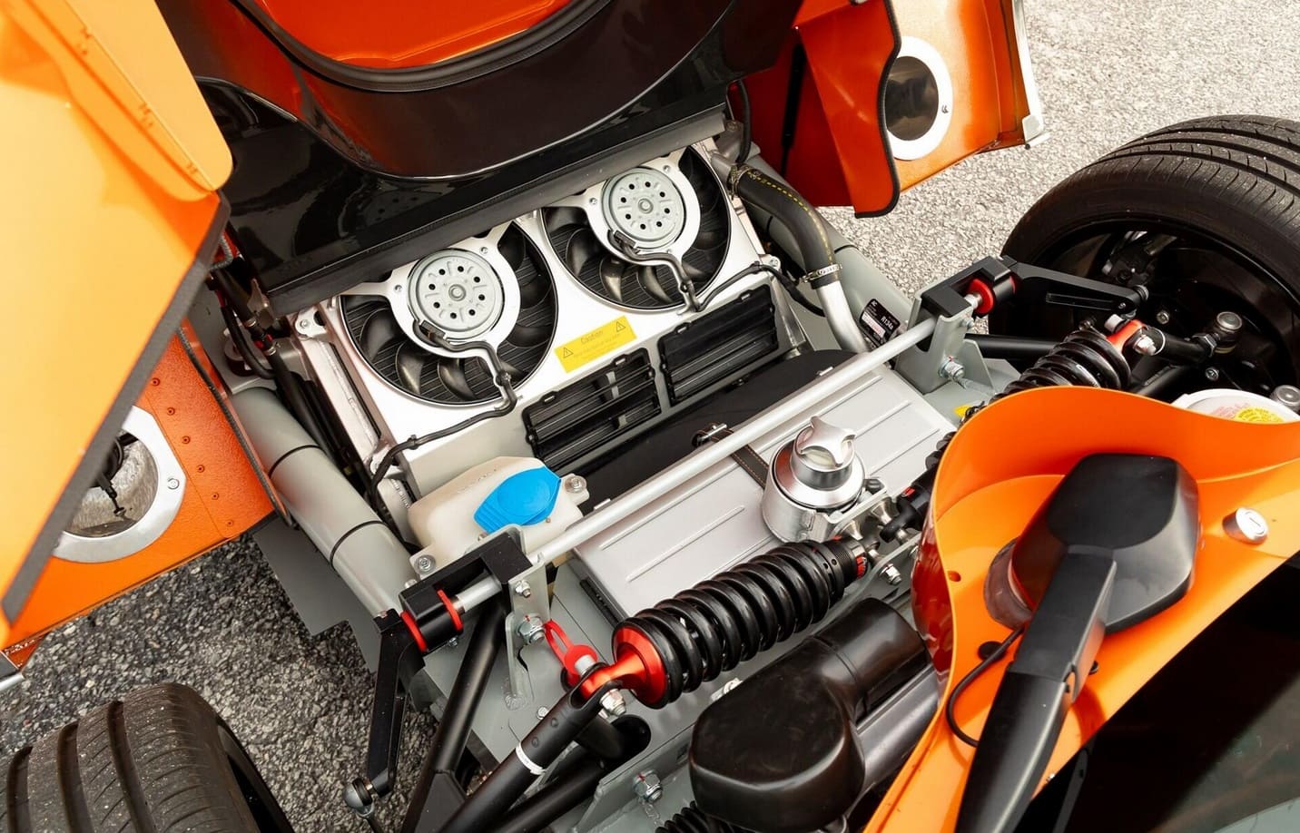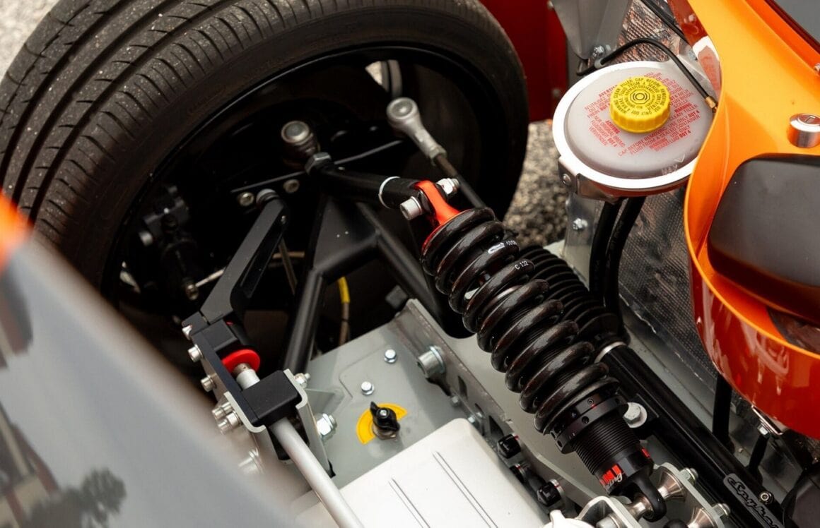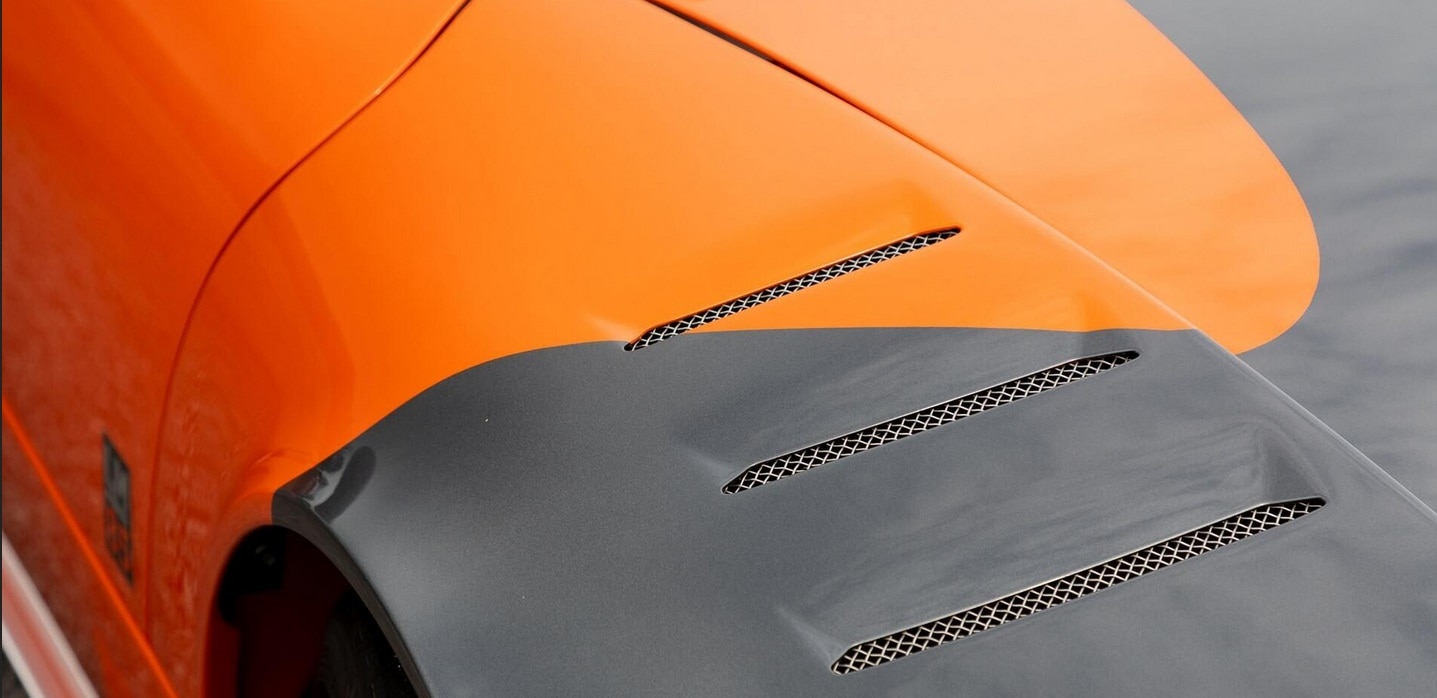 Au lieu de ces couleurs gênantes, cette Laviolette est Orange et anthracite façon charbon de la mine, une couleur que ses jantes en magnésium de 19 pouces complètent à merveille. Elles reproduisent les pales d’hélice d’un avion d’époque, une référence sans fondement aux années de la Première Guerre mondiale, lorsque la société Spyker d’origine construisait des avions de chasse et des moteurs d’avion après avoir fusionné avec un avionneur néerlandais…