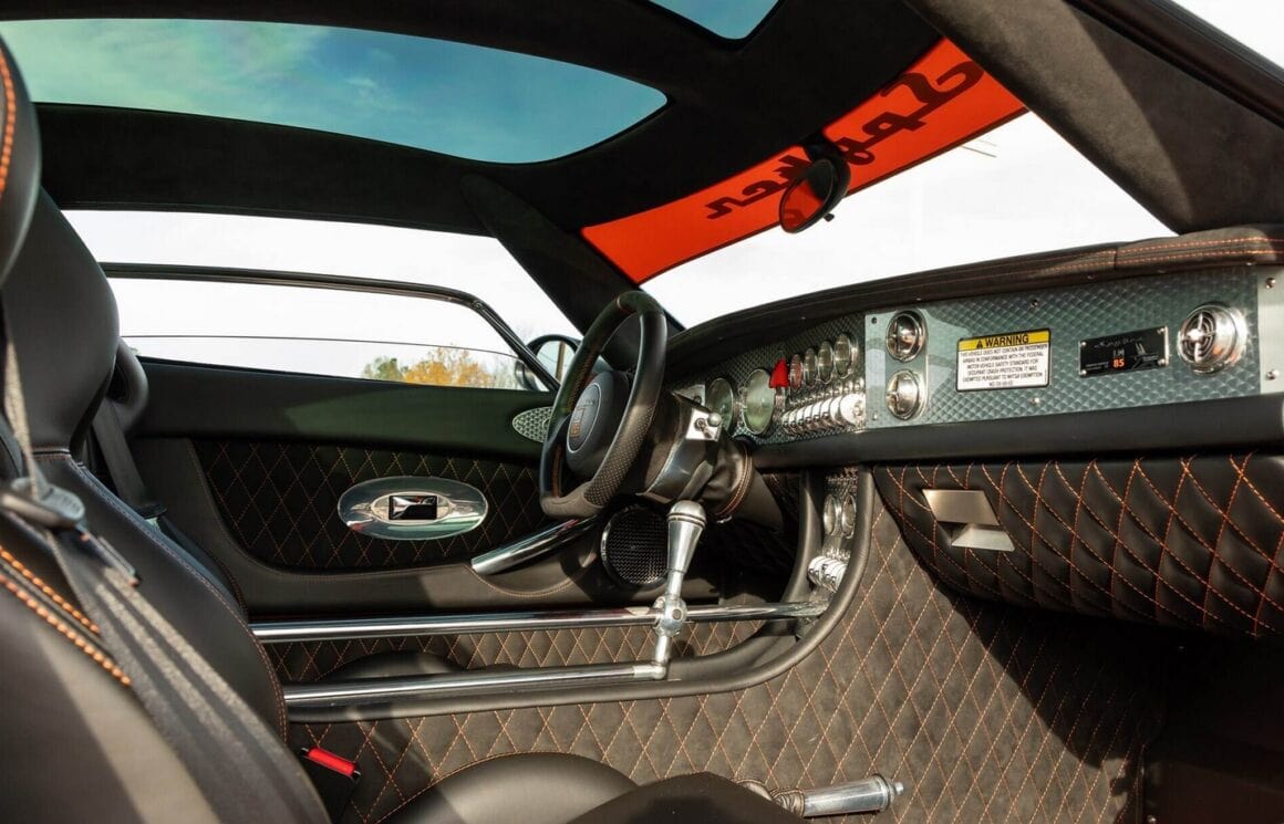 Comme documenté par son autocollant de fenêtre d’origine (typique aux USA qui détaille absolument toute la réalité de la voiture afin d’éviter les fraudes dans l’esprit “américain” qui ne peut concevoir que ce document peut être utilisé sur d’autres voitures)… la Spyker était équipée d’usine d’un extincteur Spyker, d’une connectivité iPod, d’une sur-couture intérieure orange contrastée et de freins spéciaux ultra-rares donc ultra-coûteux.