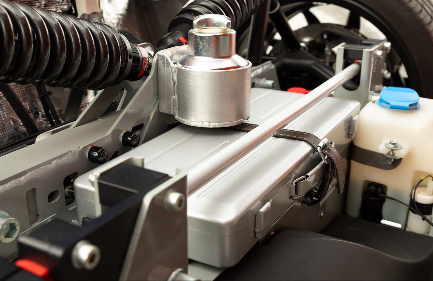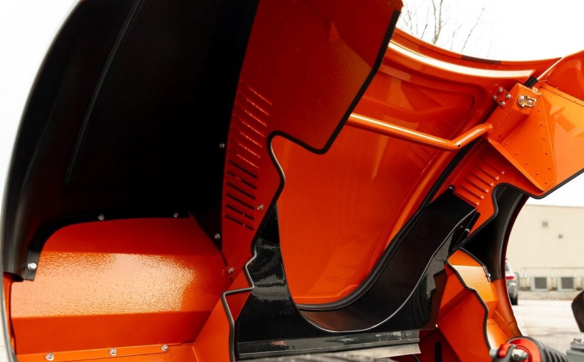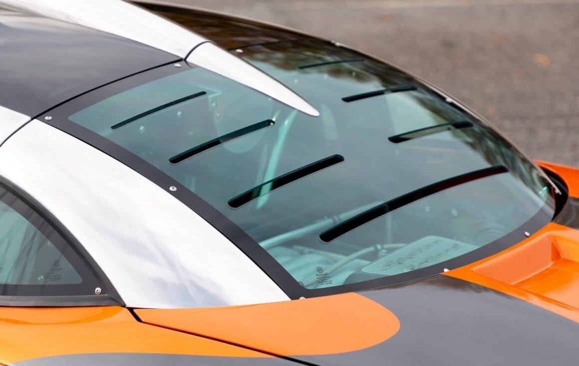 Celles-ci se situent un peu partouze, dont les flancs et les rétroviseurs extérieurs balayés vers l’arrière fabriqués à partir de morceaux d’aluminium massif. Mais c’est la conception de la toiture qui a fait la renommée de la Laviolette. Rappelant la verrière d’un avion de chasse, ce toit à panneaux de verre est doté d’une prise d’air géante montée au centre qui alimente en air le V8 Audi, exposé aux regards fascinés sous la section arrière du verre plastifié…