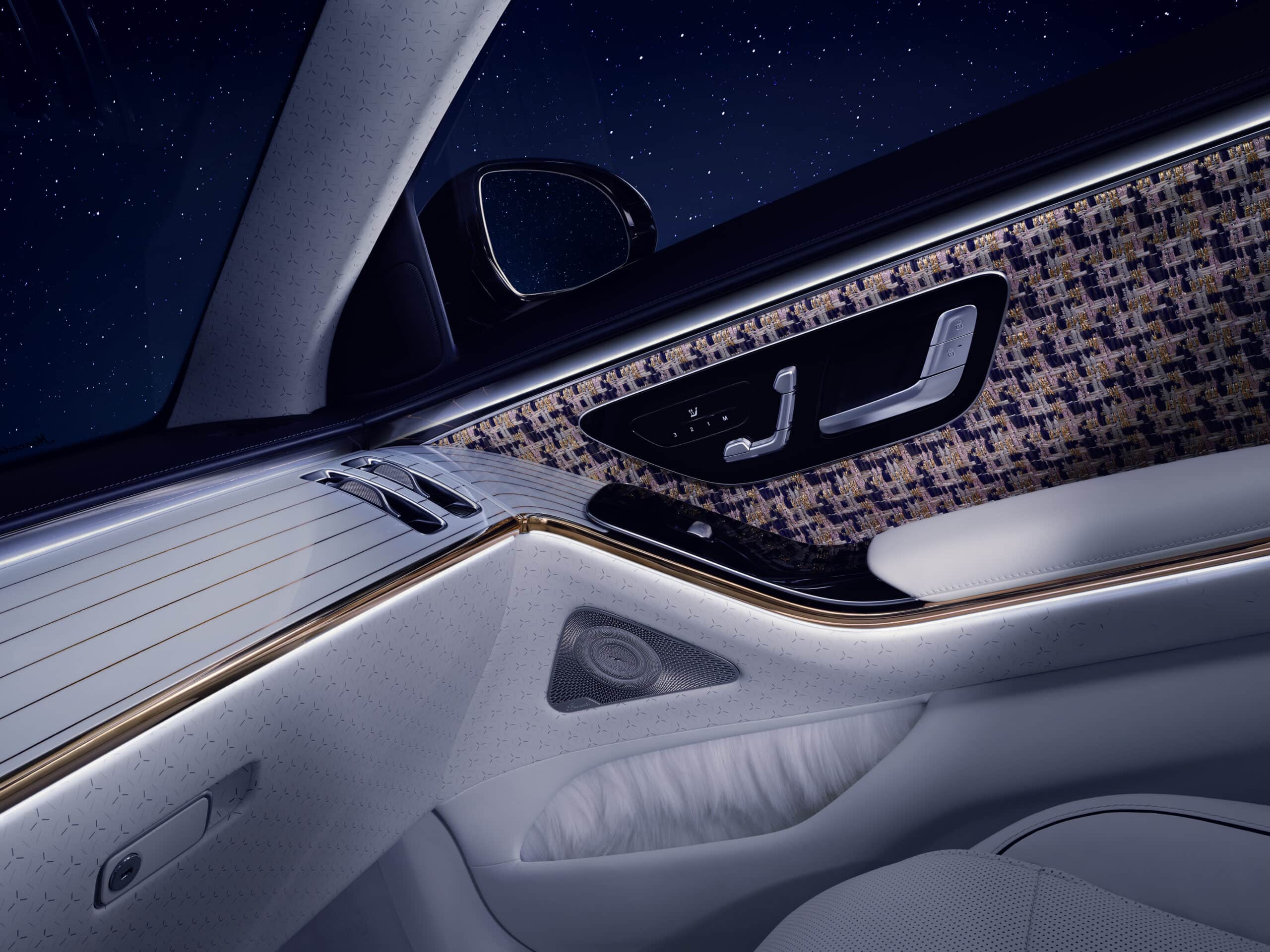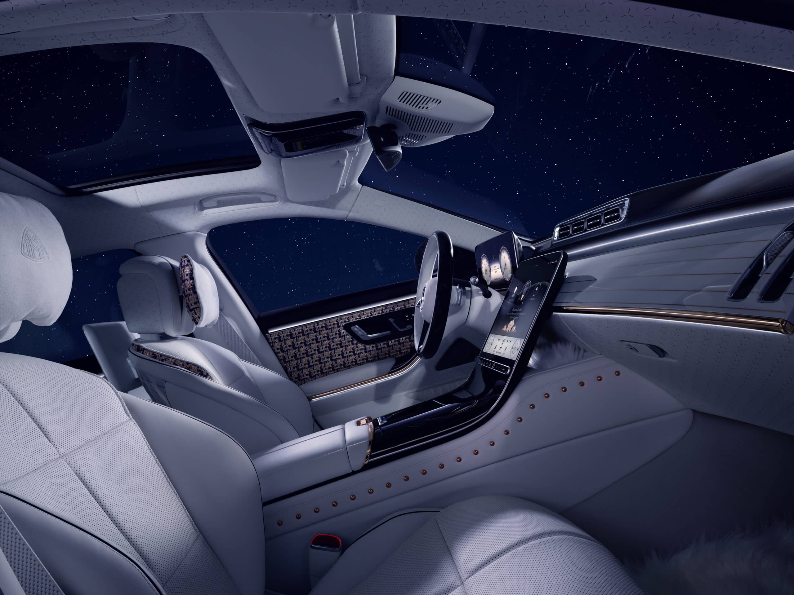L’habitacle, à l’intérieur duquel on est accueilli par des motifs animés projetés sur le sol à l’ouverture des portes, reçoit des habillages de couleur bleu marine foncé et or rose, rehaussés de touches de couleur cristal et opale blanche. Un tissu bouclé de haute qualité reprenant les teintes bleu, beige, or rose et or dur, est également présent. Il arbore des détails complexes visibles au niveau des habillages de sièges et des coussins. Enfin un cuir de couleur cristal blanc recouvre les consoles, portes et coussins, tandis que lin et mohair sont utilisés pour la fabrication des tapis de sol…