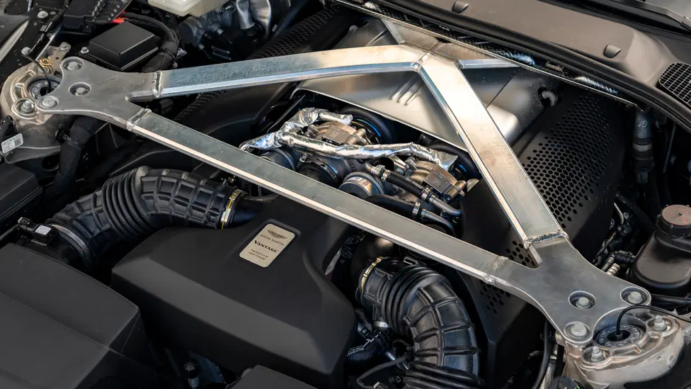 Le budget d’Aston n’est toutefois pas aussi important que celui d’AMG ! Je vais passer en revue cela aussi vite que possible, mais ce à quoi je veux que vous pensiez, c’est à quel point ces changements sont détaillés. À l’arrière, les ressorts sont 10 % plus rigides, les amortisseurs jusqu’à 20 % sous compression, les butées anti-chocs ont été changées et un support supérieur en caoutchouc plus rigide a été installé. Le bras de commande supérieur est nouveau et il y a maintenant un amortisseur latéral entre le sous-châssis arrière et le tube de couple pour réduire le mouvement du groupe motopropulseur.