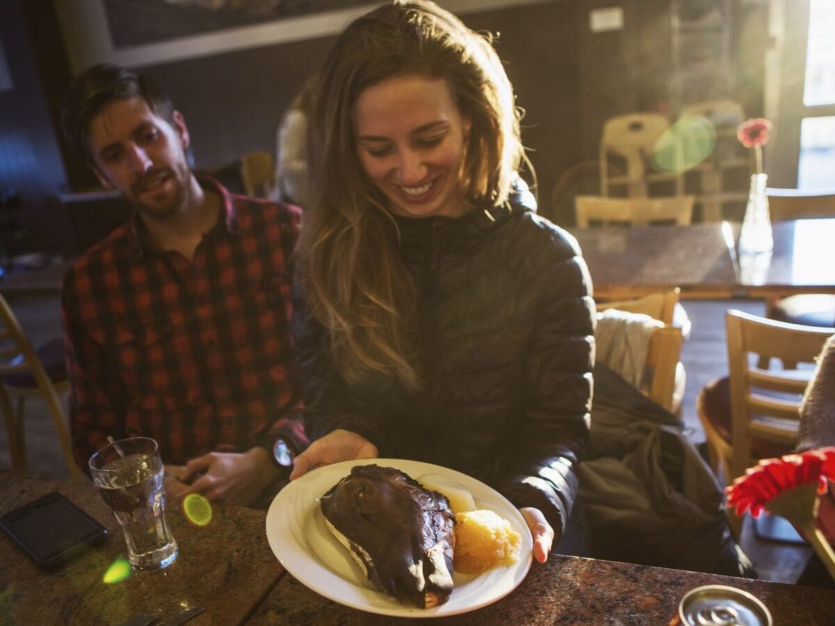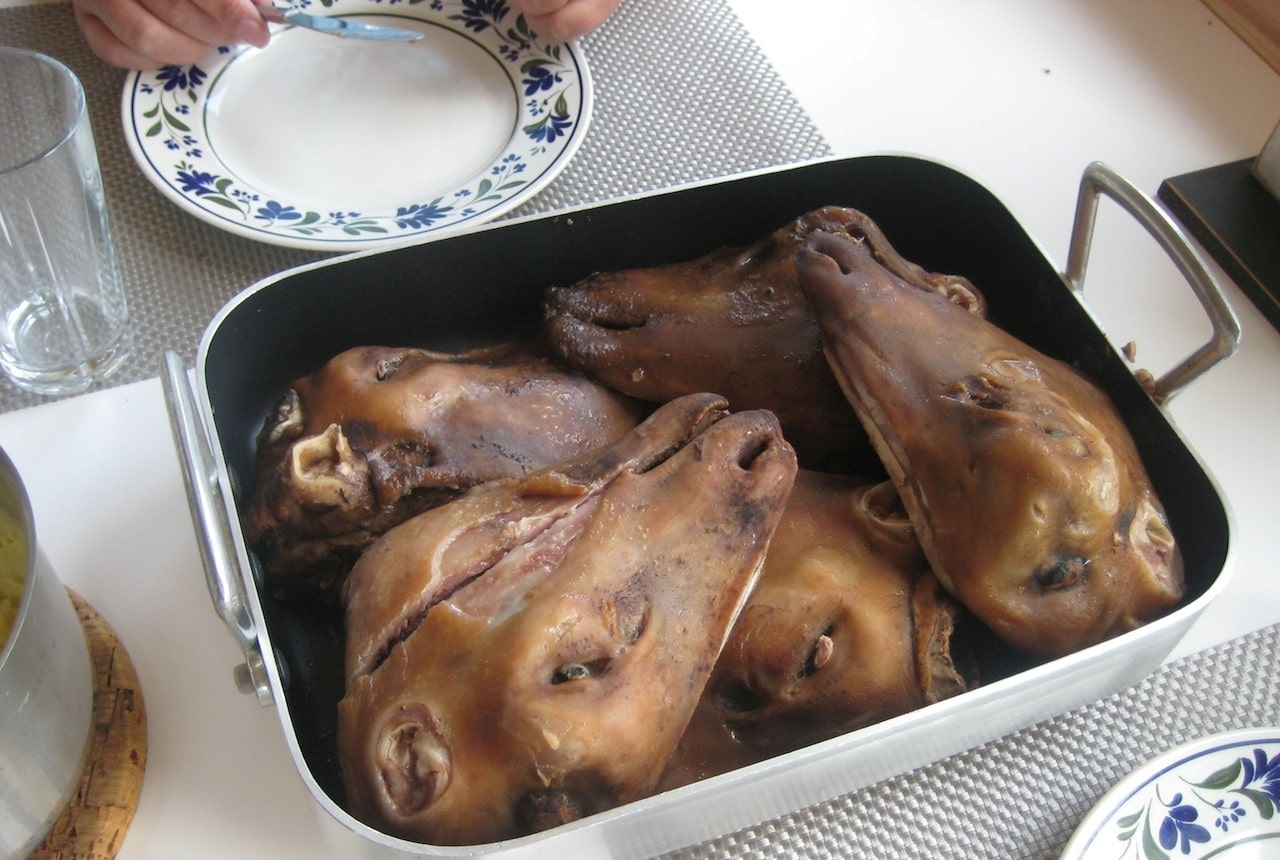 Je n’ai rien dit à personne, mais mon choix était fait : la rouge ou rien ! Après remise d’un road book (le circuit en détail) nous nous sommes tous dirigés vers les voitures garées devant l’hôtel. Pas de jaloux ! Et c’est parti pour 30 kilomètres, le temps de rejoindre un restaurant gastronomique ou nous attendait l’attachée de presse de Koenigsegg. Première pause. Bien méritée, quoique. Je ne vous épargnerais pas le menu, un extraordinaire “Ha-Karl” servi très chaud spécialement pour les intrépides journalistes-essayeurs que nous étions… et cela dans le respect des traditions locales, à savoir le Thorrablot qui est une fête dans la très grande tradition Viking du IX ième siècle. Puisque j’ai dû le subir, inclus dans le programme d’essai, je vous en livre ci-après la recette descriptive ! En poussant la porte du restaurant, une drôle d’odeur m’a pris les bronches, mate, oppressante, aigrelette avec un fond ammoniaqué…