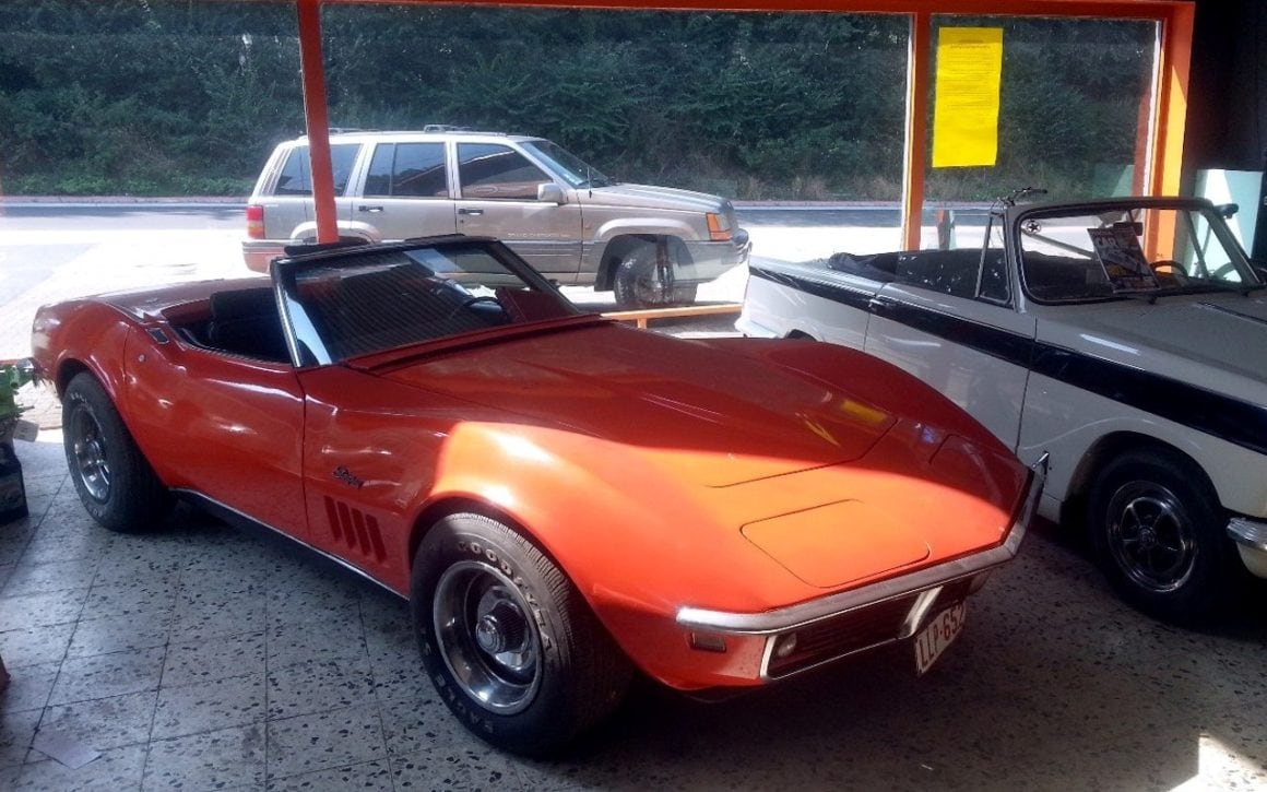 Sous le ciel bleu et la canicule qui règne, un véhicule s’immobilise…, à bord, deux jeunes hommes qui se chuchotent quelque chose à l’oreille…, ils viennent admirer une belle en vitrine, recolorée comme une orange après “choucroutage” général. Maquillée, avachie, une Corvette Sting ray Cabrio’69 qui attend son amant depuis quelques années, ils déchiffrent un prix de 30.000 euros, ce qui les fait mieux la regarder : “Putain, elle est moche, pourrie, dégueux, et un prix pareil, faut être dingo”… Et ils repartent alors qu’un conducteur de moto fait son apparition, iI regarde, fait un geste de l’index et disparait la poignée en coin…