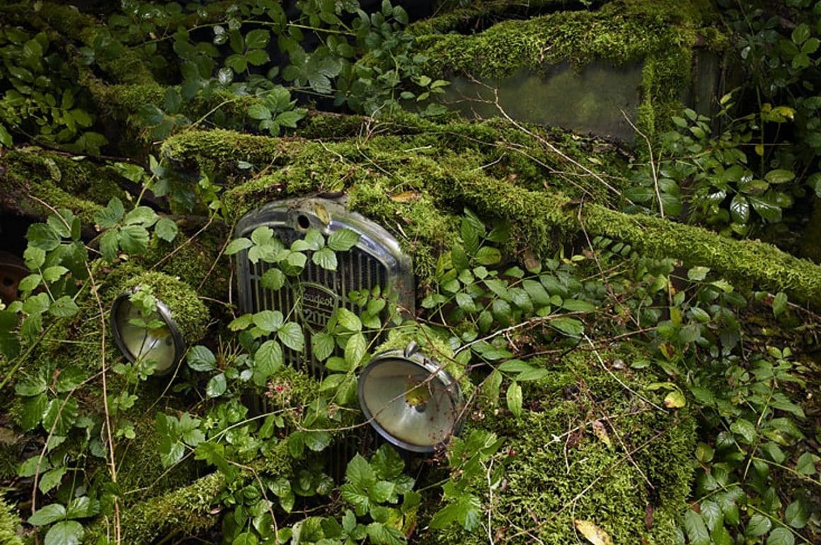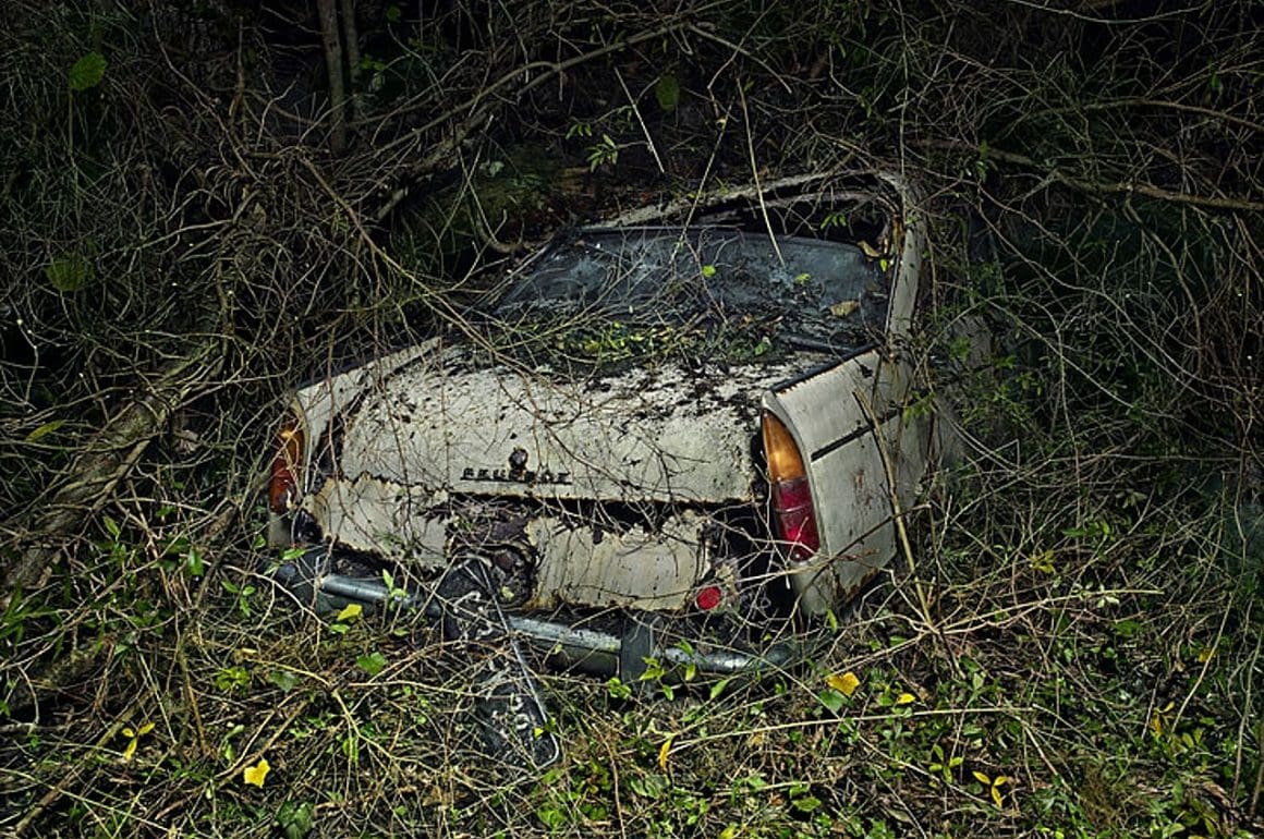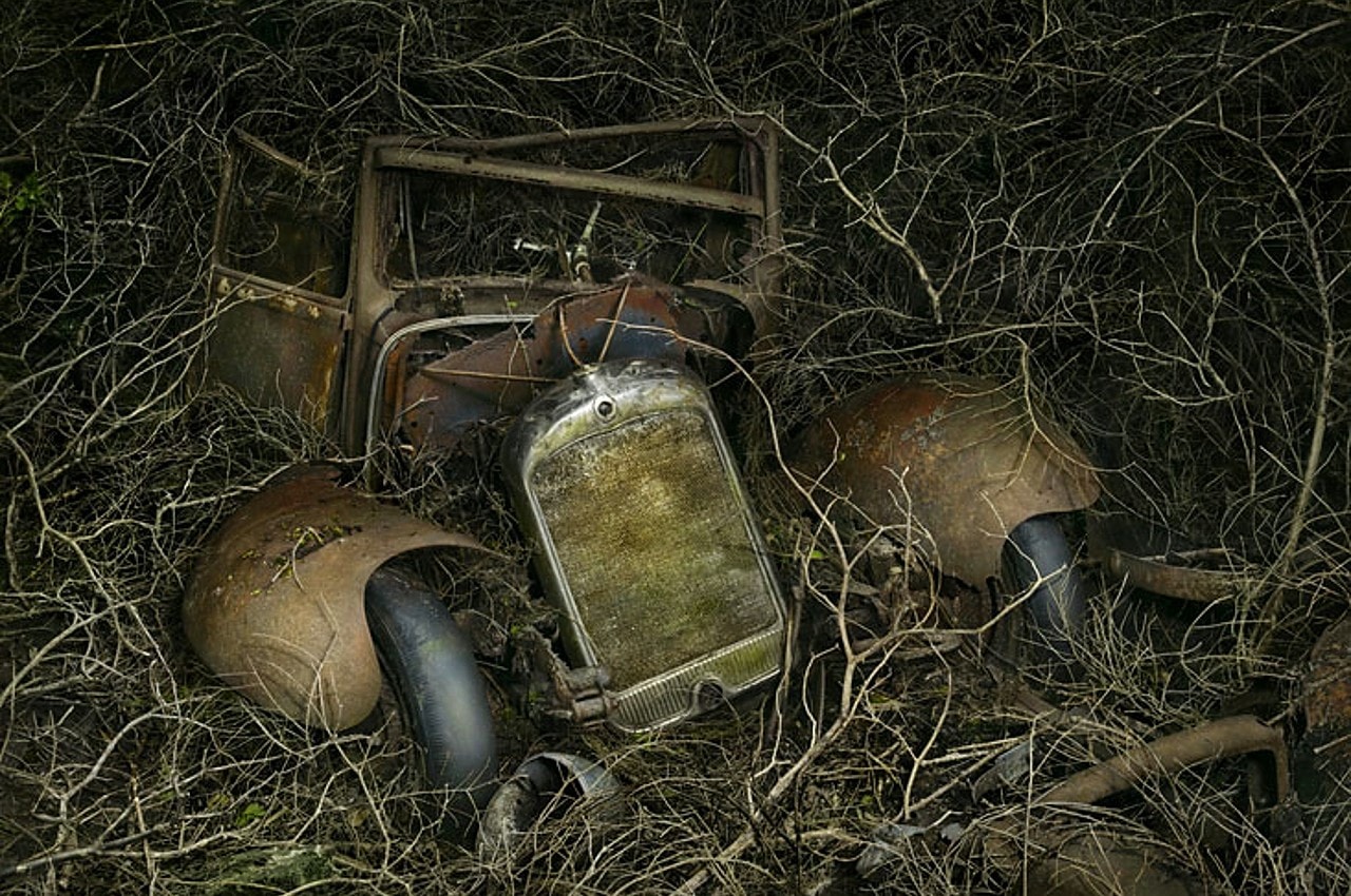 J’ai ensuite suivi John qui voulait me montrer son garage…, je suis passé à côté d’une voiture antédiluvienne, aussi morte qu’un dinosaure, le temps semblait s’être arrêté, puis, une Triumph curviligne m’a ébloui avec sa souriante calandre nickelée, le capot était ouvert et deux hommes scrutaient le moteur…, un autre était à peine visible, son corps étant caché sous la voiture…, trois heures plus tard, à mon retour, ils restaient figés comme des pièces de musée…, chaque voiture déglinguée ajoutait ainsi une autre mante aux multiples couches d’un temps perdu…, la plupart avaient mal résisté avec leurs pièces improvisées, leurs roues usées et leurs articulations détruites.