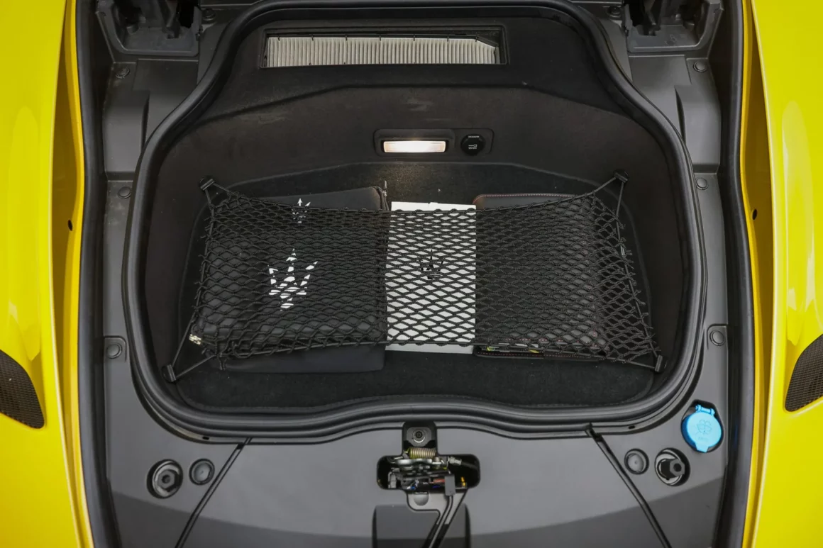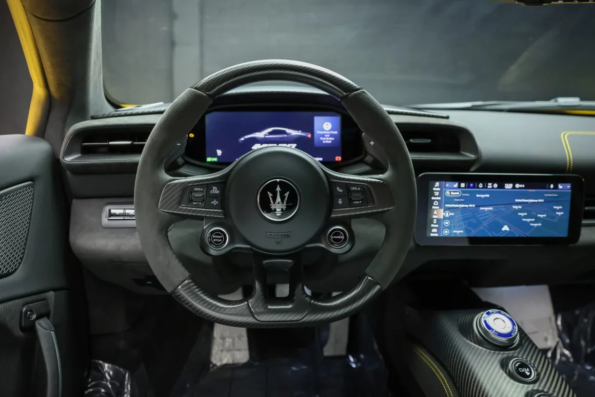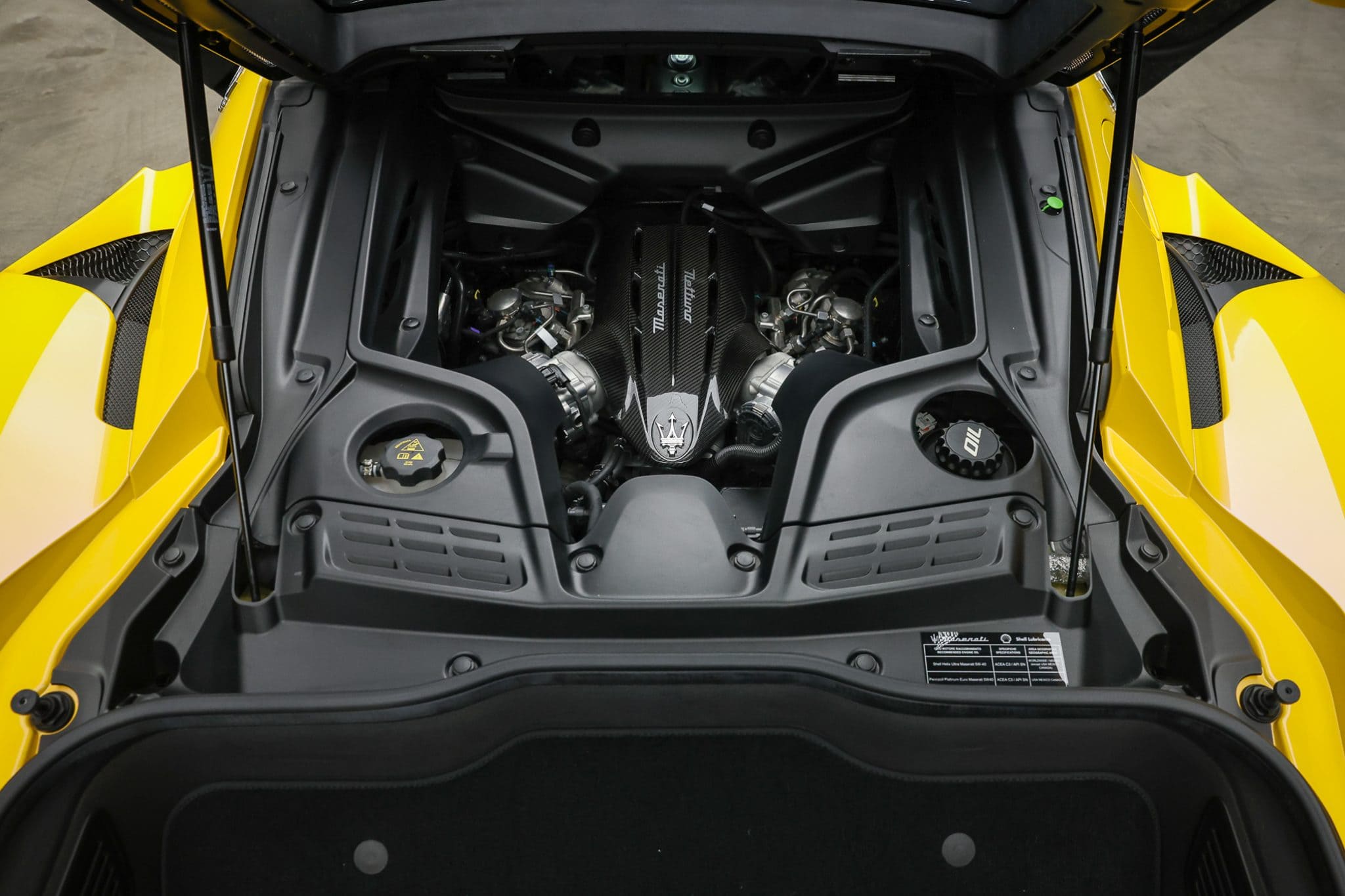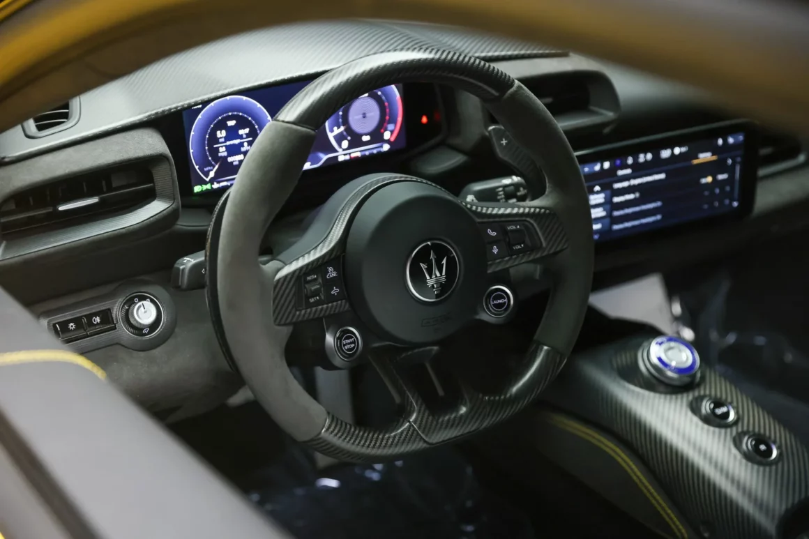 Les garnitures en fibre de carbone accentuent l’habitacle, et les équipements comprennent la climatisation automatique à deux zones, un rétroviseur numérique, une recharge sans fil. Le volant garni de fibre de carbone et d’Alcantara se trouve devant les palettes de changement de vitesse montées sur colonne et encadre un combiné d’instruments numériques de 10,25 pouces. Le V6 Nettuno à double turbocompresseur est doté d’un couvercle en fibre de carbone en option. Voilà, c’est fini…