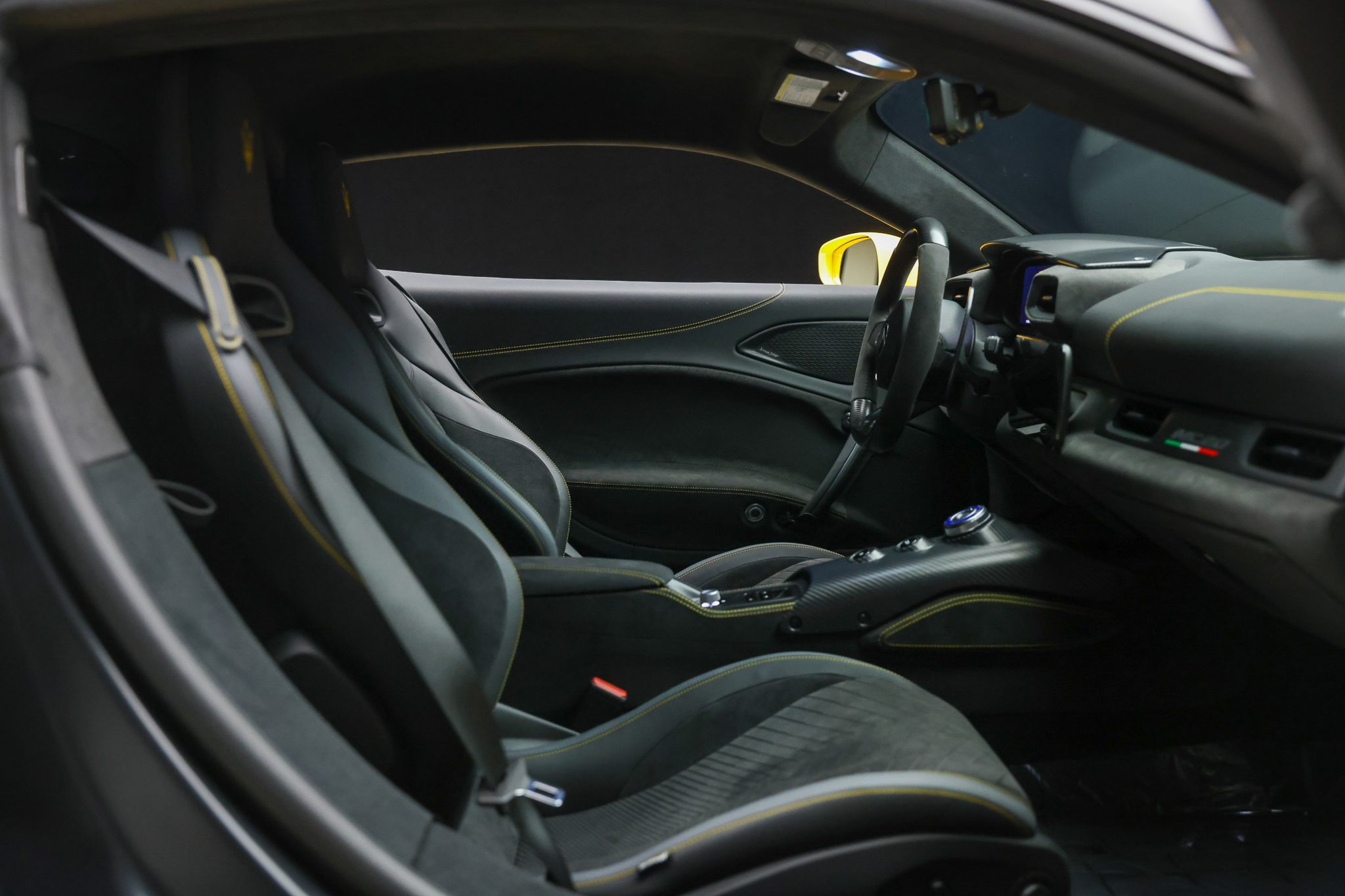 Le différentiel est à glissement limité. L’équipement supplémentaire comprend les packs de carbone intérieur et extérieur ainsi que des jantes Birdcage de 20 pouces, des étriers de frein jaune brillant sur des rotors en carbone-céramique, un système de levage de la suspension avant, un aileron arrière en fibre de carbone, des capteurs de stationnement, une caméra de recul, un système audio Sonus Faber, des sièges avant chauffants, une climatisation automatique à deux zones et un système d’infodivertissement à écran tactile avec navigation, Apple CarPlay, et Android Auto.