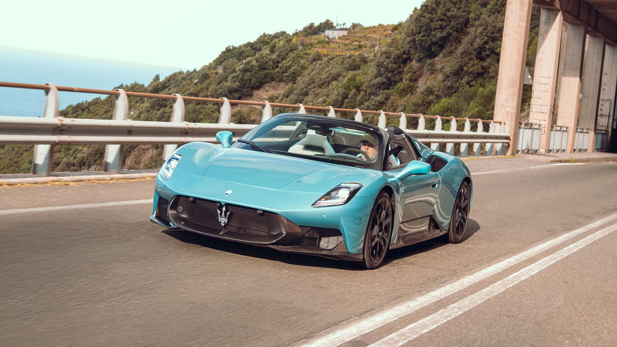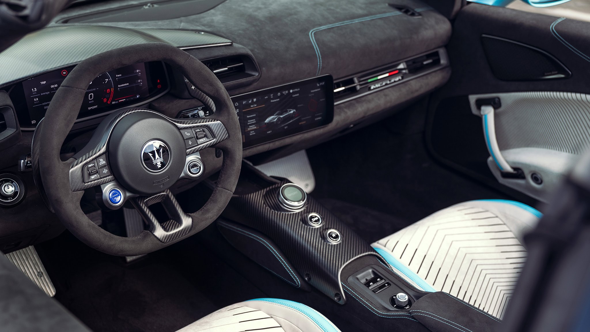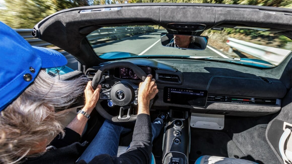 Bien que le toit ne prenne que 12 secondes à se déployer, vous pouvez passer presque autant de temps à glisser et à poignarder l’écran pour y parvenir. Maserati affirme que le MCPURA passera de 0 à 60 mph en 2,9 secondes en route vers une vitesse de pointe de 202 mph. Mais étant donné que la MC20 Cielo que nous avons testée l’année dernière a mis 3,5 secondes pour atteindre 60 sur le chemin de l’affichage d’un quart de mile de 11,7 secondes à 124,7 mph, nous prendrons cette affirmation avec une pincée de sel jusqu’à ce que nous soyons en mesure de soumettre le MCPURA à une gamme de tests.