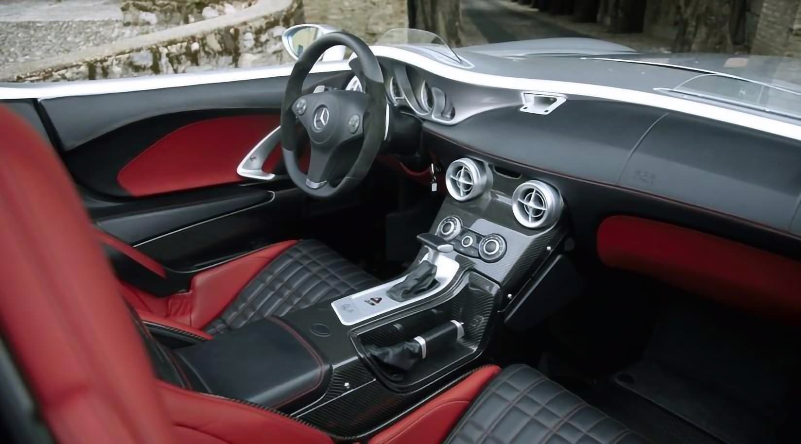 Dans la SLR 2009, la fibre de carbone tapisse également les garnitures de porte, le cuir étant remplacé par du tissu et la boîte manuelle remplacée par une boîte automatique. Les instruments sont plus petits, au format d’assiettes à sucres et volontairement à peine lisibles pour ne pas distraire le conducteur, tandis qu’une climatisation sans gaz Russe remplace les les volets de ventilation bruts. Il n’y a de plus pas de radio, ni de téléphone et de GPS.