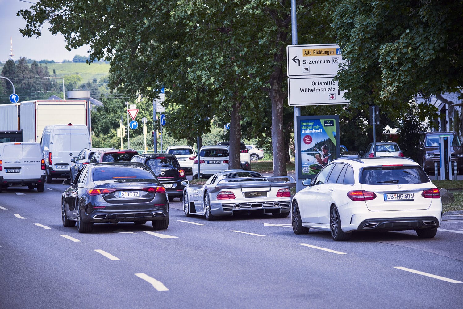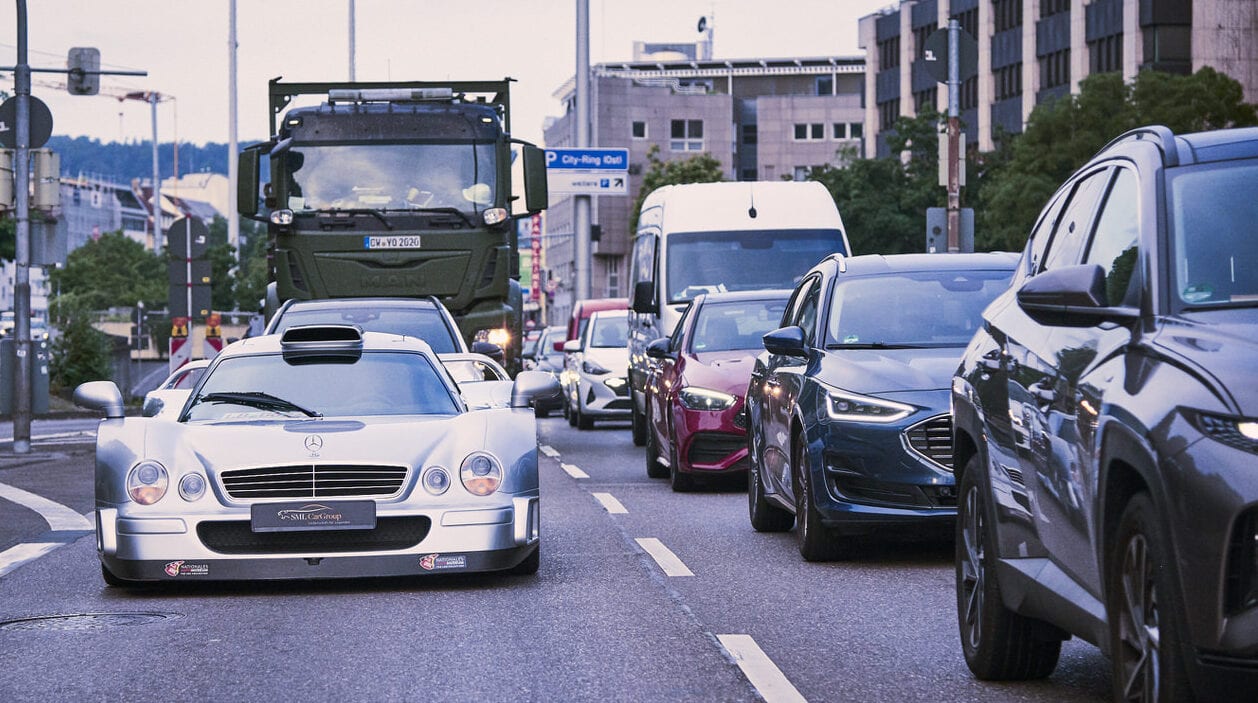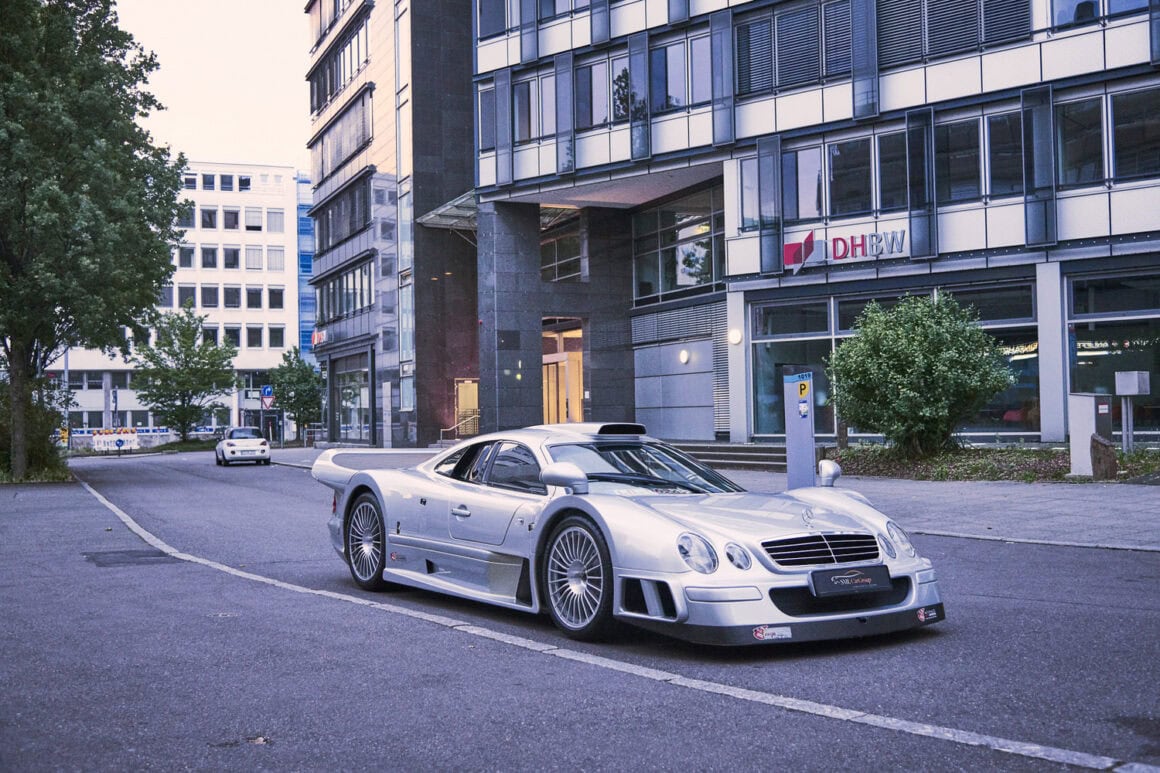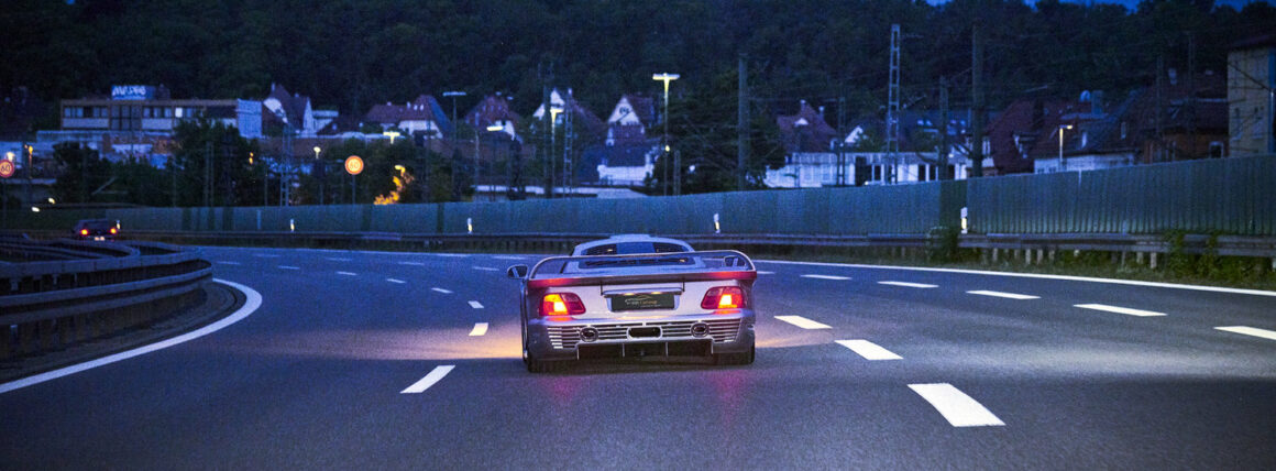Elle est encore largement endormie la ville… En y arrivant, sur la route fédérale B10 entre Zuffenhausen et Feuerbach, les premiers conducteurs qui se rendent en file indienne pour travailler en contrepartie de salaires pour miséreux obéissant, se frottent les yeux, car une star-pute du jour de la nuit apparaît à l’aube comme pour les narguer : c’est une Mercedes-Benz CLK GTR de plusieurs millions qui se déhanche d’une sortie de nuit… C’est en réalité une erreur de casting, car la société SML avait présenté ce véhicule quelques jours plus tôt au festival MYLE de Munich pour tenter d’attirer l’attention des visiteurs.