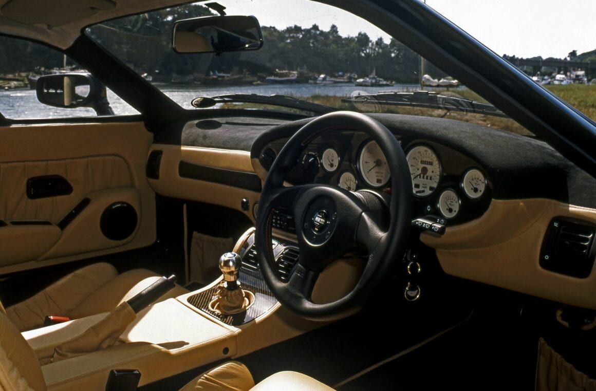 Et l’adhérence est de la variété “Oh-my-god” : car après chaque rond-point, vous devez, par sécurité, vous arrêter pour vérifier quel caoutchouc enveloppe les jantes alliages divisées OZ Racing de 17 pouces. Pour la petite histoire, ils sont gros, les Pirelli P Zero 235/45 à l’avant, et 335/35 (colossal) à l’arrière. Avec ce genre d’empreinte, vous vous demandez à quoi cela ressemblera dans l’humidité, en particulier avec 58 % du poids à l’arrière, mais c’est le meilleur à offrir d’impressionnantes glissades incontrôlables. Ni l’avant ni l’arrière ne montrent le moindre signe de relâchement sur le tarmac et chaque sortie de virage est monstrueusement vécue comme une entrée sans retour en enfer, il y a donc tout à craindre et à perdre de libérer les 335 lb-pi de couple dès que vous pouvez voir à travers le sommet. On aurait dû s’attendre à un bon châssis, bien sûr, mais non… C’est une monocoque de style Groupe C avec un sandwich en nid d’abeille composite collé dans un cadre/châssis en aluminium riveté et collé. C’est donc une fausse Supercar-junior décente comme une sotte délurée. Il y avait cependant à son époque un gros éléphant dans l’habitacle : le prix ! Lors de son lancement en 1995, la R42 était estimée à 69.950 £, soit 18.000 £ de plus qu’une Esprit S4S, 1.705 £ de plus qu’une NSX et 1.500 £ de plus qu’une Porsche 964 RS. Et comme cette SpectreR42 nécessitait plus de 2.000 heures de travail pour être construite, un prix de vente de 70.000 £ ne suffisaient pas à empêcher Spectre de perdre de l’argent.