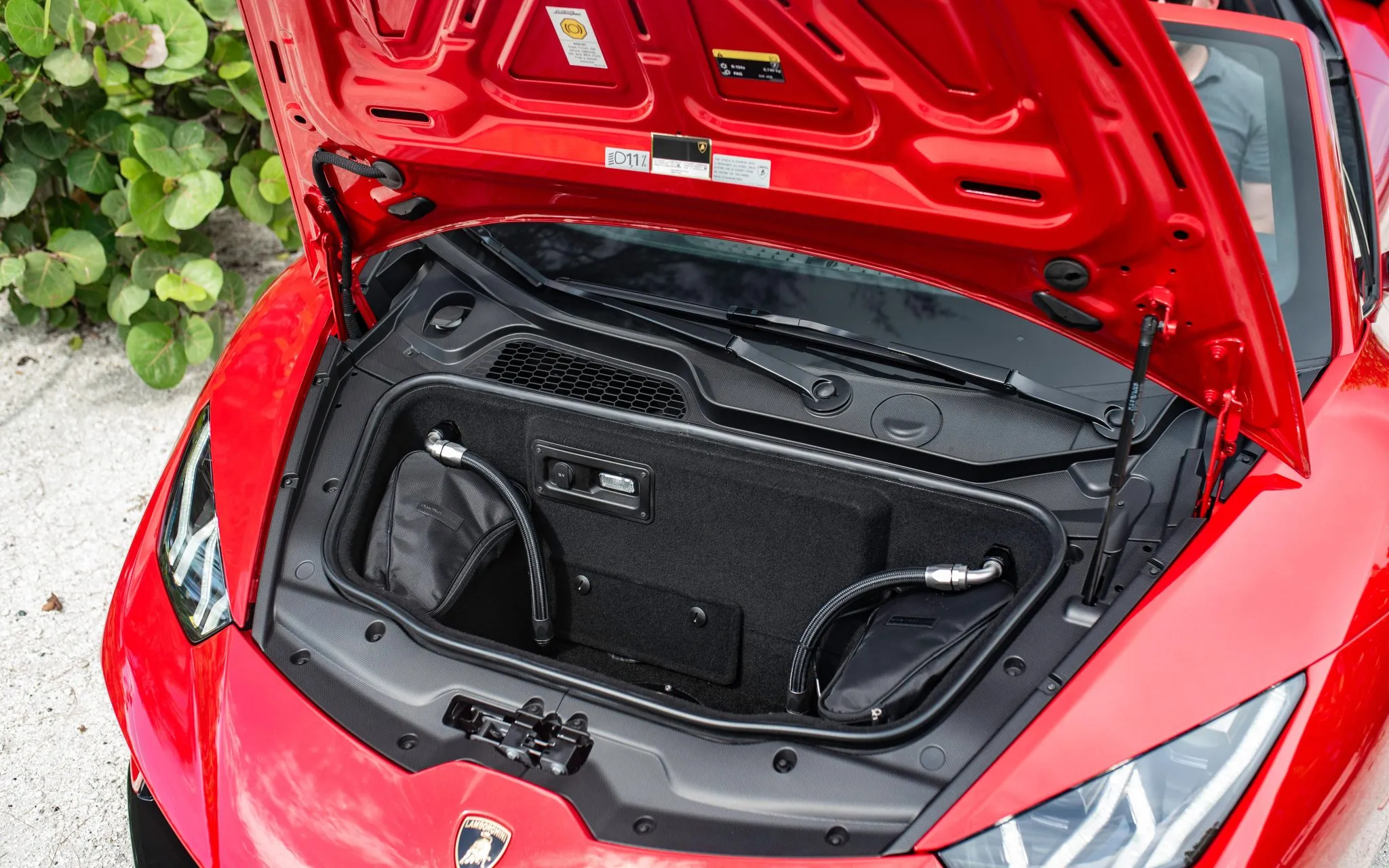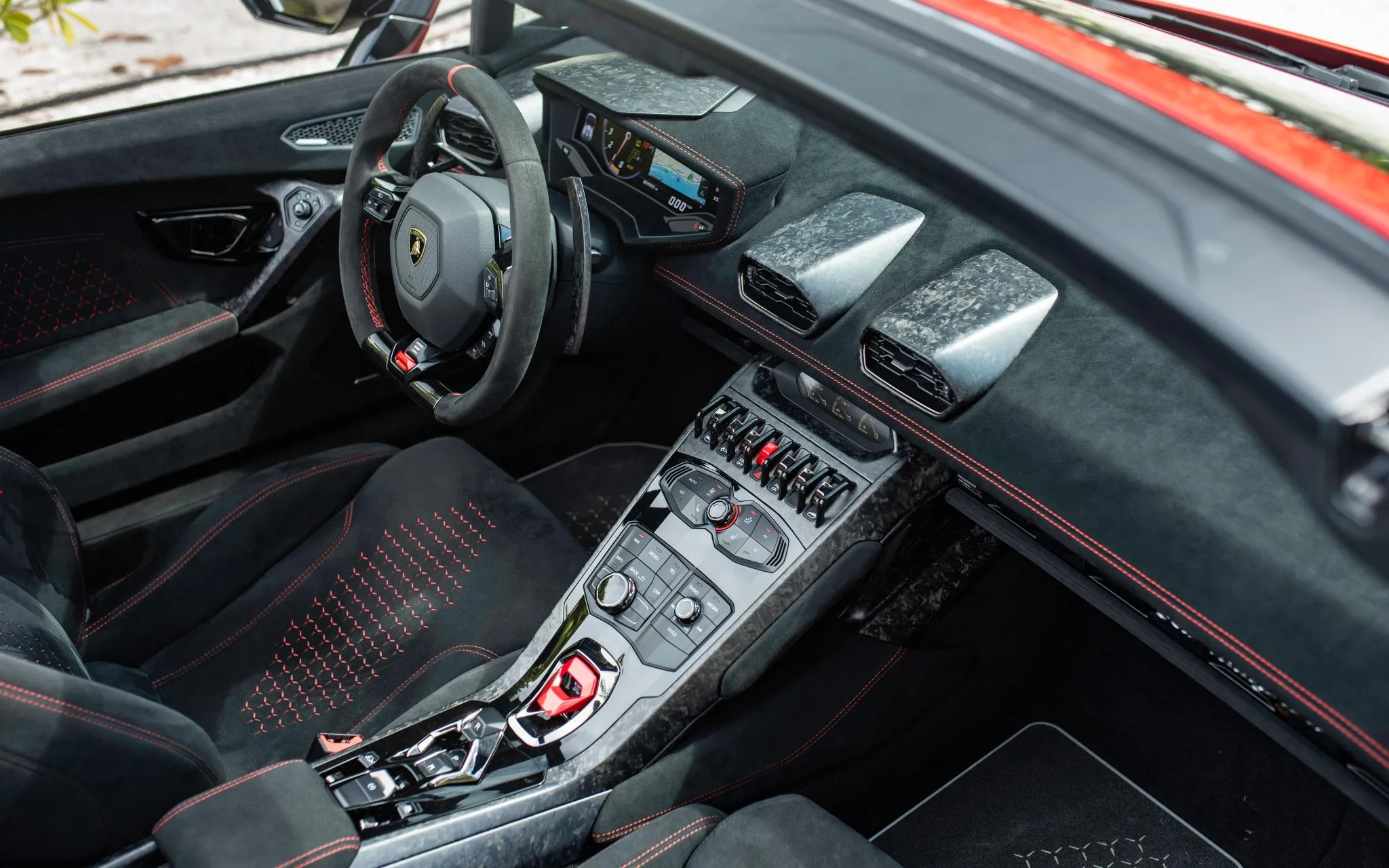Des interrupteurs à bascule pour les vitres et autres commandes aux perforations et rayures de couleur contrastante sur les sièges, en passant par le couvercle rabattable de style avion de chasse sur le bouton marche/arrêt, la Huracán ne laisse jamais oublier qu’on n’est pas seulement dans une voiture, mais dans une Lam-bor-ghi-ni. Il y a des inconvénients. Les sièges sont si étroits et durs que les ecchymoses sur les hanches deviennent visibles en une heure.