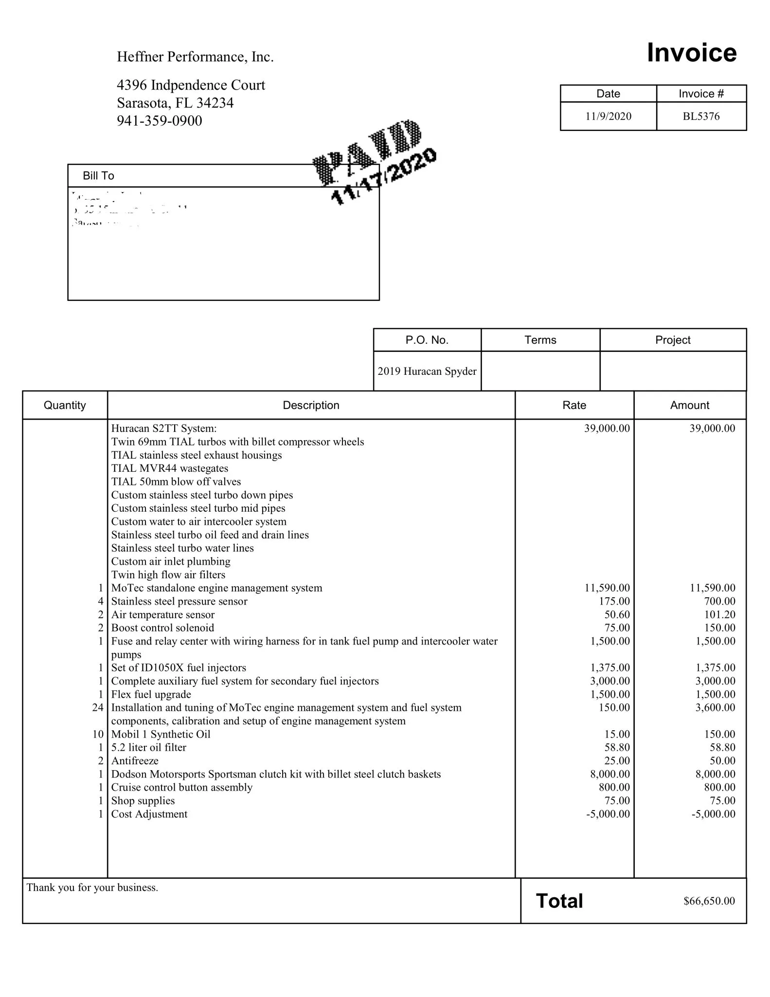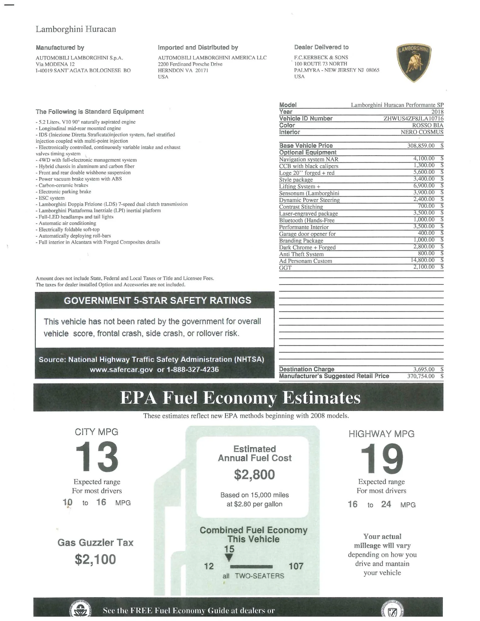 S’ajoute la direction dynamique Lamborghini, de freins en carbone-céramique, de jantes forgées Loge de 20 pouces, d’un système audio Lamborghini Sensonum, d’un système de navigation et de sièges chauffants, cette Huracan Performante modifiée n’affiche que 5.000 miles. Je suis resté songeur et bouche bée concernant les suspensions “magnétorhéologiques actives”... et le fait que la voiture a été réglée pour fonctionner avec du flex-fuel E85…