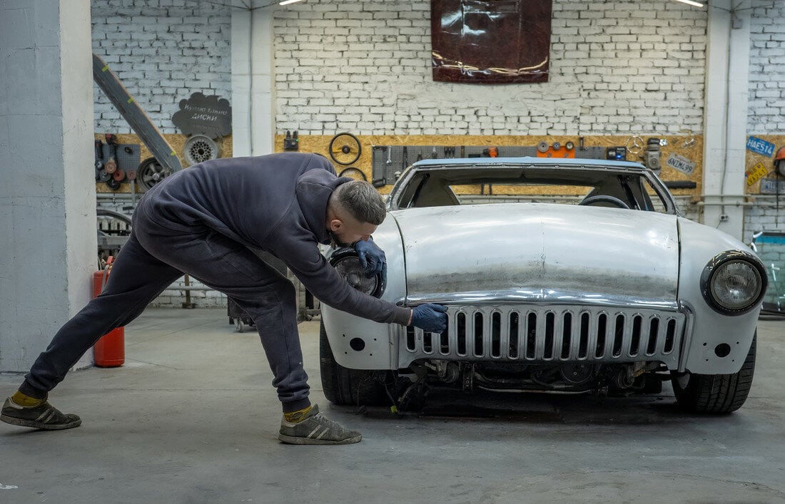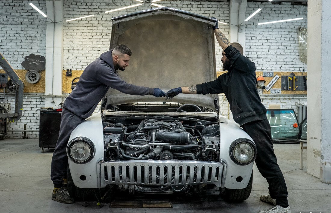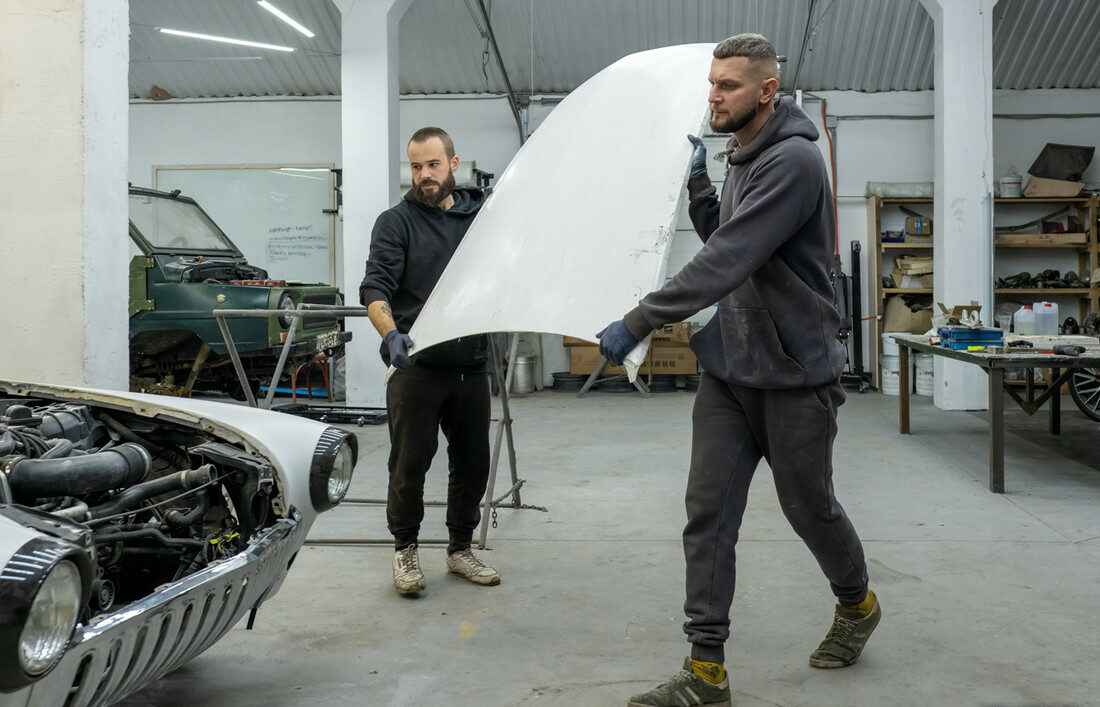 Alors, Alexander et son équipe ont réfléchi à ce qui pourrait être combiné avec quoi… Au début, ils ont pensé à la 24e Volga, mais ils ont décidé d’utiliser une épave de la classique GAZ-21. Les éléments d’ailes ont été modifiés sur base des arcs de roues d’origine de la Volga en les élargissant un peu et y intégrant des éléments de Lada Niva qui ont fière allure : l’écart par rapport aux jantes est de 1,5 cm. Le manque de portée de l’empattement a été corrigé.