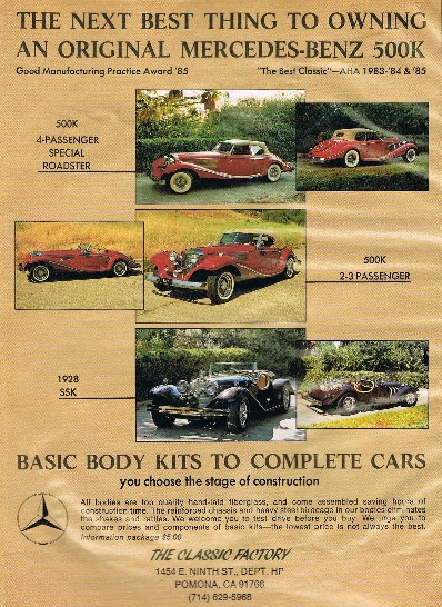 La réplique de 540K qui est en photos sur ce panneau, est la plus belle des répliques de ce modèle, parce que H.T.Price, le boss de Classic Factory, a eu la possibilité de réaliser un moulage de toutes les pièces constituant une authentique 540K qui était totalement démontée en vue d’une restauration.