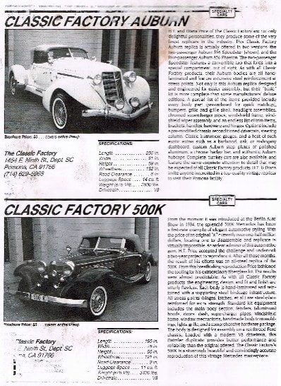 C’est en 1964 que la première réplique vit le jour sous la férule d’un certain Brook Stevens, un designer qui, œuvrant pour Studebacker, eut l’idée de créer la première “ancienne-neuve”…, la “Mercebacker”…, vite débaptisée et renommée : “Excalibur”… (photo des deux fils-frères Stevens et de leurs premières S1 Roadster et Phaéton ci-dessous).