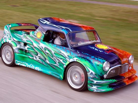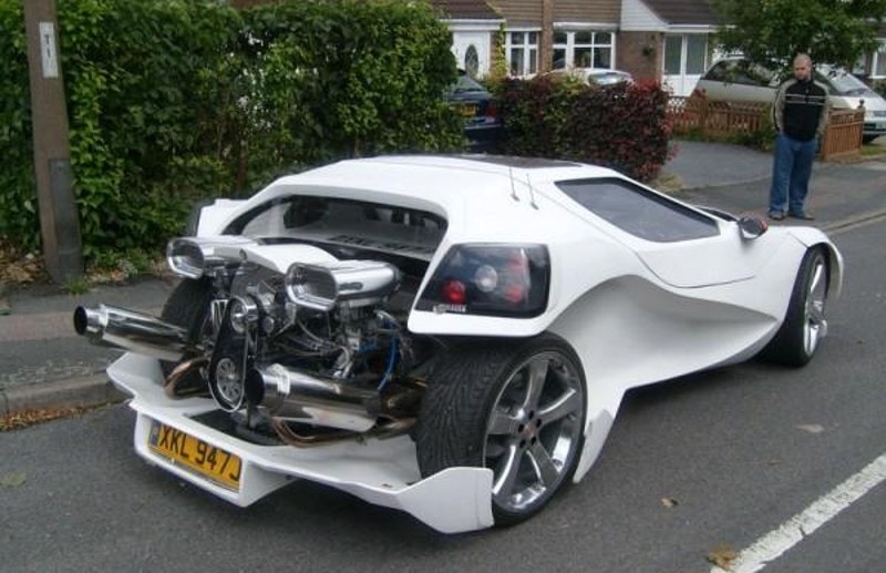 Relativement brouillonne question construction, assemblage et d’une ingénierie frisant le zéro absolu…, “la bête” utilisait un châssis de Studebacker Lark issu des stocks provenant de la faillite de cette firme, sectionné et mal ressoudé, sur lequel un V8 General-Motors était disposé 1 m en arrière de la position initiale, le tout habillé façon “confection chinoise” d’une demi carrosserie plastique non correctement ajustable… et de 4 feuilles d’aluminium formant le capot “vibrant” !