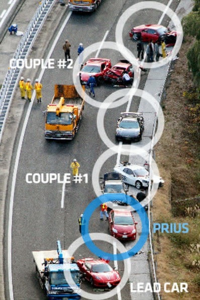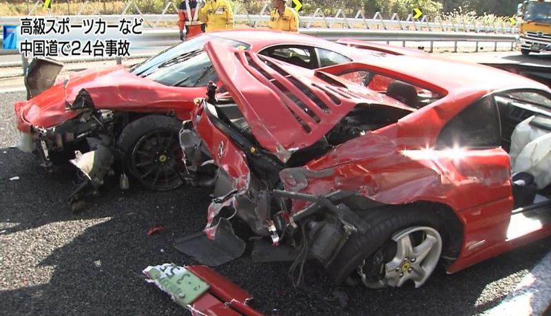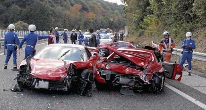 Une erreur de calcul assez simple de la part d’un industriel de 60 ans, originaire de Fukuoka, consistant à doser l’accélération de sa Ferrari F430 Scuderia sur une autoroute immaculée, sans nids de poule, sans casse-vitesse, par beau temps, avec une visibilité optimale et peu de trafic…, une autoroute limitée à 110km/h, tracée au milieu de paysages de rêves au Japon…, a conduit à une réaction en chaîne causant la destruction de 14 véhicules, dont huit Ferrari, trois Mercedes, une Lamborghini, une Skyline et une Prius qui était là au bon endroit mais au mauvais moment…