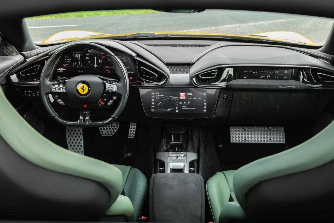 Bien que la 12 Cilindri partage une grande partie de sa suspension et de son matériel de freinage avec la 812, le châssis, composé d’extrusions et de pièces moulées en aluminium, est tout nouveau, avec un empattement plus court de 0,78 pouce et une rigidité en torsion supérieure de 15 %. Le châssis de la 12 Cilindri est supervisé par la dernière itération du système innovant de contrôle de la dynamique du véhicule de Ferrari, le Side Slip Control (SSC) 8.0, dont les éléments clés comprennent un capteur de mouvement du véhicule à six axes, ainsi que le système ABS Evo à freinage électrique qui a fait ses débuts sur la 296 GTB et ce que Ferrari appelle la version 2.0 du système d’estimation de l’adhérence de la 296 GTB. Ce qui permet à la voiture de déterminer les niveaux d’adhérence, même sur les roues qui sont dirigées, 10 % plus rapidement qu’auparavant. Cela vous fait sentir que tout ça coute un pont d’or à l’achat…