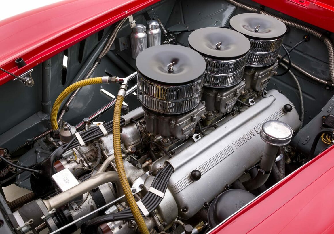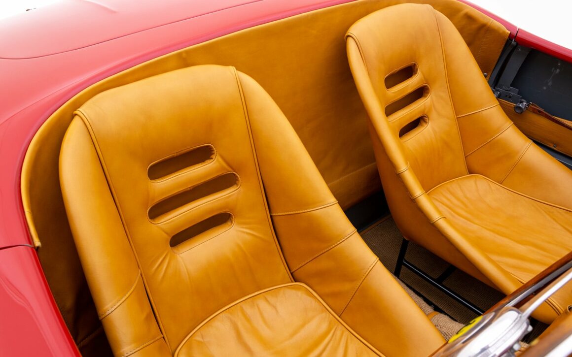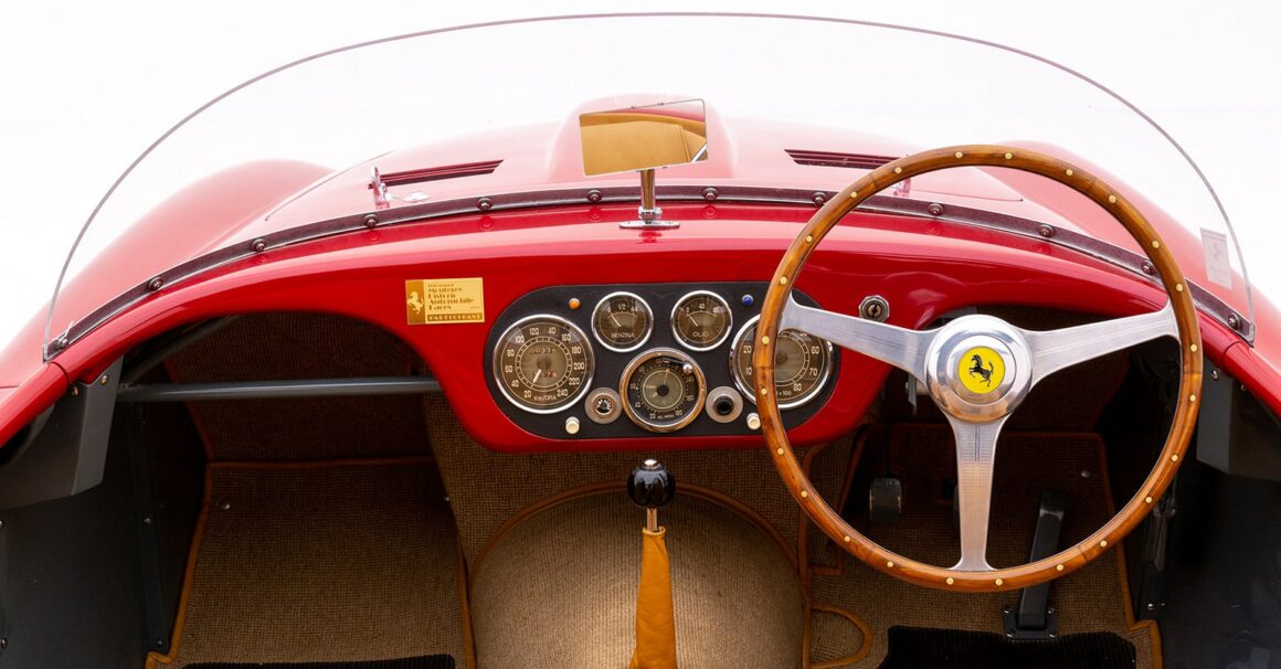Un réservoir de carburant de 120 litres avait été calculé pour les courses d’endurance, tout en maintenant le poids inférieur à 1.800 livres. Ce sont les variantes les plus puissantes de la 166 et, avec seulement 13 produites, elles sont très recherchées par les collectionneurs… Sur le sol des Mille Miglia, la 166 a gagné son surnom de “MM” et de riches gentlemen drivers aux USA faisaient la queue pour avoir la chance d’acheter des Ferrari 166 auprès de Chinetti.