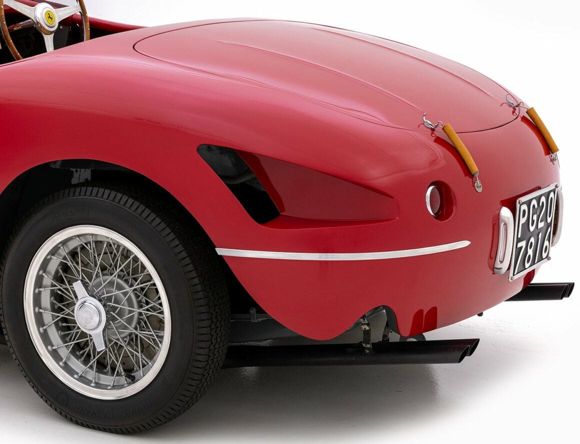 Malgré des chiffres de production relativement faibles, la 166 a amassé un total de 88 victoires entre 1948 et 1955, ce qui la place parmi les voitures de compétition les plus victorieuses de tous les temps. Là, j’avoue que je suis estomaqué… Cette Ferrarri est numérotée S/N 0278 M c’est la 6ème des treize 166 MM/53 produites et équipée d’une carrosserie “araignée” très légère (et râpeuse) par Vignale, l’un des carrossiers préférés d’Enzo des premiers jours.