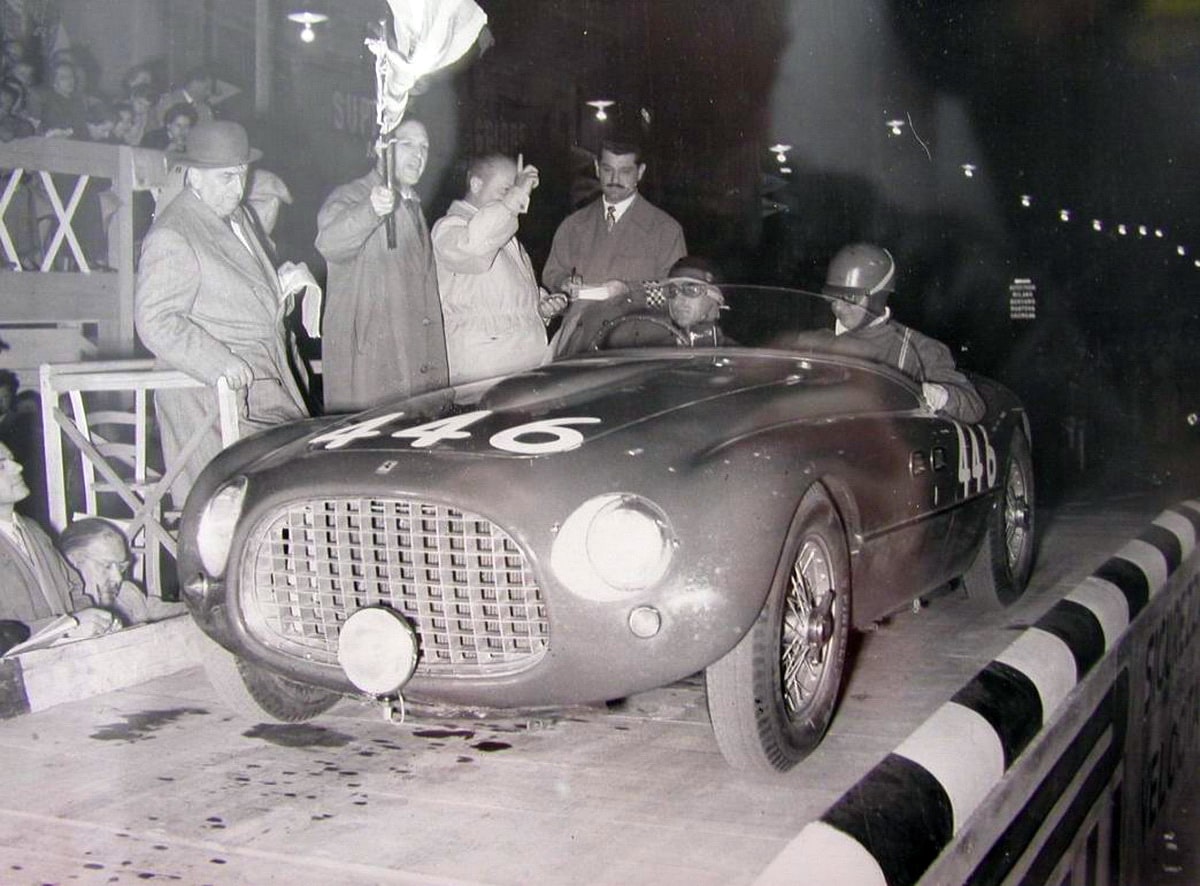 La 166 MM est la seule voiture à avoir remporté les Mille Miglia, la Targa Florio et les 24 Heures du Mans. Luigi Chinetti a conduit 22 heures sur les 24 du Mans pour : 1° Ramener sa 166 de 2 litres “à la maison” devant de nombreuses machines beaucoup plus puissantes et 2° Offrir à Ferrari sa première victoire sur le circuit de la Sarthe. Il y a un 3° : Une semaine plus tard, une autre 166MM a remporté la course de 24 heures à Spa Francorchamps en Belgique…