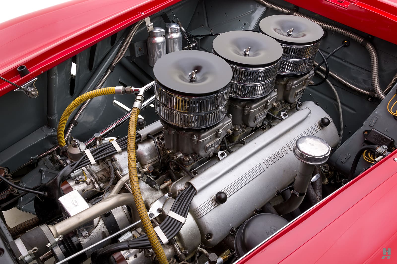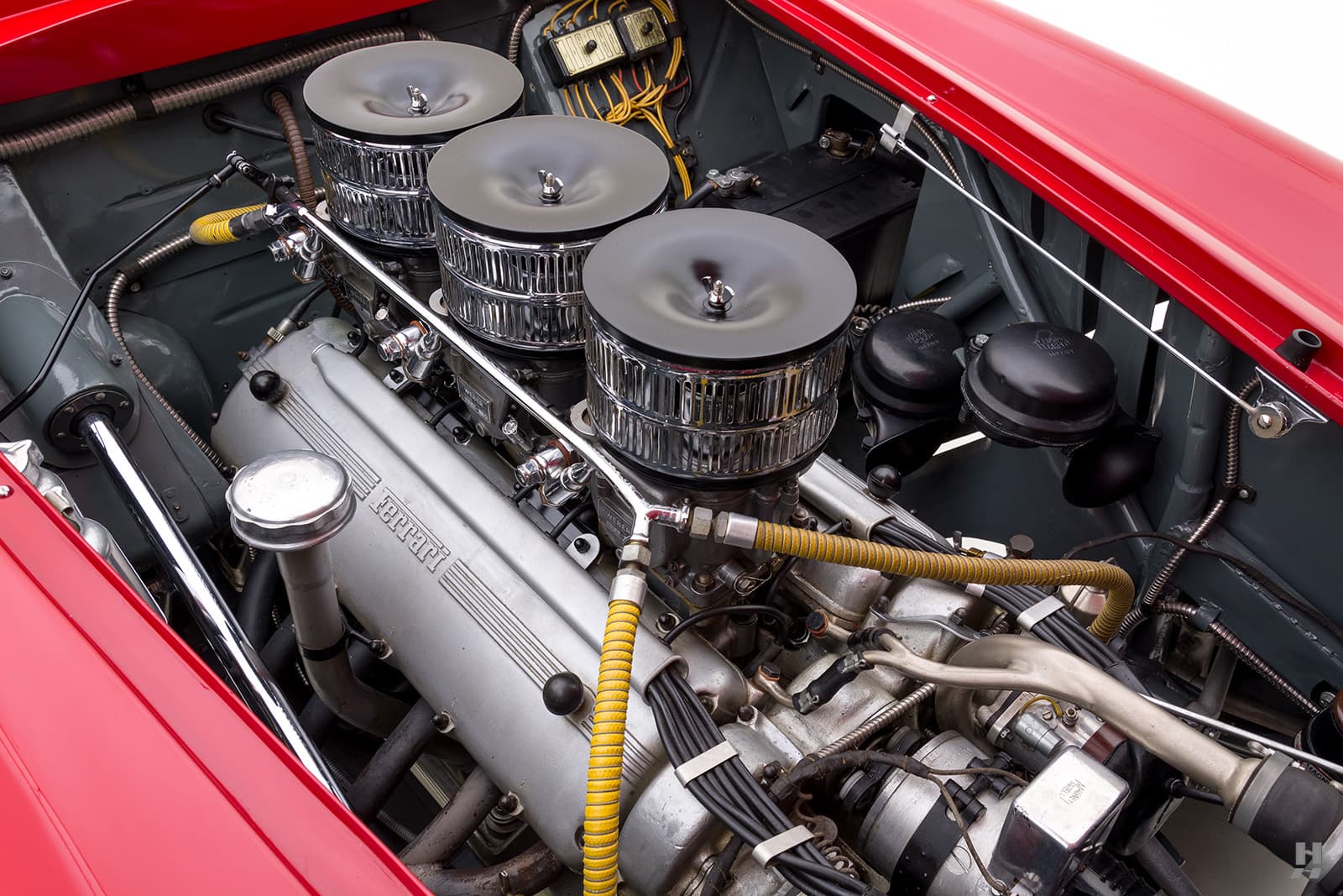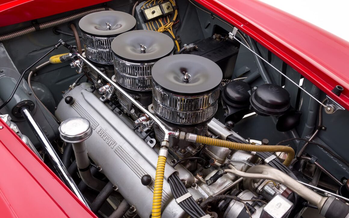 Au fil des ans elle reste en excellent état. Une inspection a révélé que les numéros de châssis, de moteur, de boîte de compétition à 5 vitesses et d’essieu arrière correspondent à ceux des feuilles de construction d’usine. La voiture a conservé le trio correct de carburateurs Weber 36 IF 40, le réservoir de carburant de 120 litres, l’électricité Magnetti Marelli appropriée, les instruments Veglia et les authentiques phares Marchal Optilux.