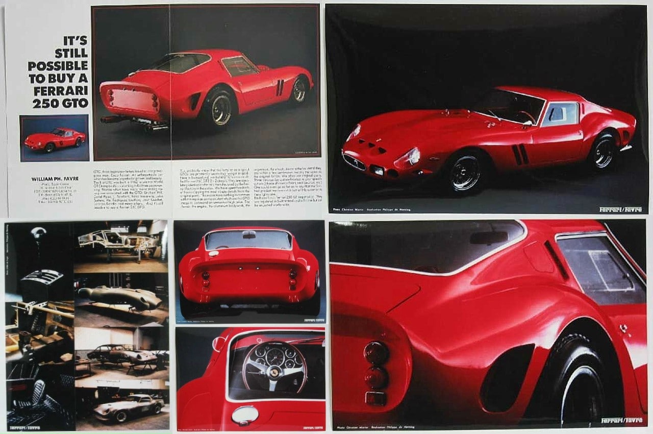 « II est encore possible d’acheter une Ferrari 250 GTO », affirmait William Favre dans la brochure qui présentait la série limitée de répliques qu’il se proposait de commercialiser pour l’équivalent de 150.000 $ alors que les originales, dont 39 exemplaires seulement avaient été construits entre 1962 et 1964 (et dont tous les numéros de châssis sont repris dans un livre signé Pourret, qui sert de bible en la matière)…, se négociaient en 1984/1985 aux alentours des 450.000 $ (en 1980 une authentique Ferrari 250GTO s’achetait 20.000 dollars… et en 20018, la même authentique Ferrari 250GTO a été vendue 70.000.000 d’€uros !)…