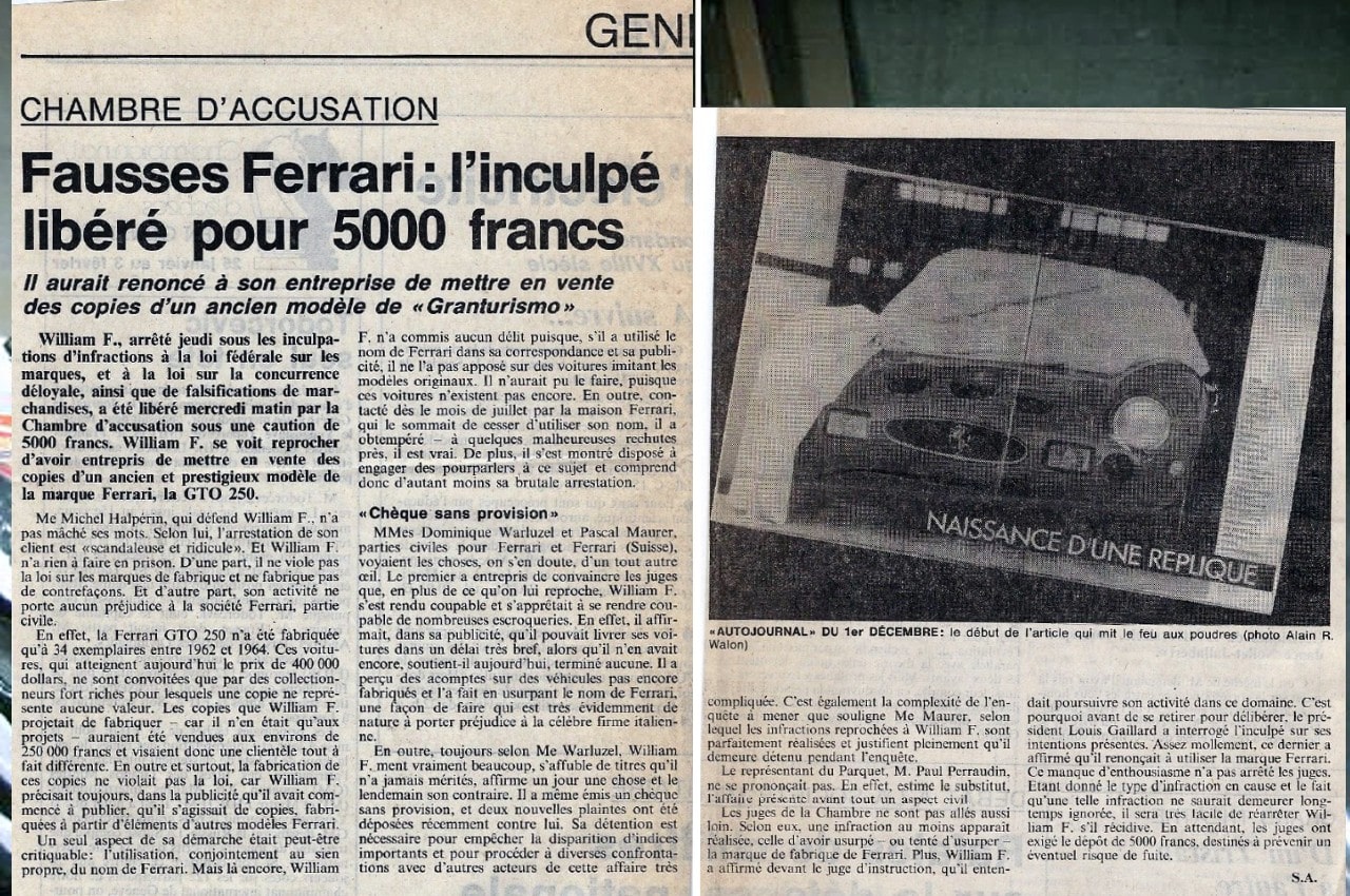 1) Nulle action n’a été entreprise simultanément à Favre contre les fabricants de répliques de 246 GT (Karma et Kellmark), de 250 LM, de Daytona et de TestaRossa (les procès contre les « répliqueurs » de Daytona viendront plusieurs années plus tard)