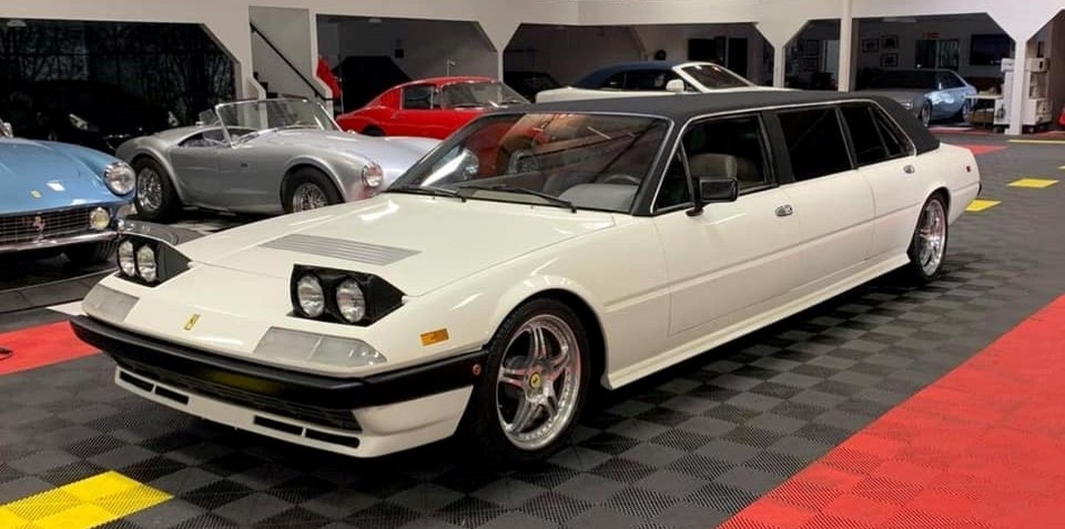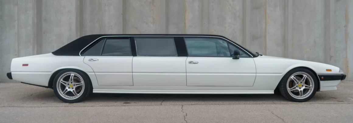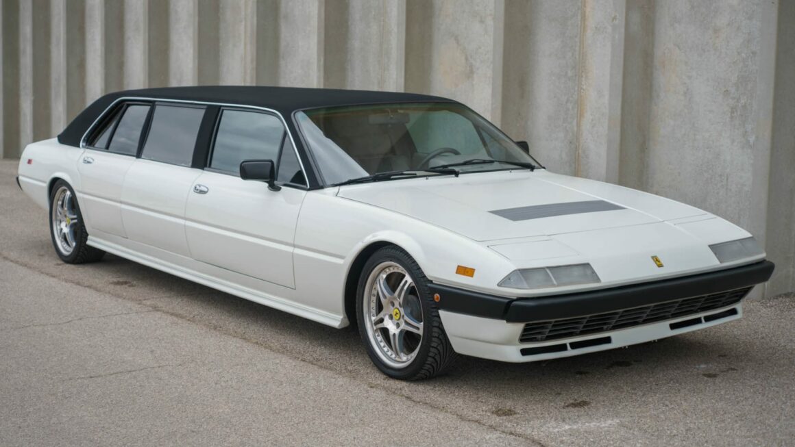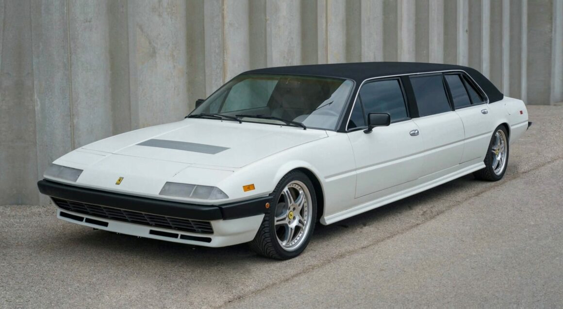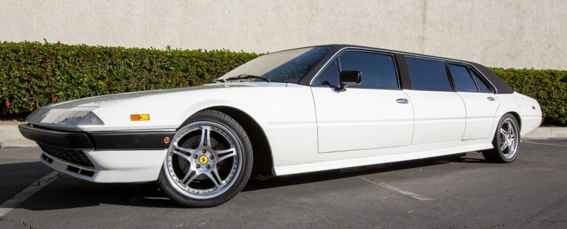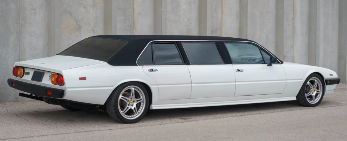 La Ferrari 400 est arrivée en 1976 en tant qu’évolution directe de la 365 GT4 2+2 sortante. Les deux voitures partageaient le même châssis, ainsi que le même moteur Tipo F101 Colombo V-12 sous le capot avant. Pour l’introduction de la 400, Ferrari a poussé le moteur à 4L8, contre 4L4 dans la 365. C’était également la première Ferrari mise en vente avec une boîte automatique 3 rapports Turbo Hydramatic 400 fournie par General Motors. En 1979 l’injection va remplacer les carburateurs, les voitures adoptant alors le surnom 400i. Le travail de conversion Limo a été effectué par G & K Automotive à Anaheim, en Californie, en 1990, selon des plans fournis par Pininfarina. Cela pourrait expliquer pourquoi la construction a coûté environ 200.000 $ en plus de l’auto. Cette Ferrari vintage avait été considérablement étirée, la zone des sièges arrière contenant deux ensembles de fauteuils dirigés l’un vers l’autre. Les aménagements intérieurs n’ont pas exactement été reconstruits selon les normes de qualité de Ferrari, mais le propriétaire n’était pas un vrai Tifosi fanatique. La peinture blanche brillante lui a semblé appropriée sur une Ferrari de cette époque,