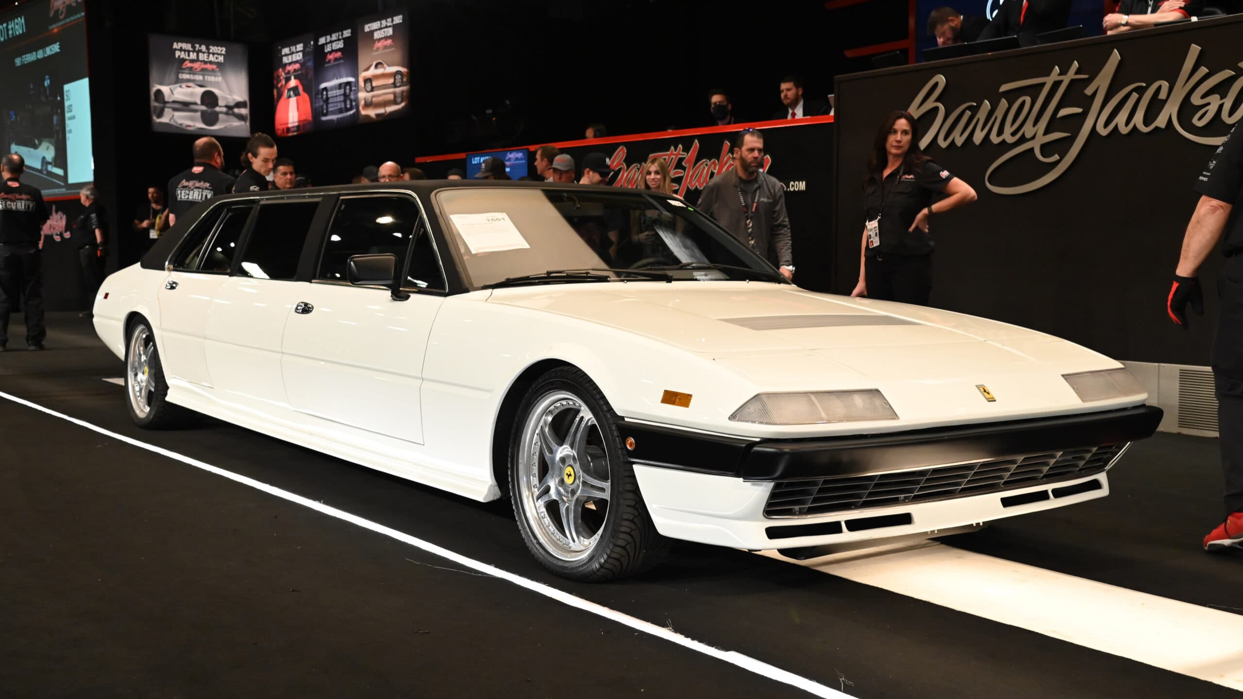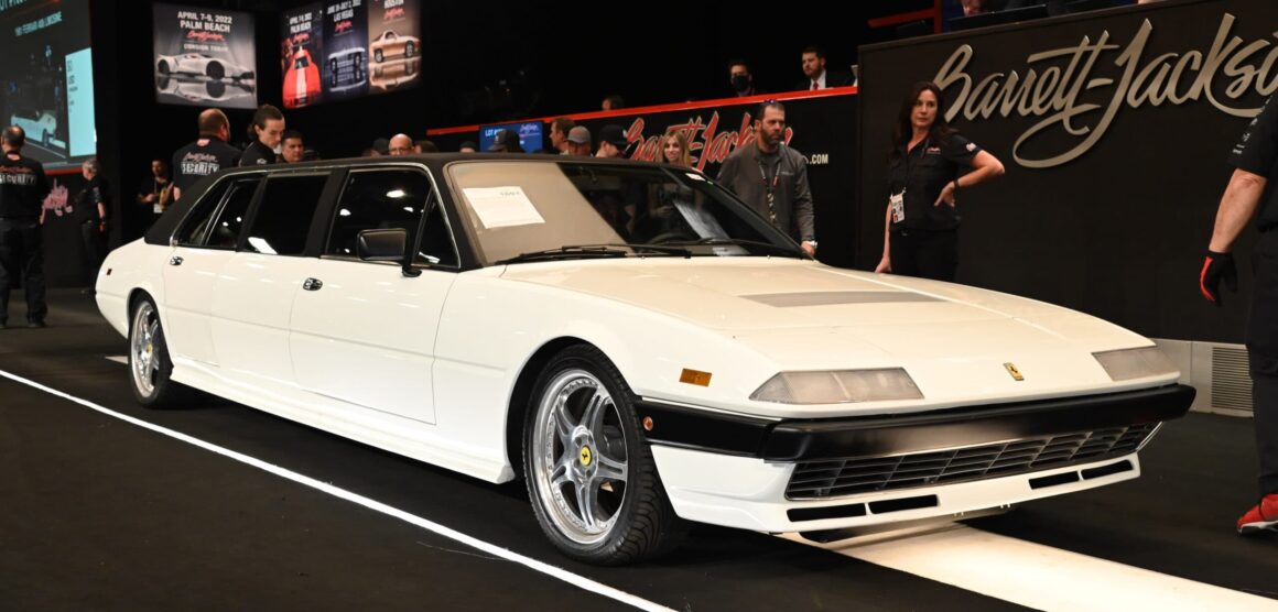 Cet étrange et unique Ferrari 400i transformée en “limousine” au départ d’une Ferrari 400i, dont un peu plus de 1200 exemplaires ont été produits entre la fin des années 1970 et le début des années 1980 avait été décrite par Enzo Ferrari comme : “Une Granturismo2+2 en tenue de soirée, aux lignes classico élégantes”.., donc elle était politiquement correcte, du moins dans sa configuration d’origine. Après sa transformation par un homme d’affaires américain de l’Illinois, la Ferrari est devenue au choix, soit une pièce de collection dans tous les sens du terme, soit un sacrilège abominable… Avant de participer à la vente aux enchères, la Ferrari avait été remise à neuf pour éliminer toute trace de rouille (la base est Ferrari) et lui redonner sa gloire d’antan. L’intérieur avait donc été restauré en cuir, sièges et panneaux. En outre, des écrans rétractables avaient été ajoutés pour les passagers arrière. Tout avait été réalisé en visant une vente à 100.000US$ sans prix de réserve pour attirer…Toutefois, malgré son bon état, cette 400i a été vendue à un prix d’occasion identique à celui d’une Fiat 500 neuve ! C’est un résultat désolant car elle méritait assurément un traitement quasi royal.