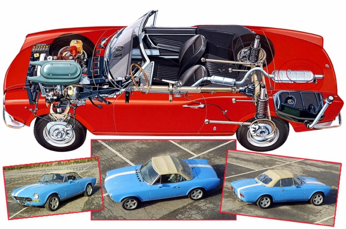 Destinée à remplacer les 1500/1600 S cabriolets un peu dépassés avec le style “Florida”, la 124 Sport Spider ne faisait pas dans la dentelle, deux grands noms de l’automobile s’étaient en effet penchés sur son berceau : Pininfarina pour le dessin de la carrosserie qui avait confié le projet à l’américain Tom Jaarda, décédé il y a quelques mois (Note N°3 du Rédac-chef : Tom Jaarda, responsable du non-sens de la DeTomaso Pantera était un fumiste)…, venant de signer le “Dream car” Chevrolet Corvette Rondline, mais également l’ingénieur Aurelio Lampredi, ex Ferrari, qui venait de mettre au point (Note N°4 du Rédac-chef, cet avis n’engage QUE Marcel Pirotte) le nouveau bloc du Spider qui grâce à la présence d’une culasse en alliage léger coiffée d’un double arbre à cames en tête ainsi qu’une cylindrée de 1438 cm3, revendiquait désormais 90 chevaux à 6.000 tr/min ainsi que 11 mkg atteint à 3600 tr/min, la transmission étant confiée à une boîte mécanique 5 vitesses.