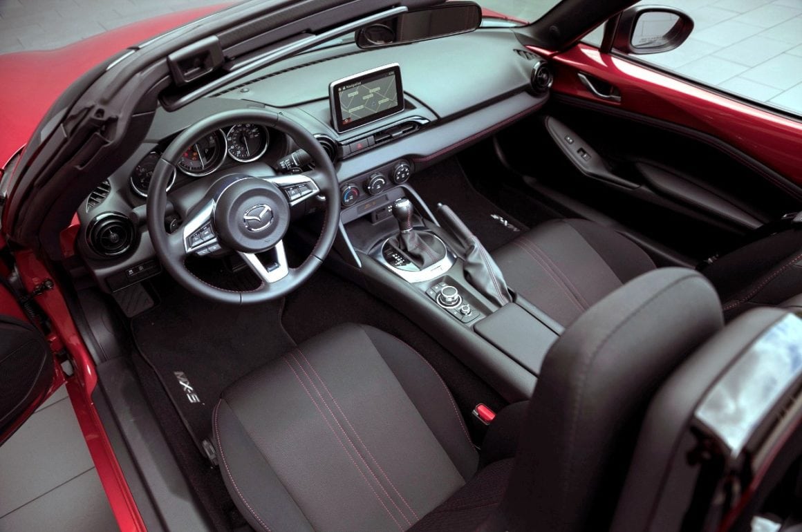 Moyennant un supplément de 2.500 €, cette MX-5 se la joue en tenue de soirée avec un mécanisme à toit rigide imaginé par Webasto qui se replie en un peu plus de 13 s grâce à une cinématique complexe mais remarquable dans l’emplacement dévolu à la capote.